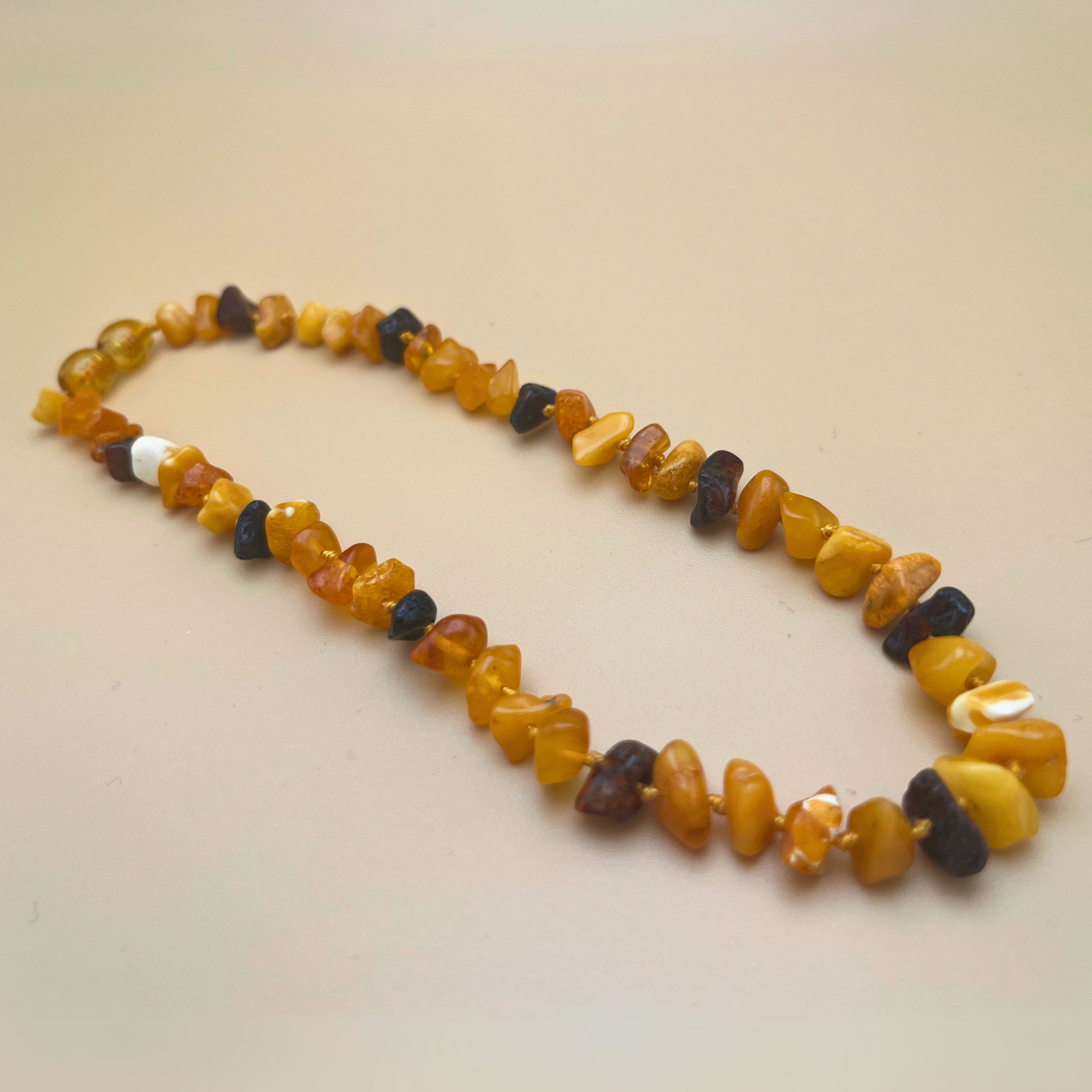 This warm and colorful baby necklace features natural amber in a beautiful mix of tones – milky white, golden honey, deep cognac, and even hints of cherry red. The beads are softly rounded, organically shaped, and each one has its own glow and character.