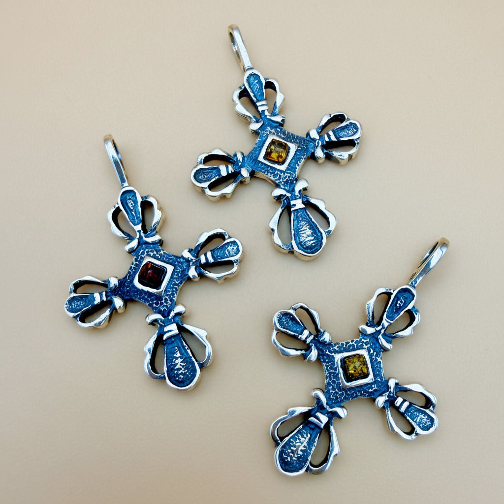 Organic Amber Cross Pendant with Silver Bail