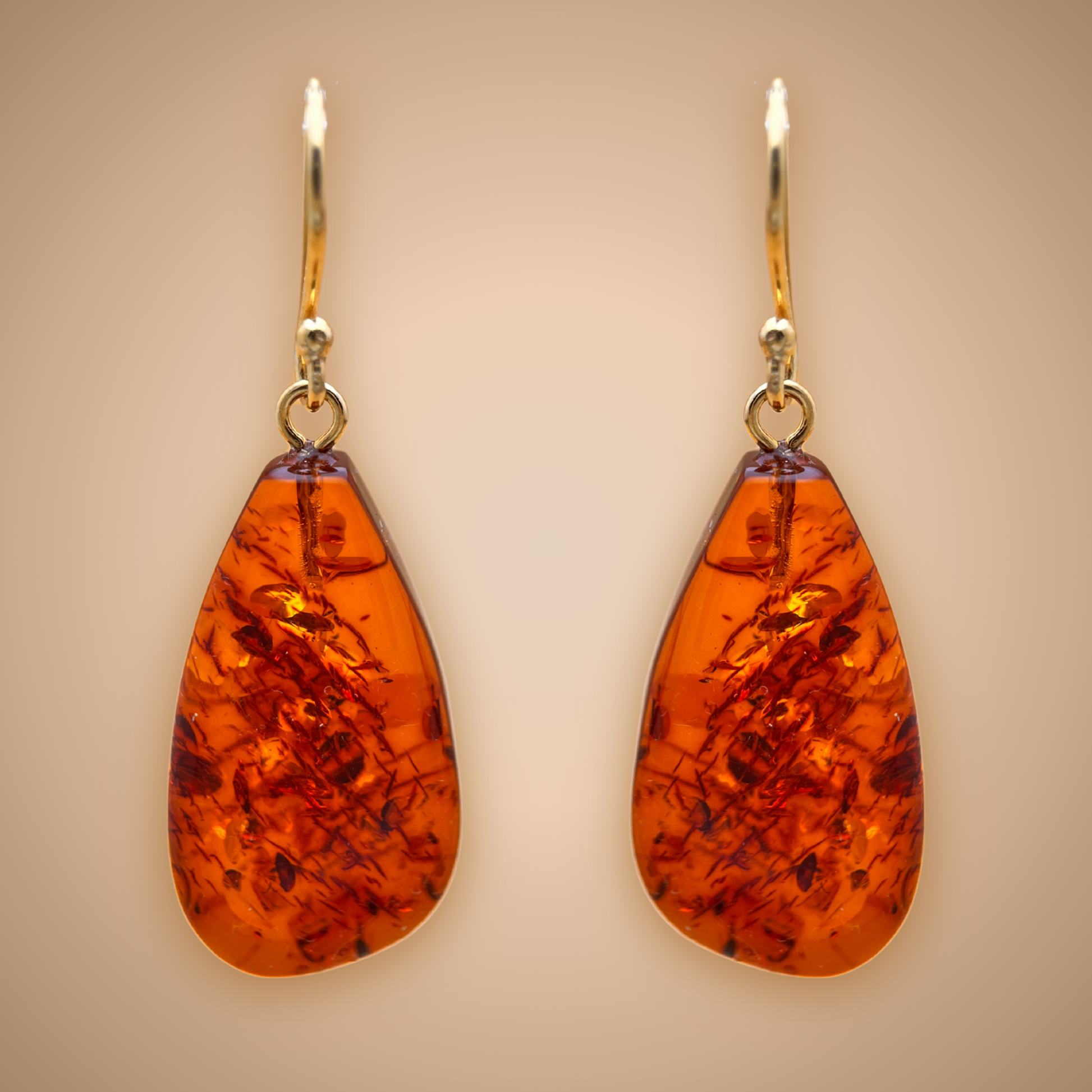 A striking pair of drop earrings made with deep cognac amber, showcasing natural internal crackling that creates beautiful reflections and depth within the stone. Each amber drop is carefully selected for its rich tone and organic detail, making every pair subtly unique.