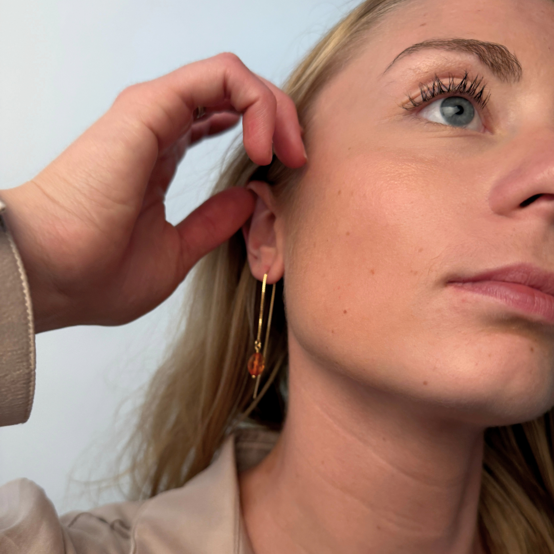At one end hangs a faceted amber bead in clear light cognac, carefully cut to catch and reflect the light beautifully with every movement. The facets bring extra brilliance and sparkle to the piece, making it stand out while remaining light and effortless to wear.