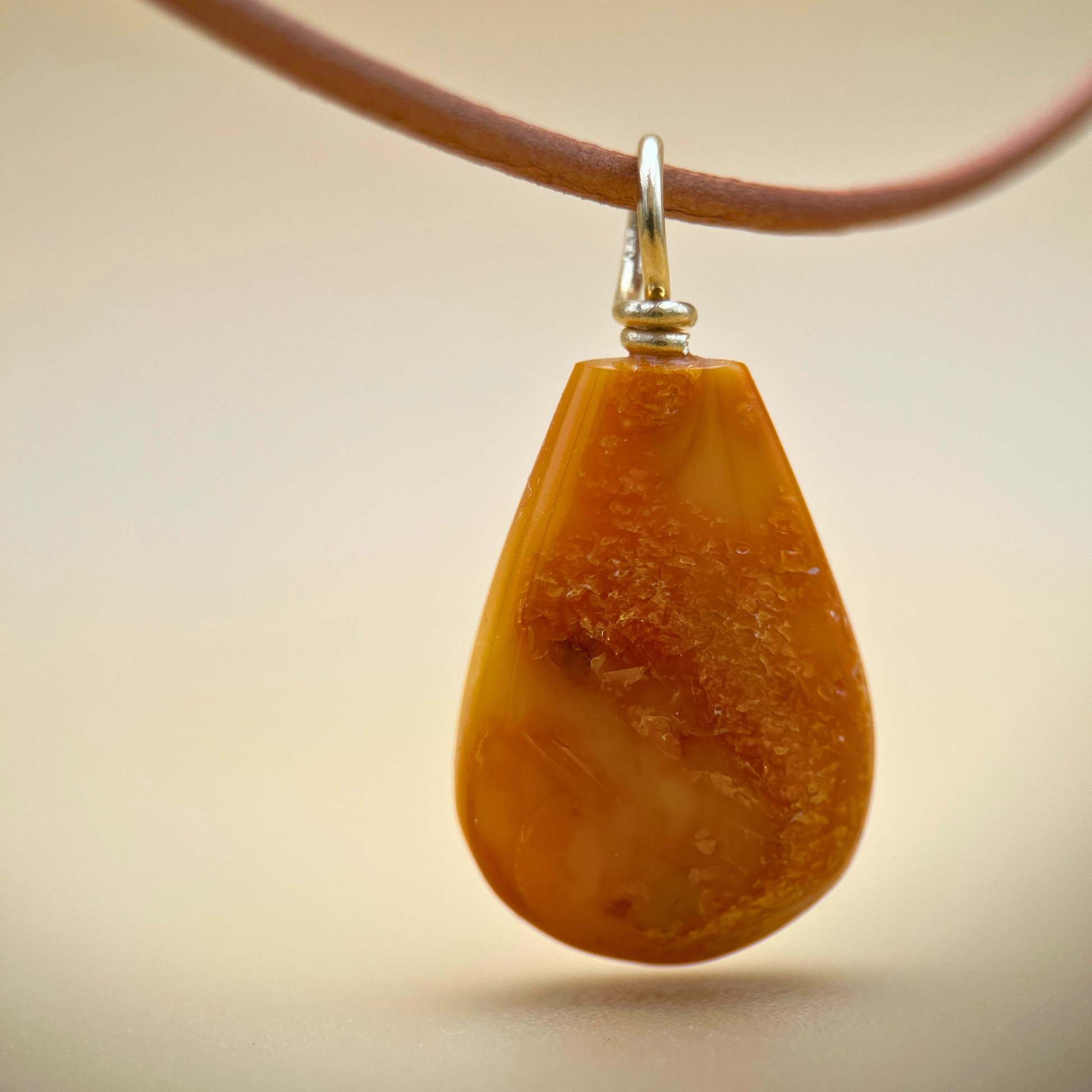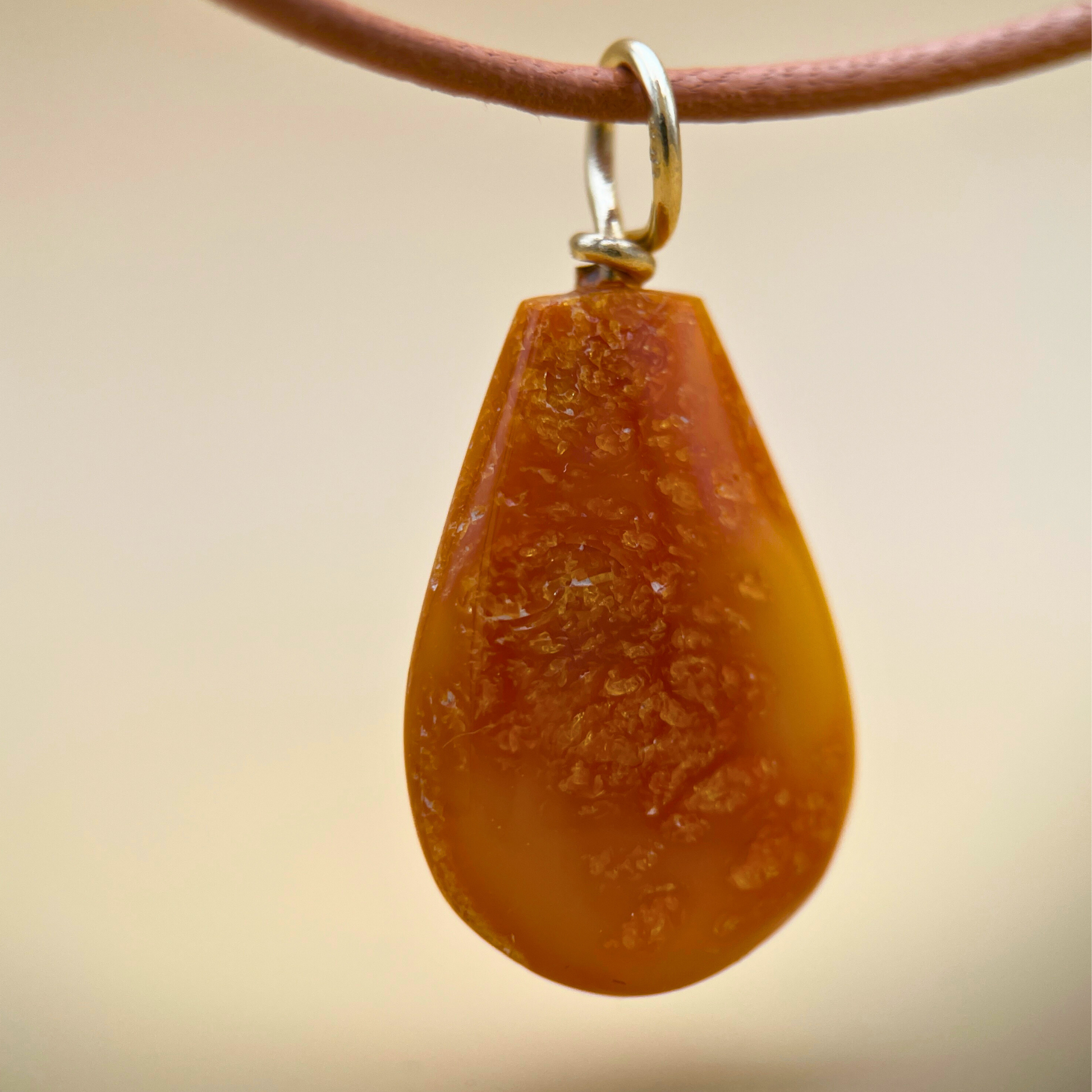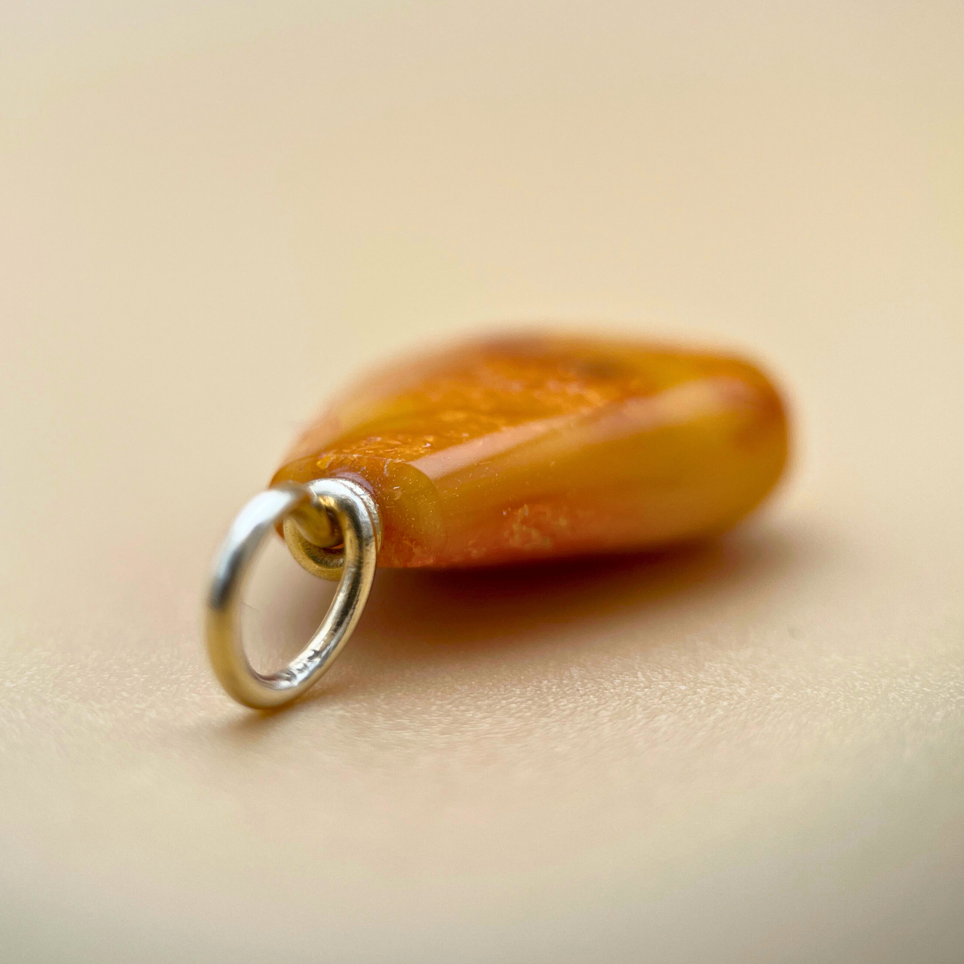 Set with a hand-turned solid 14 karat gold bail, this pendant embodies our commitment to quality and detail. The bail fits chains up to 5 mm in diameter and adds a refined contrast to the softly shaped amber. With a total length of just over 3 cm and a weight of 2.1 grams, it's light, elegant, and full of presence.