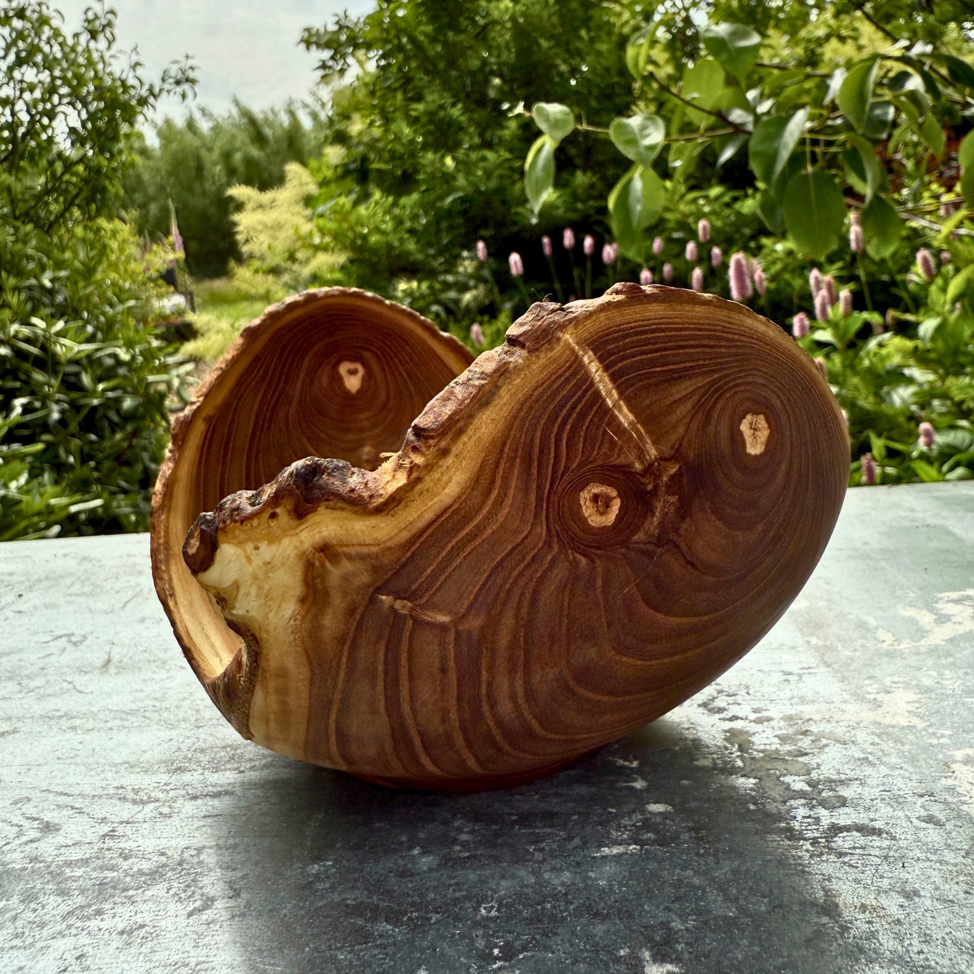 The tray is carved from a naturally curved branch, visible in the organic line of the grain. A small indentation on the outer surface is formed by the slightly softer pale heartwood – a beautiful natural feature that adds both texture and depth.