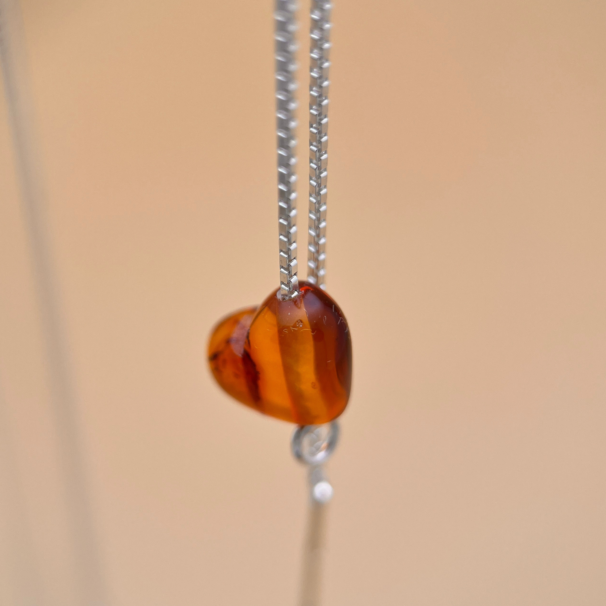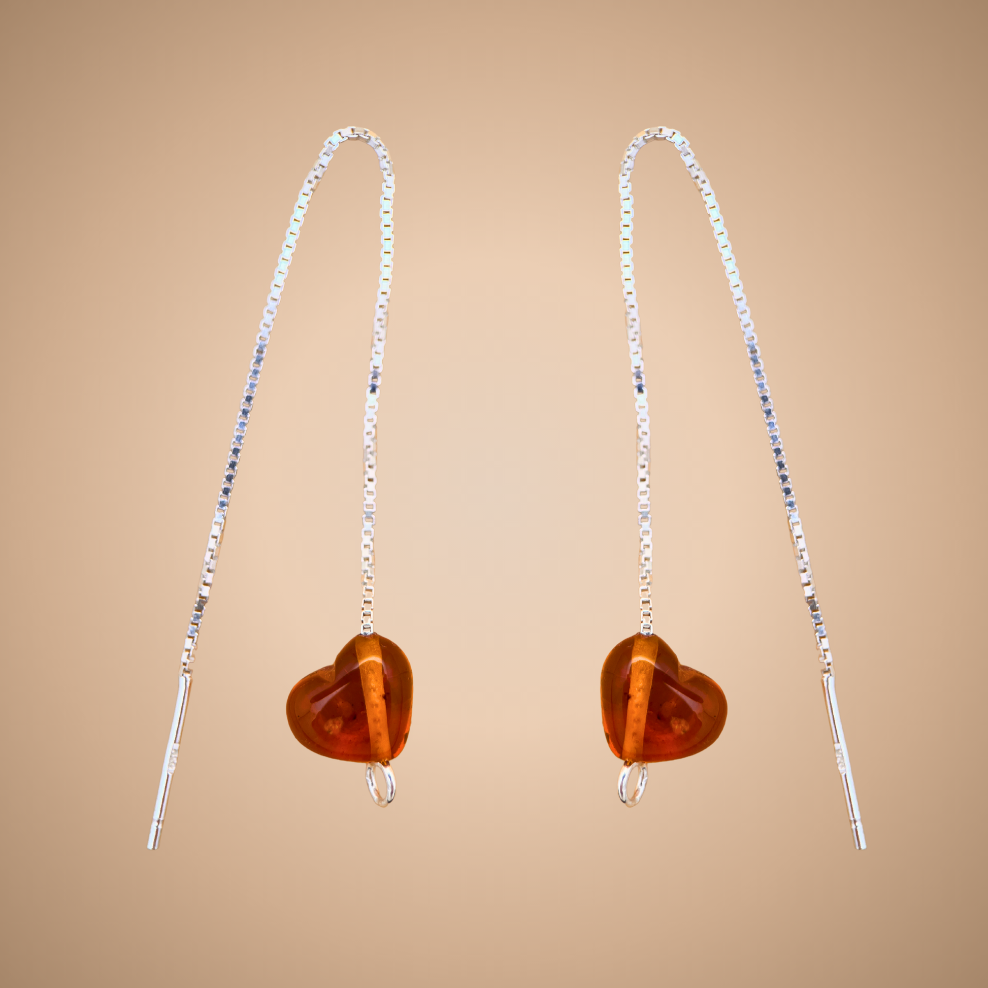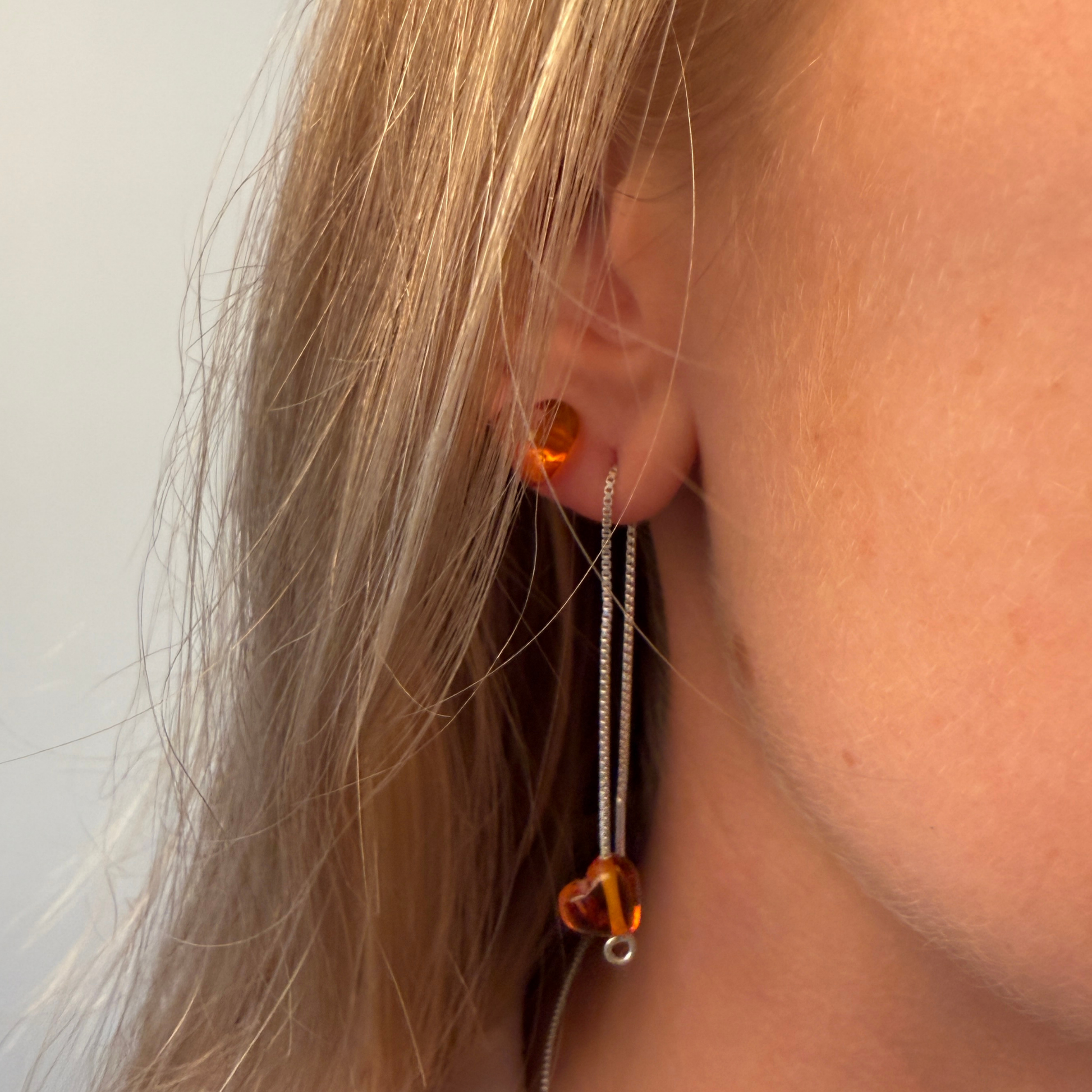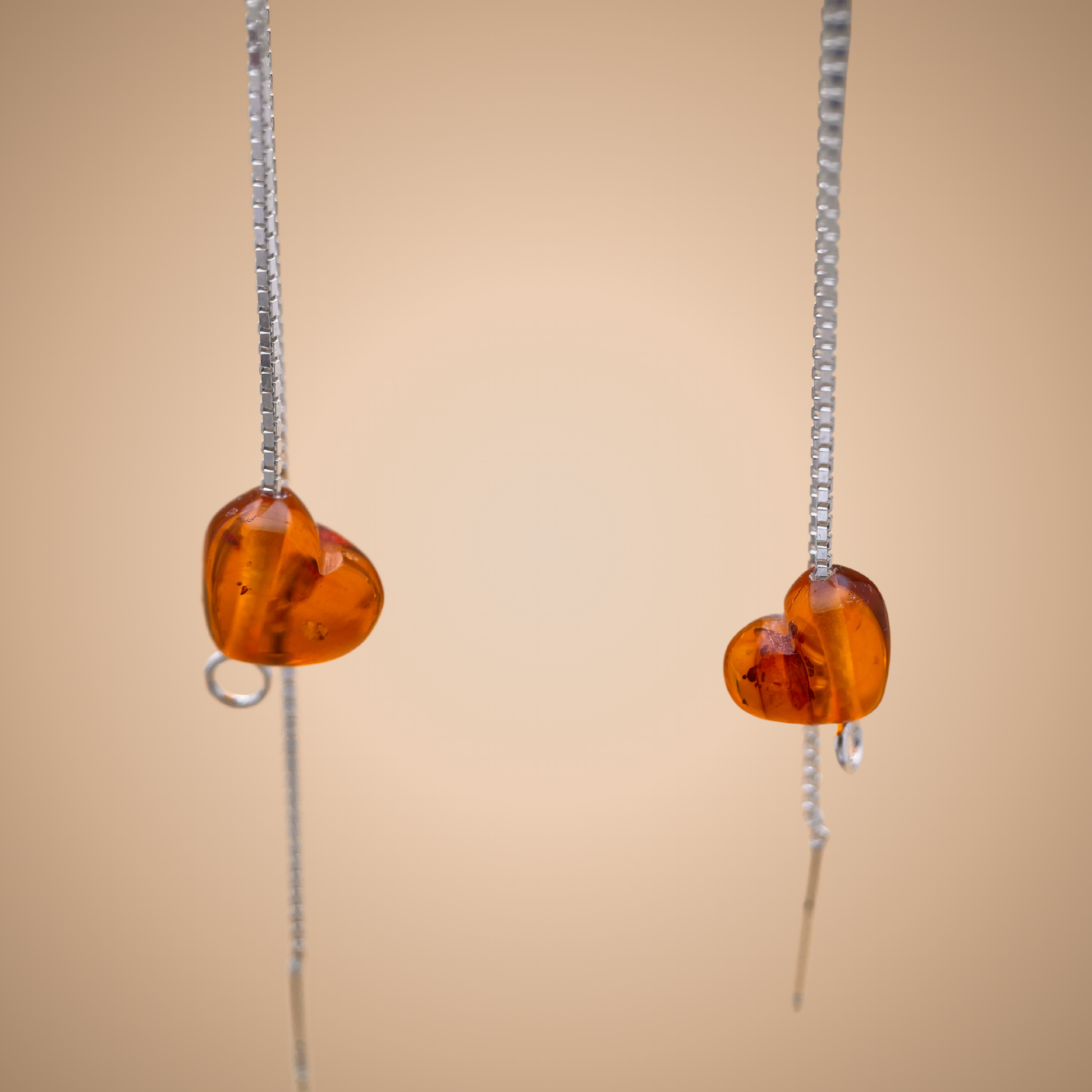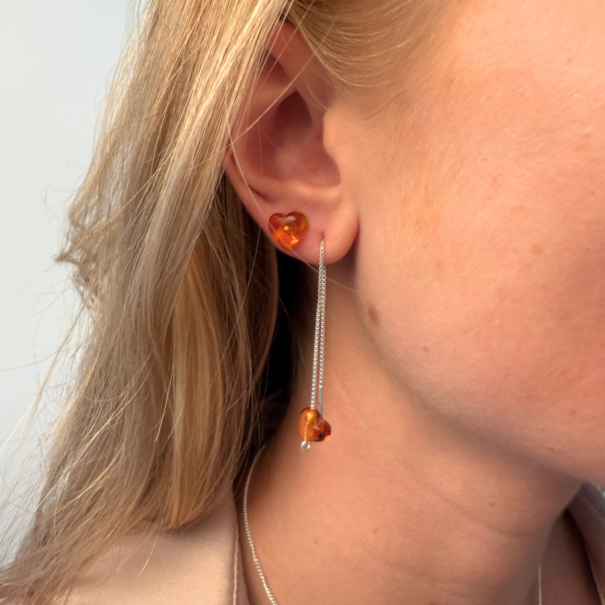 I den ene ende af hver kæde hænger et lyst cognac-ravhjerte , vinklet let skævt for at skabe en legende og organisk følelse . Den varme, klare tone i ravfarvet fanger lyset smukt, mens øreringene svajer og tilføjer en naturlig gylden glød til dit look.