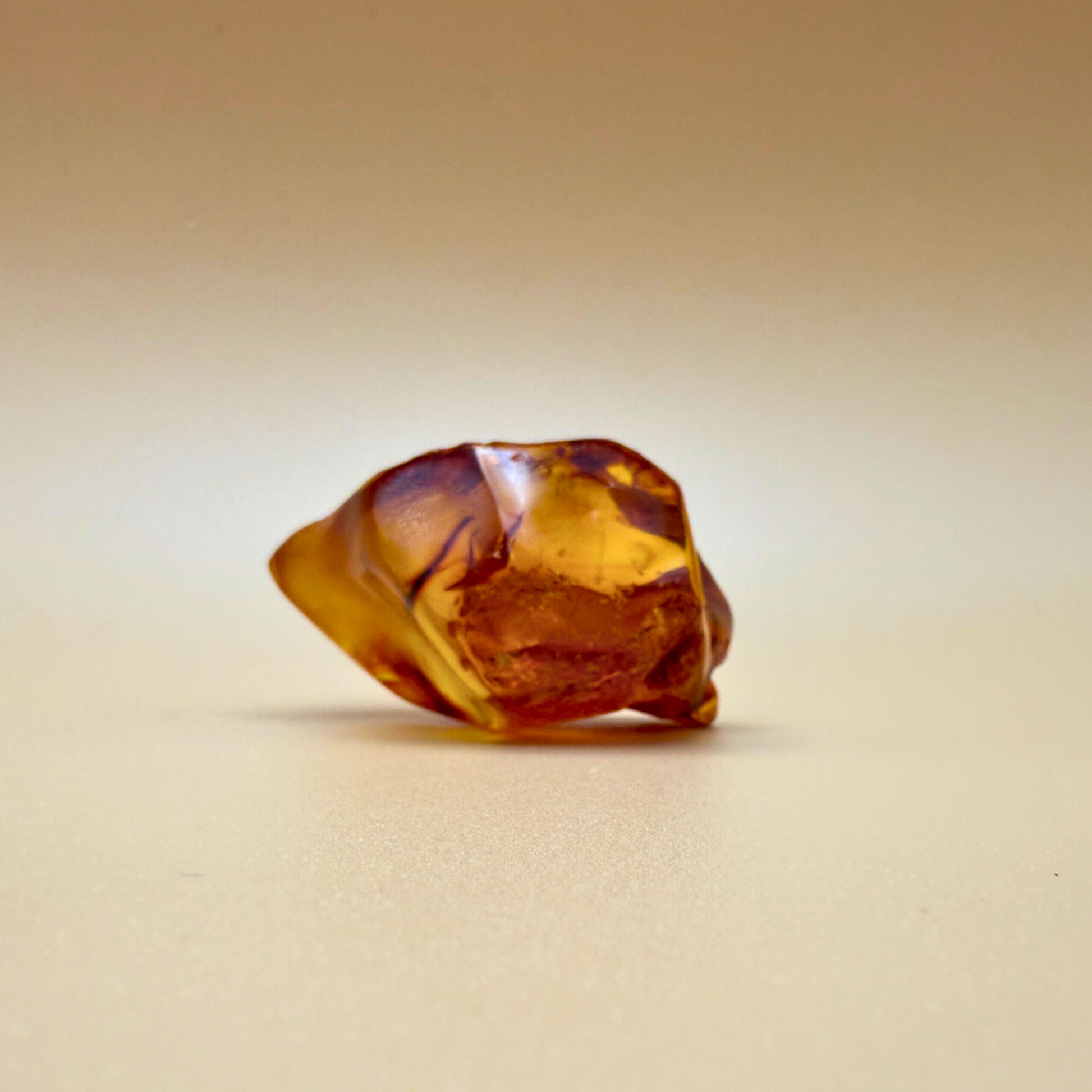 Den lette cognac-tone er rig og transparent med fine organiske indeslutninger – herunder hvad der ligner et blad eller et plantefragment , der hænger op som et fossiliseret øjeblik i tiden.