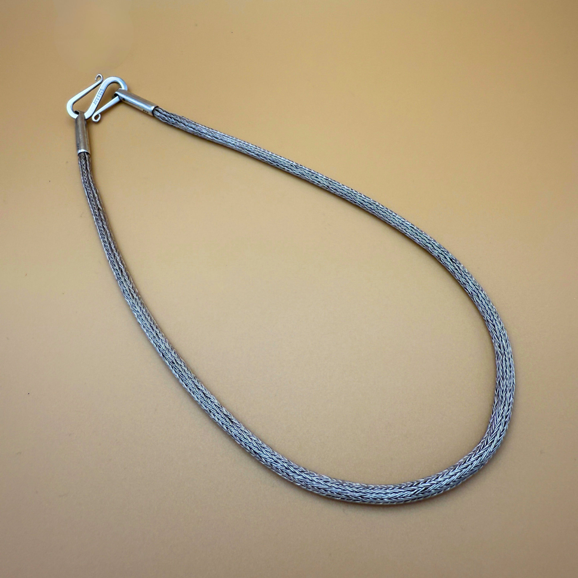 Du kan lære mere om håndstrikketeknikken bag dette design i vores blogindlæg om håndlavede sølvkæder.
