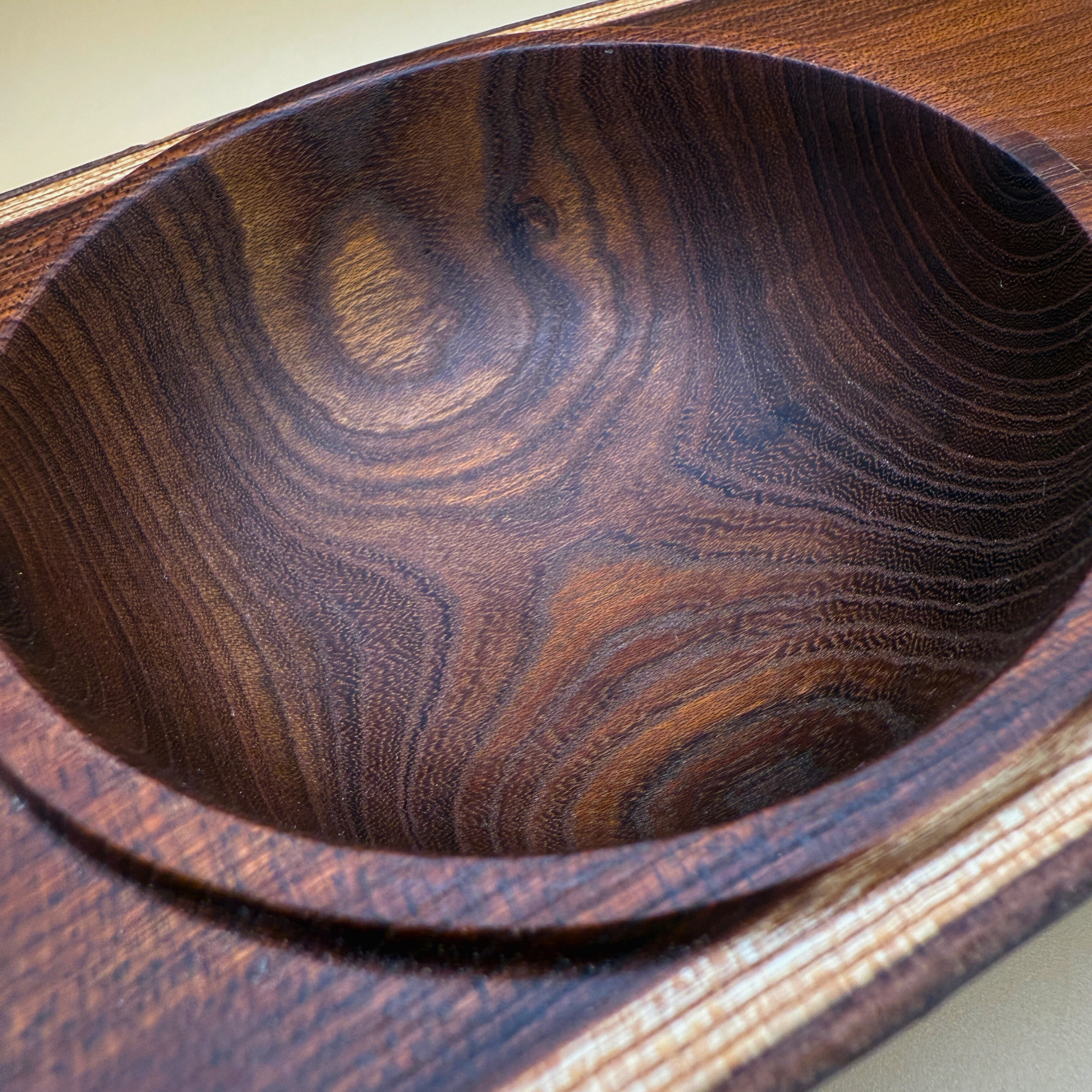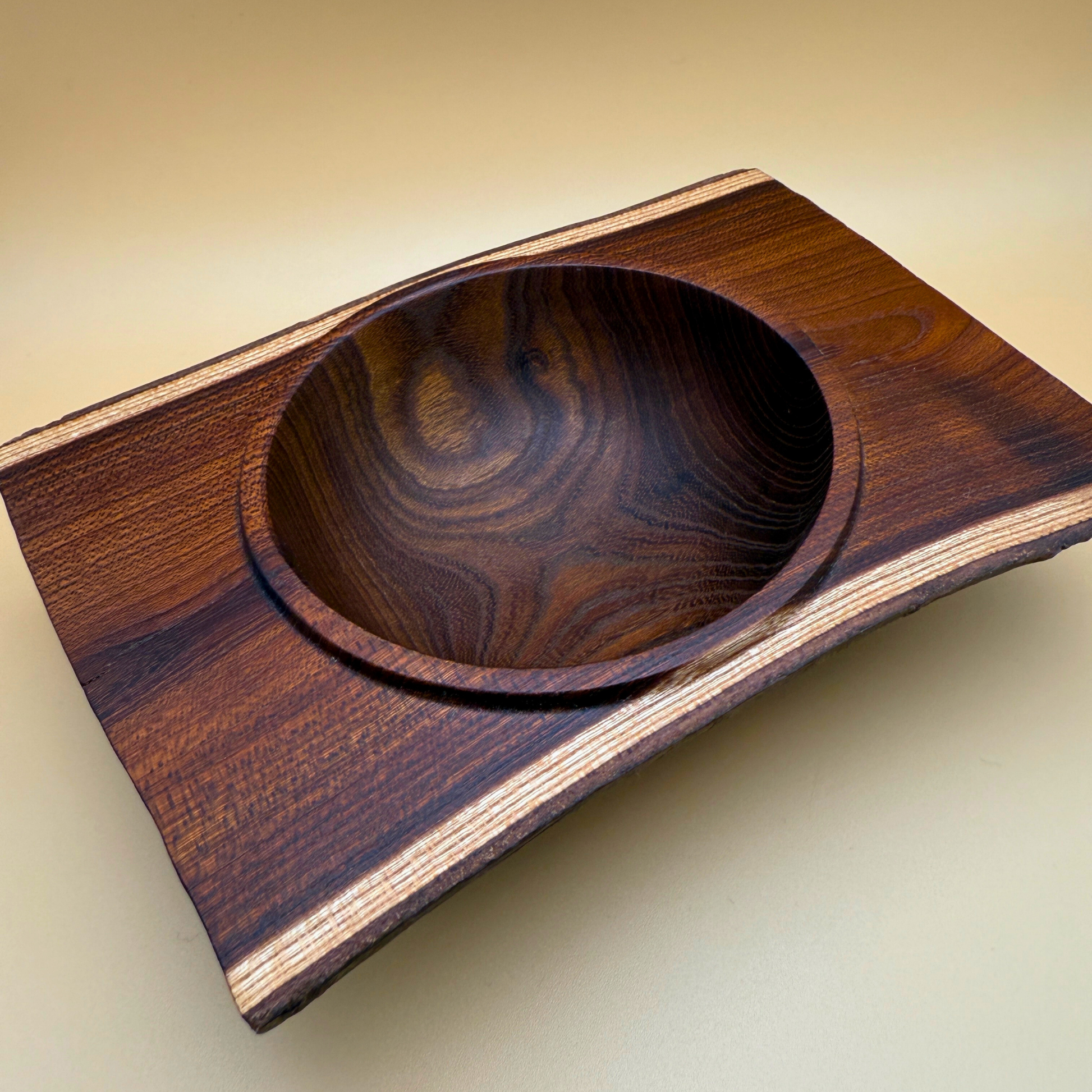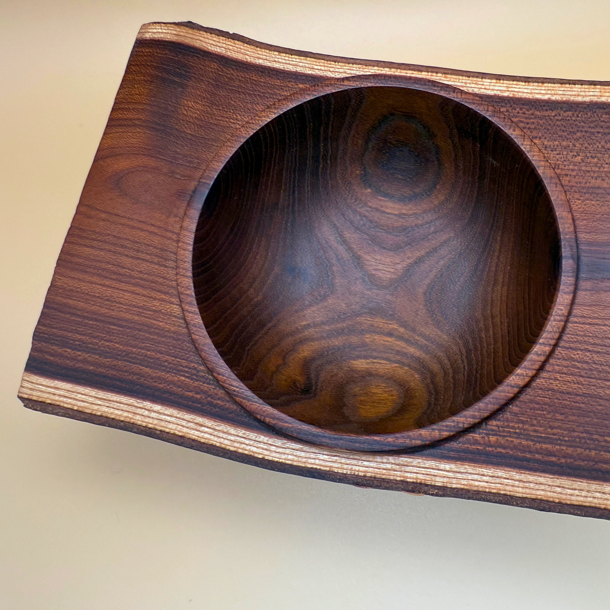 Denne unikke træskål er et håndlavet design af Erik Ravgård , fremstillet i vores eget værksted på Ravgården i Sønderlev , Nordjylland. Træet er lokalt indkøbt fra Mors og har en slående kontrast mellem den runde, udskårne inderskål og den naturlige, firkantede ydre kant .