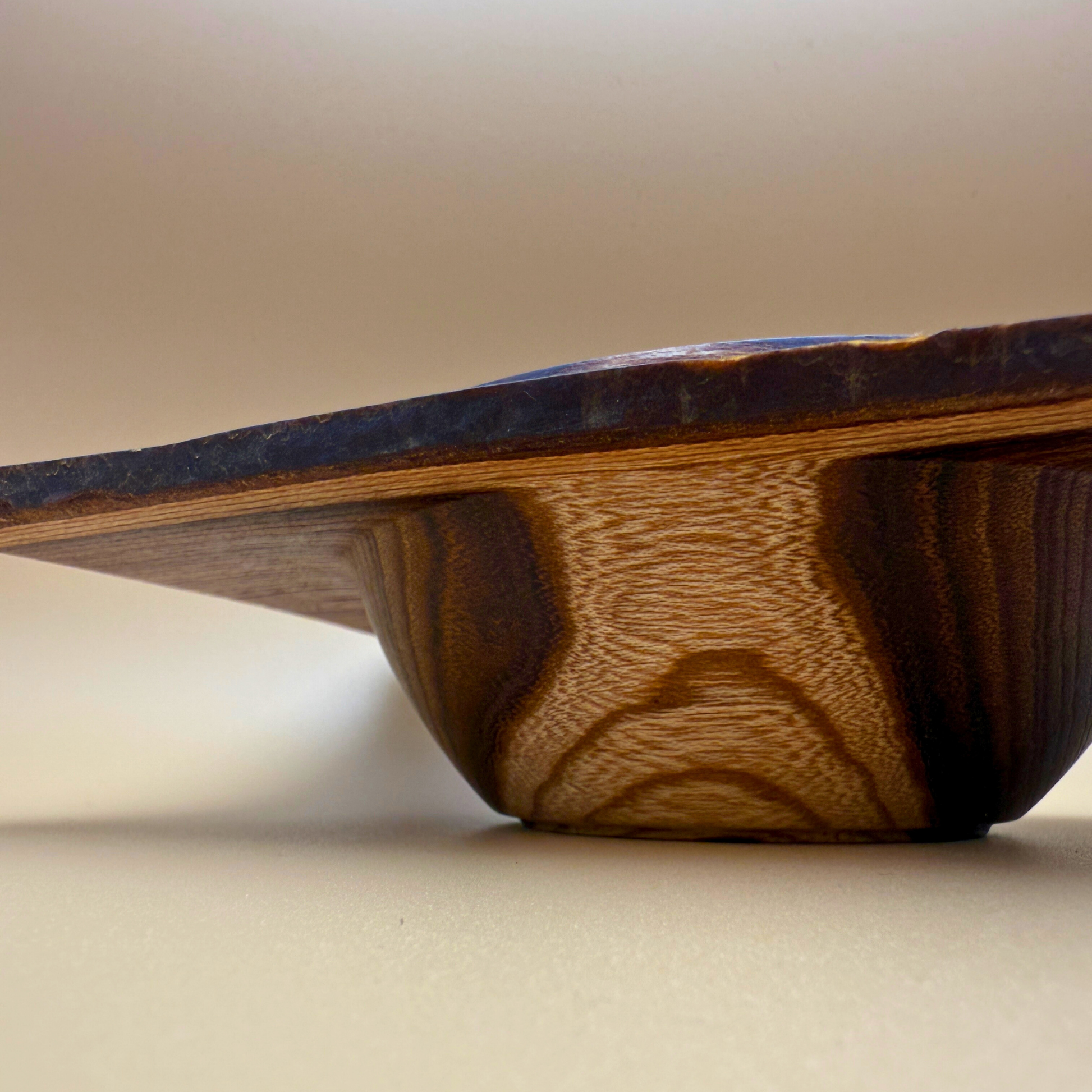 Overfladen er børstet og behandlet med en mat olie , der fremhæver træets fyldige åremønstre , mørke kerneved og områder med lys splintved . På undersiden tilføjer et lyst cognacfarvet ravindlæg med Ravgården-stemplet en subtil, taktil signatur.