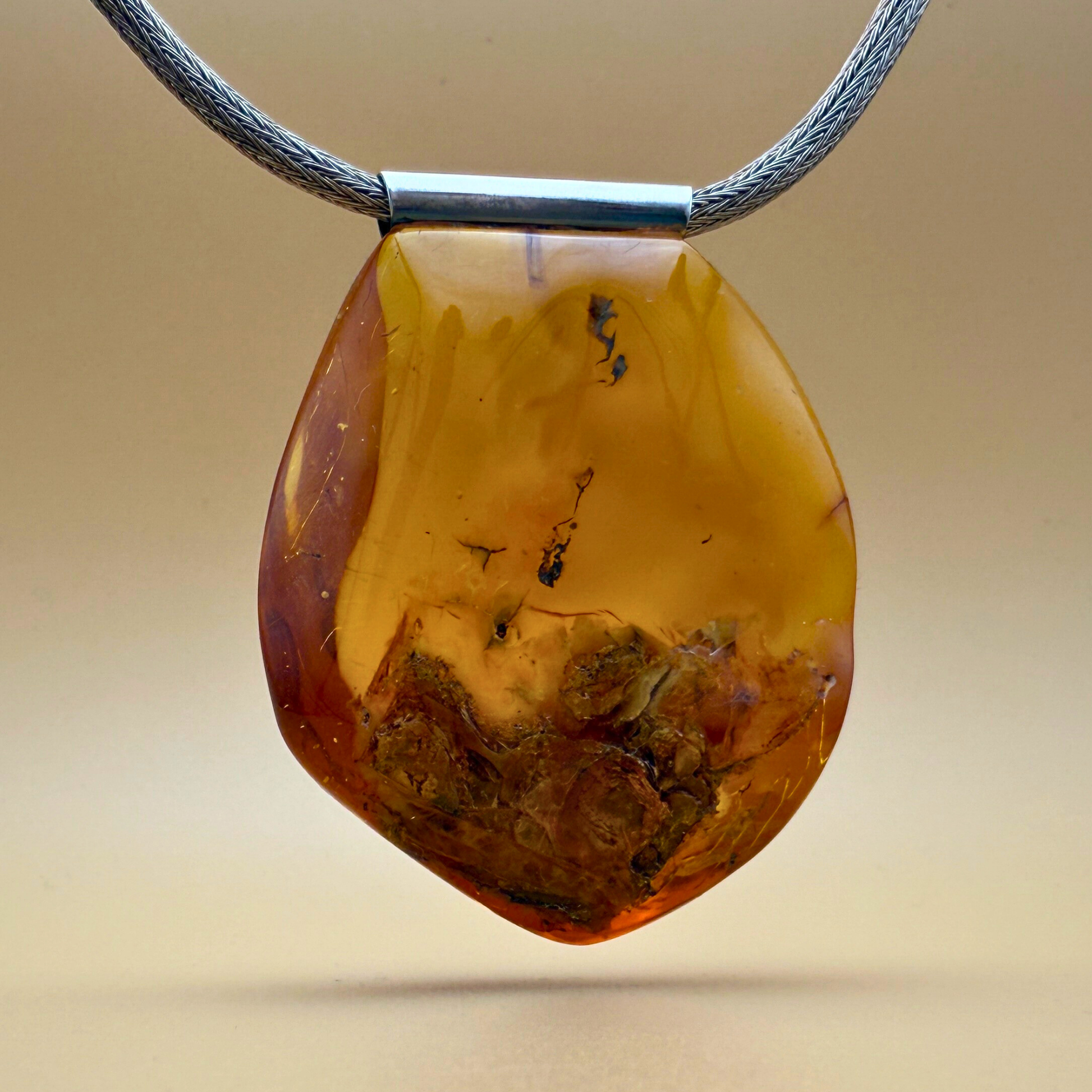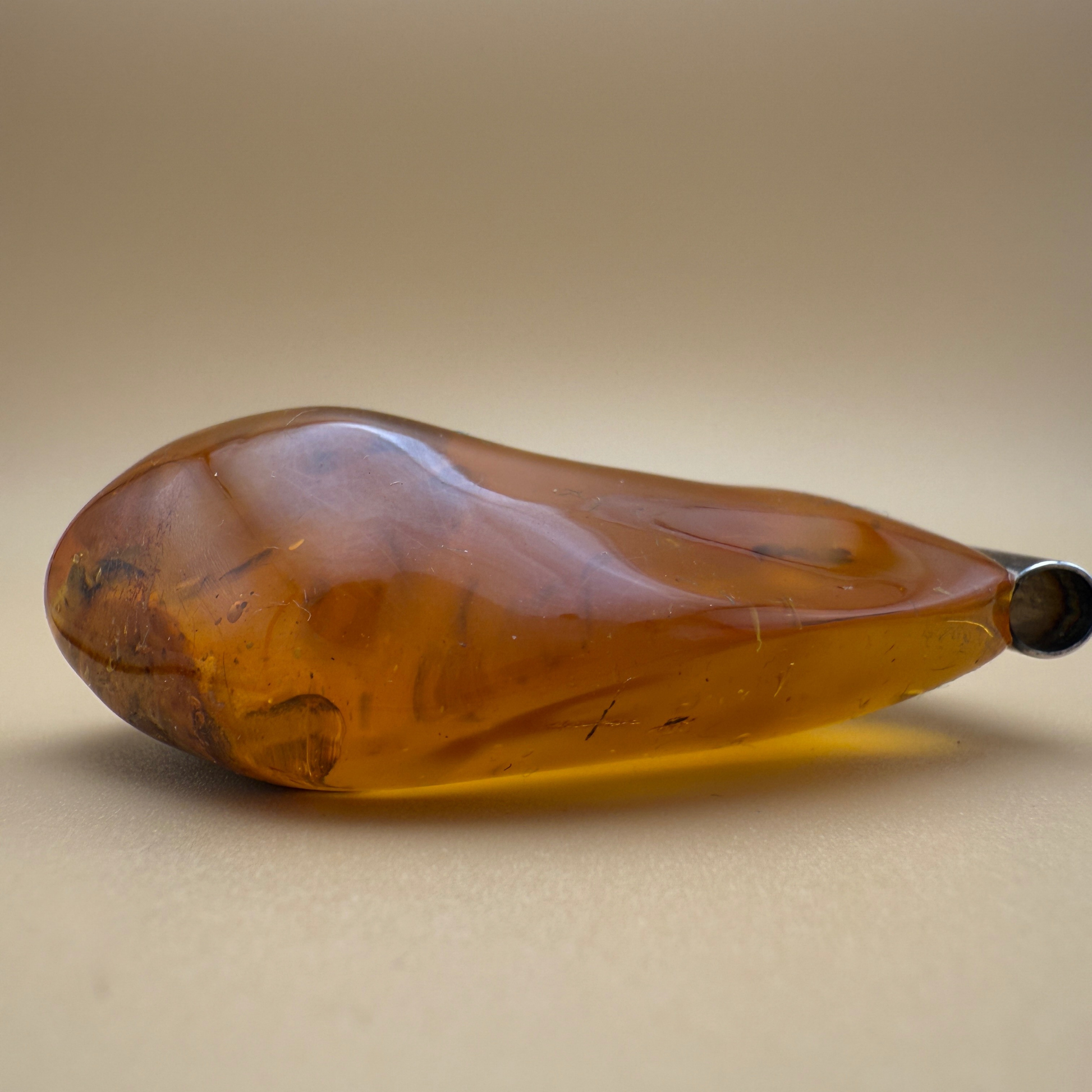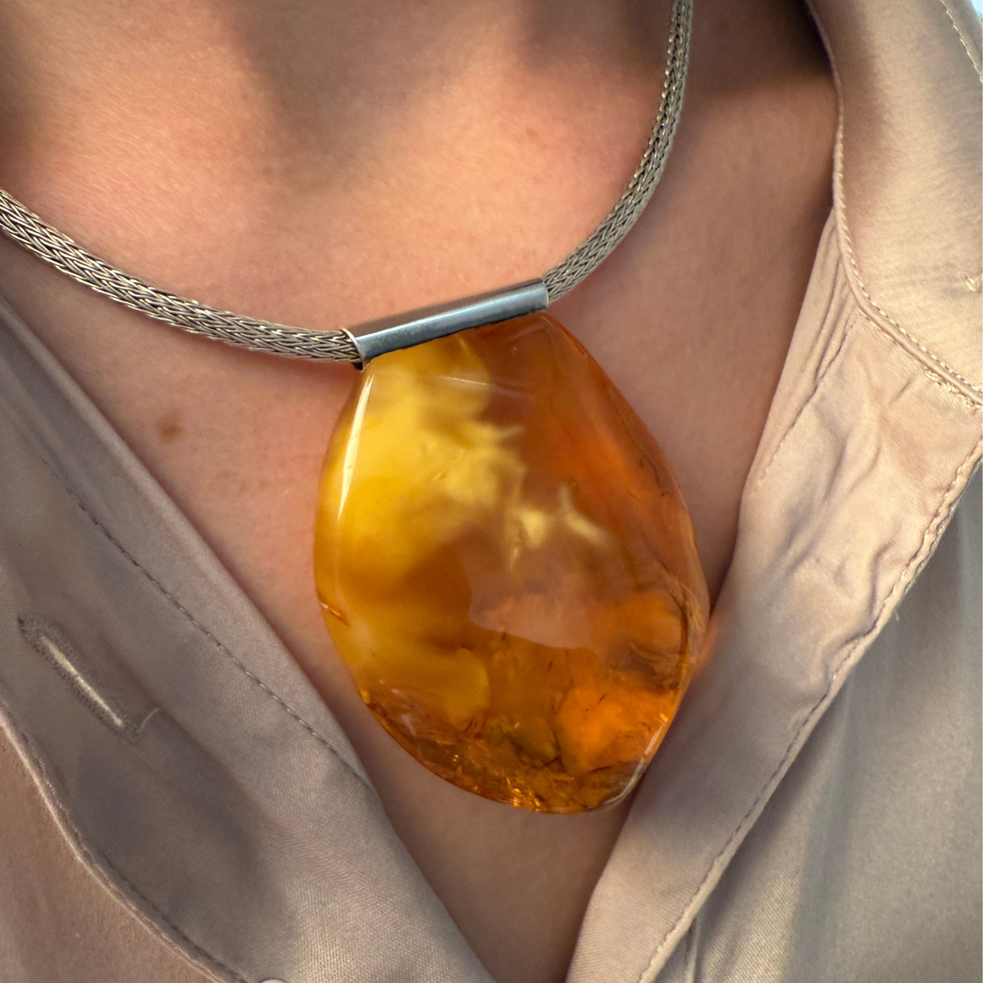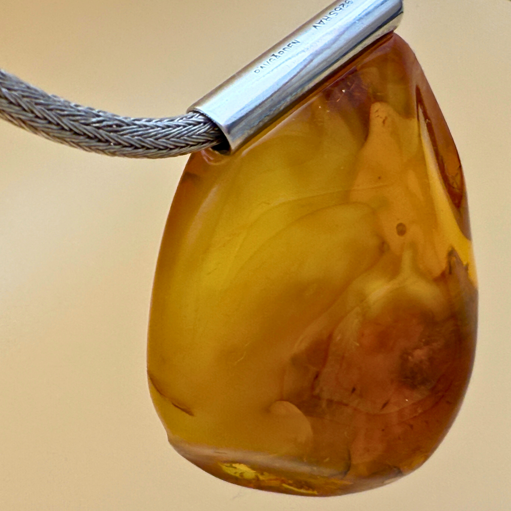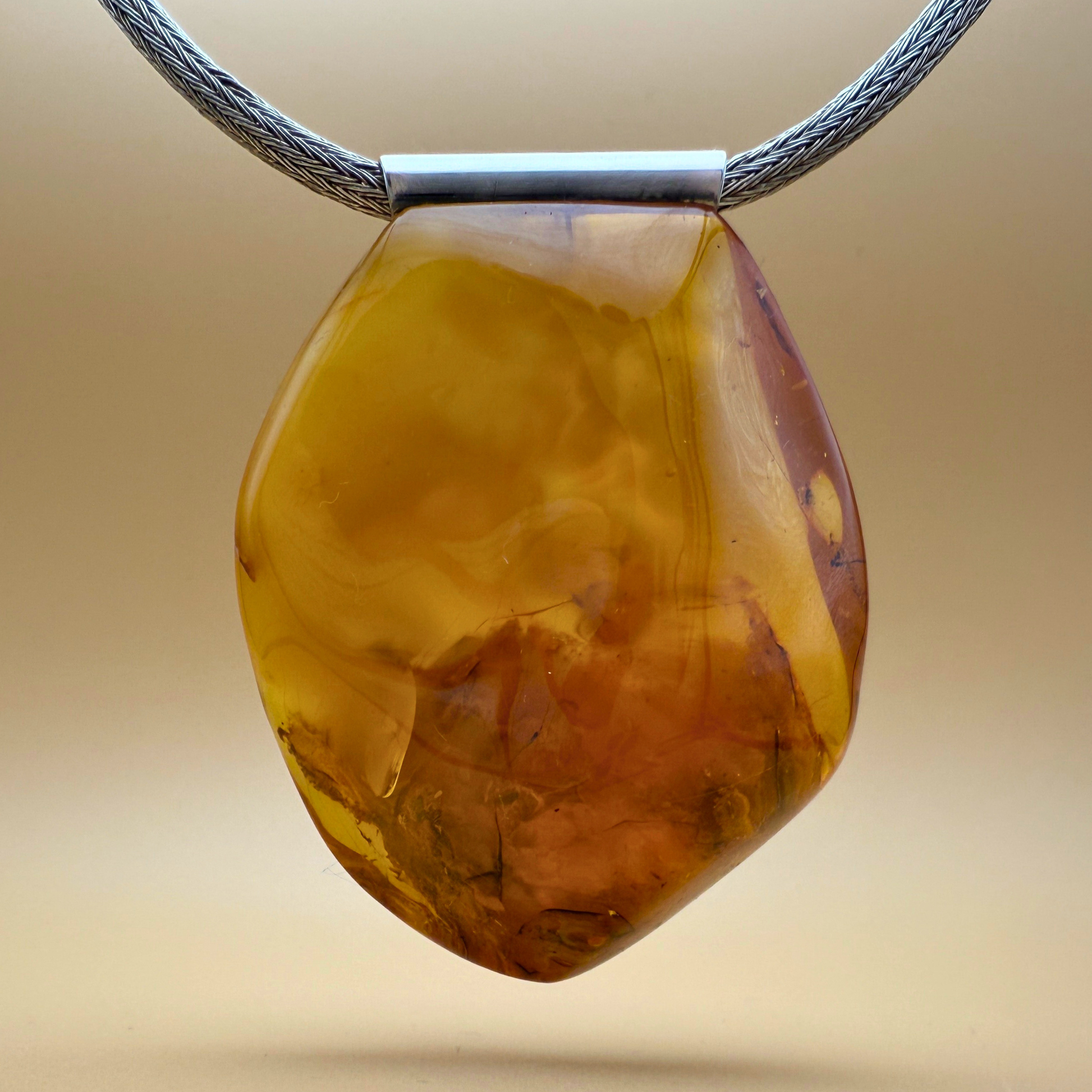 Designet fremhæver ravmets organiske skønhed med fyldige gyldne toner og indviklede naturlige detaljer, der er synlige over hele overfladen. Et massivt rør af 925 sterlingsølv erstatter den traditionelle løkke, hvilket gør det muligt at glide vedhænget på kæder op til 4,9 mm i diameter .