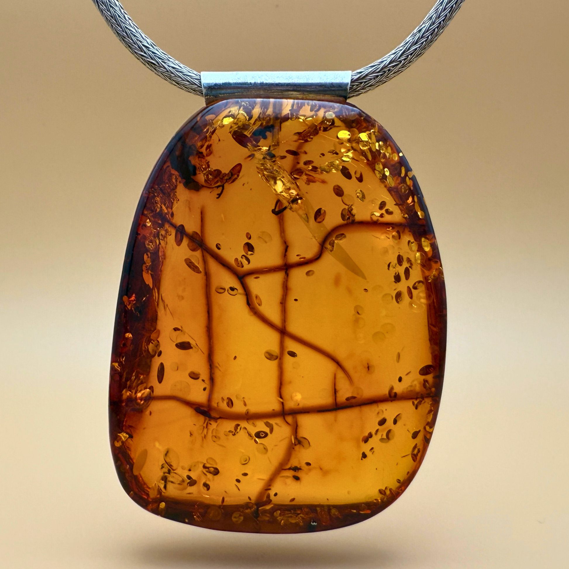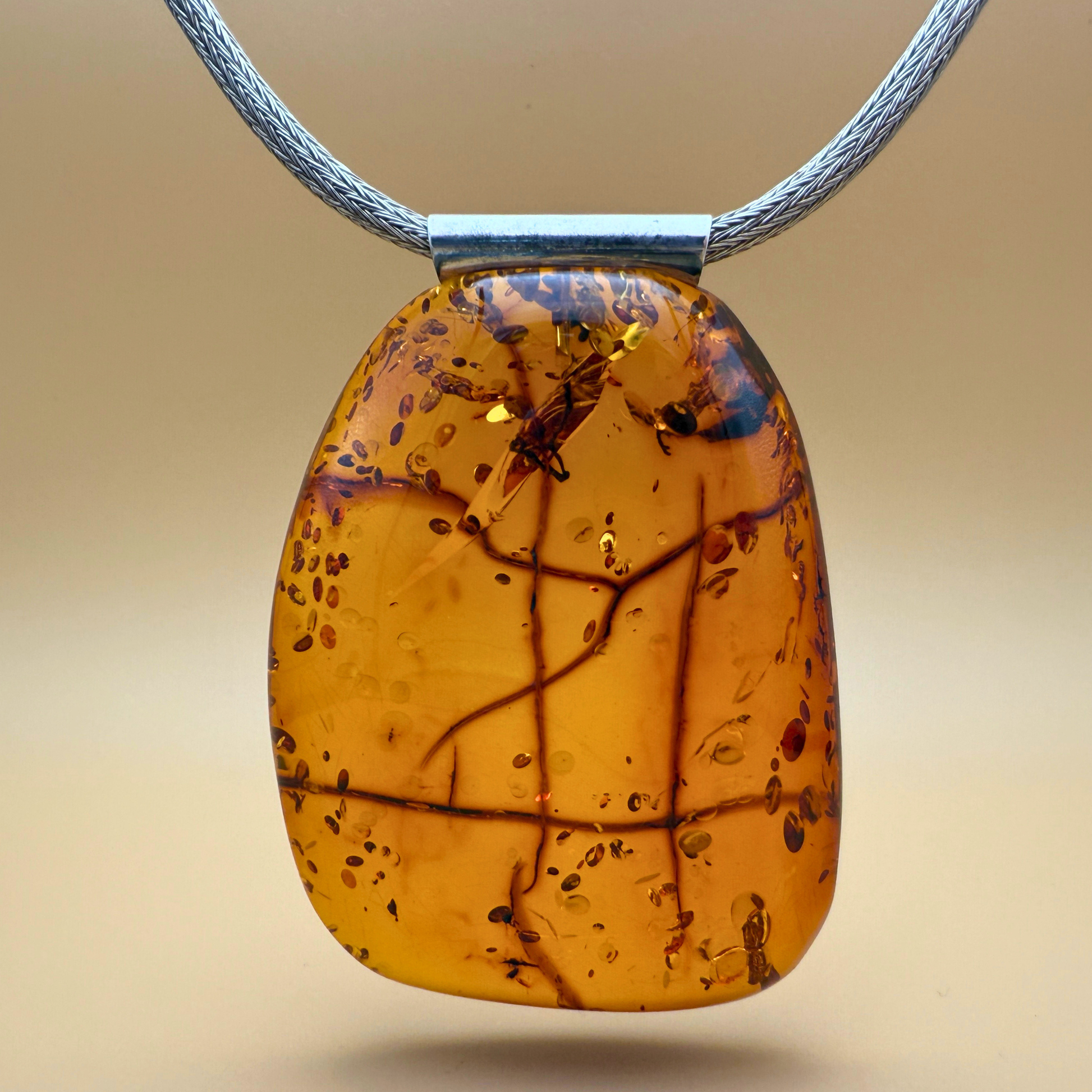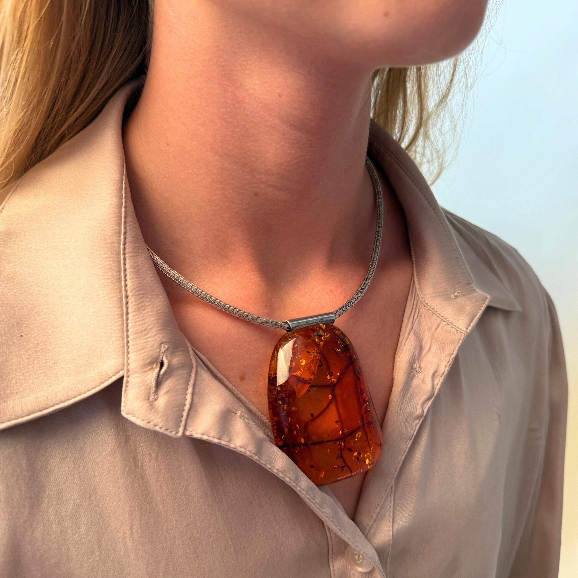 Dette markante og smukke vedhæng er håndlavet på vores værksted ved Ravgården, kun en kort køretur fra Vesterhavet. Det består af et stort stykke cognacfarvet nordisk rav med varme nuancer og et imponerende indre mønster af naturlige sprækker, partikler og strukturer – som fortæller en historie om tid og forvandling.
