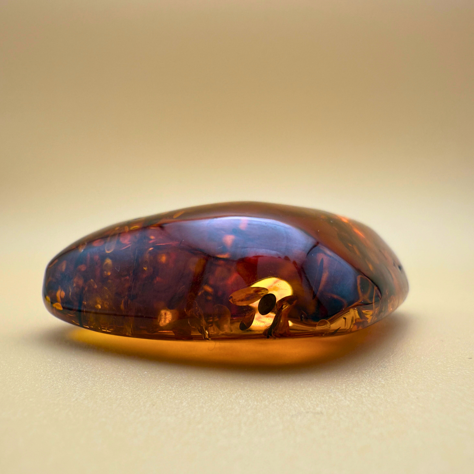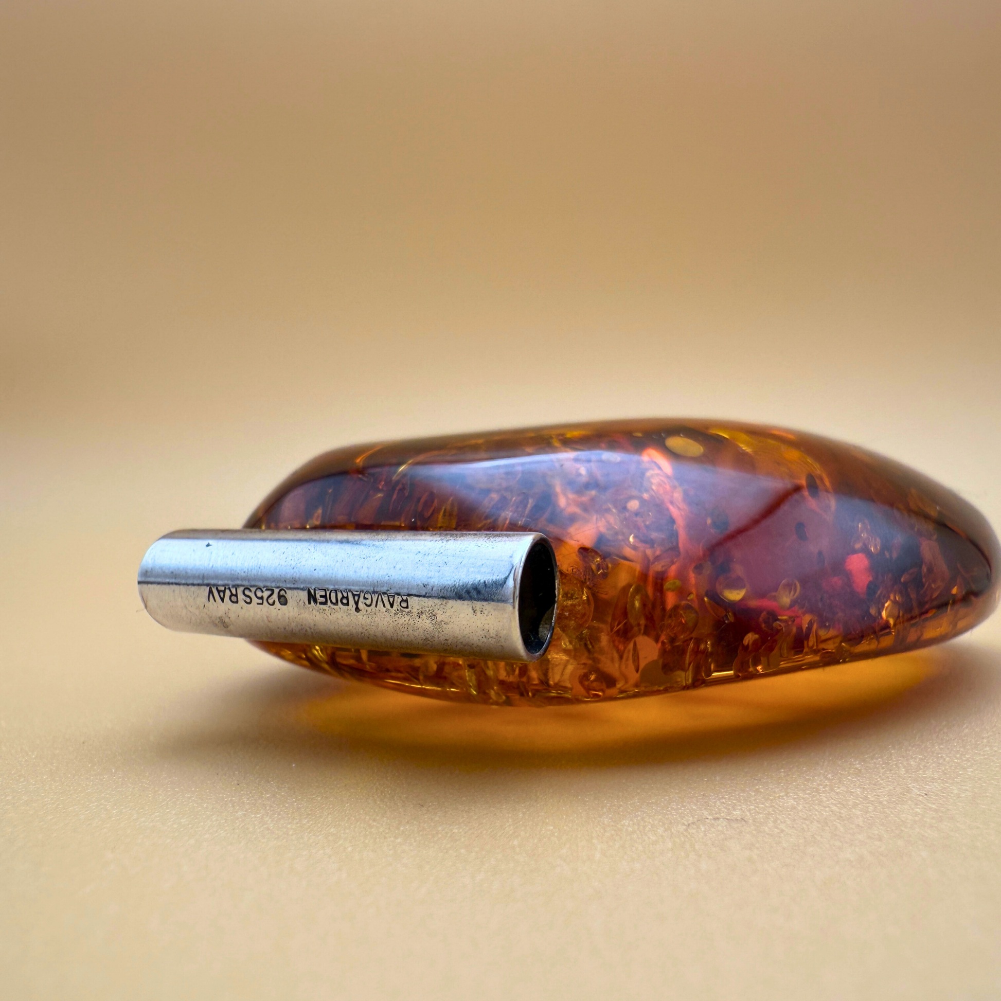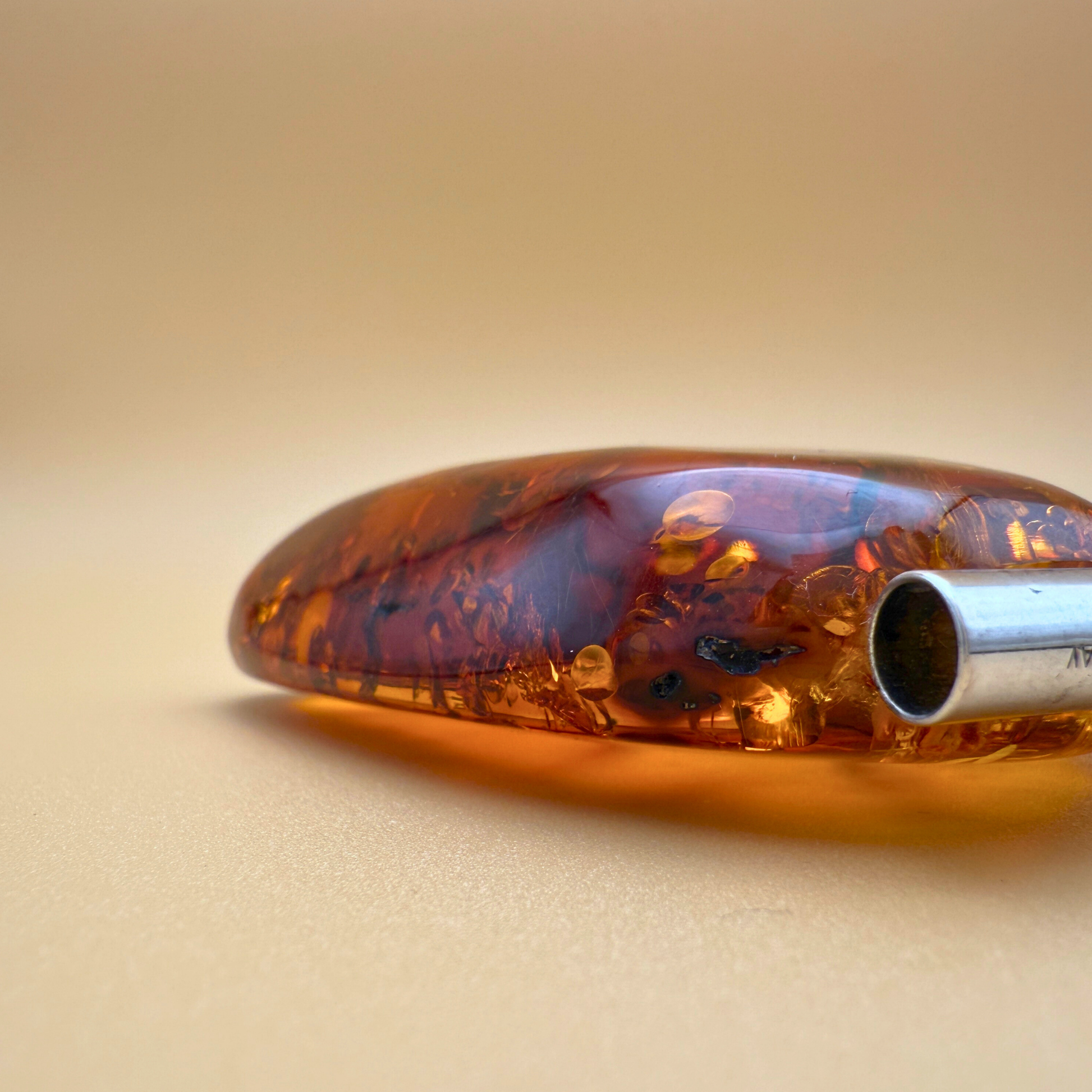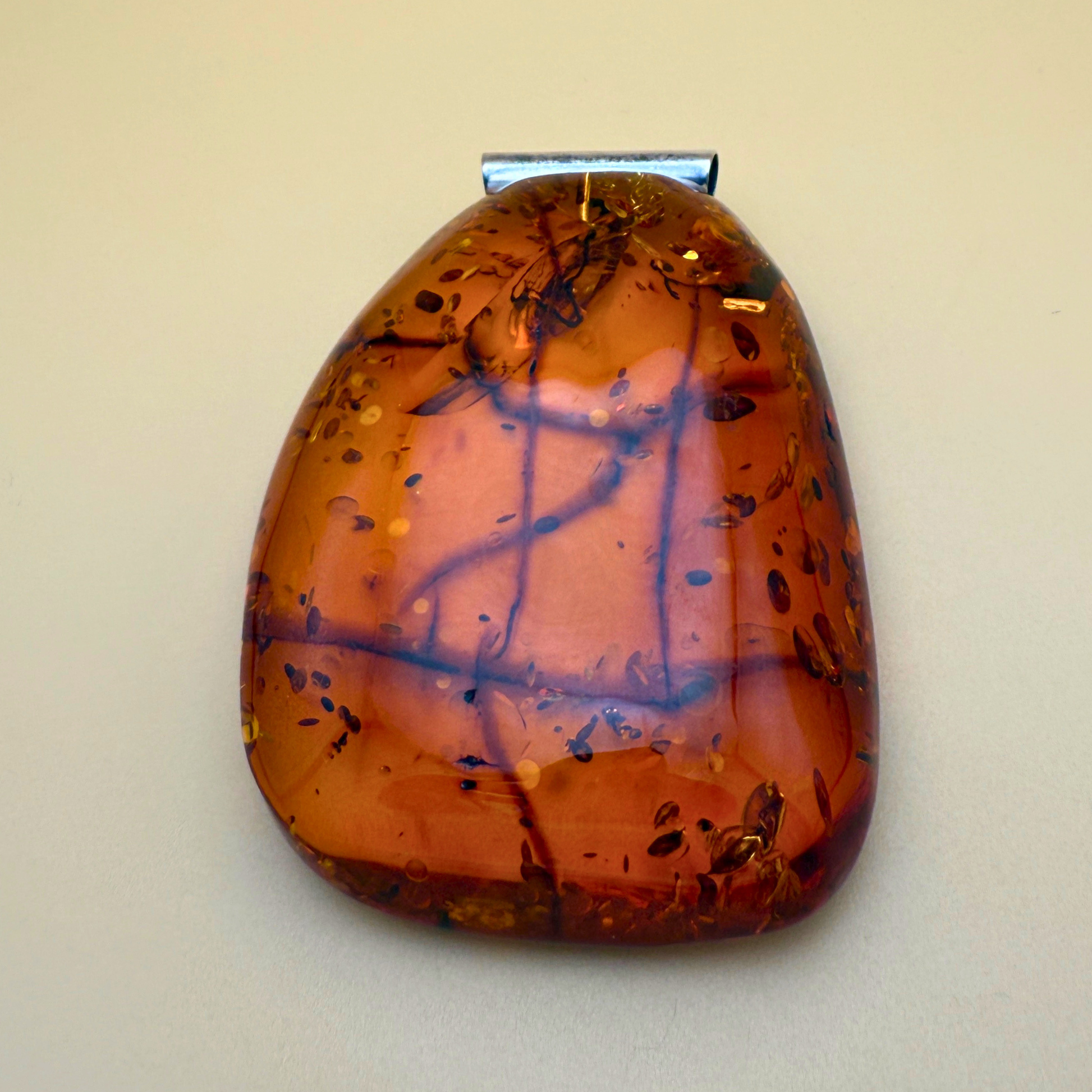 Dette markante og smukke vedhæng er håndlavet på vores værksted ved Ravgården, kun en kort køretur fra Vesterhavet. Det består af et stort stykke cognacfarvet nordisk rav med varme nuancer og et imponerende indre mønster af naturlige sprækker, partikler og strukturer – som fortæller en historie om tid og forvandling.