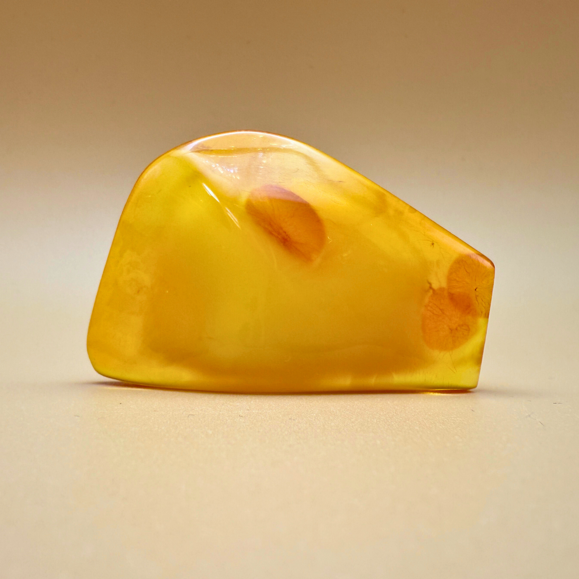 Et strålende stykke natur, fuld af bevægelse, lys og dybde. Denne polerede ravfigur gløder i en klar citrusgul tone, brudt af en blød mælkehvid sky og tre markante cirkulære revner, der skifter og glimter i lyset.