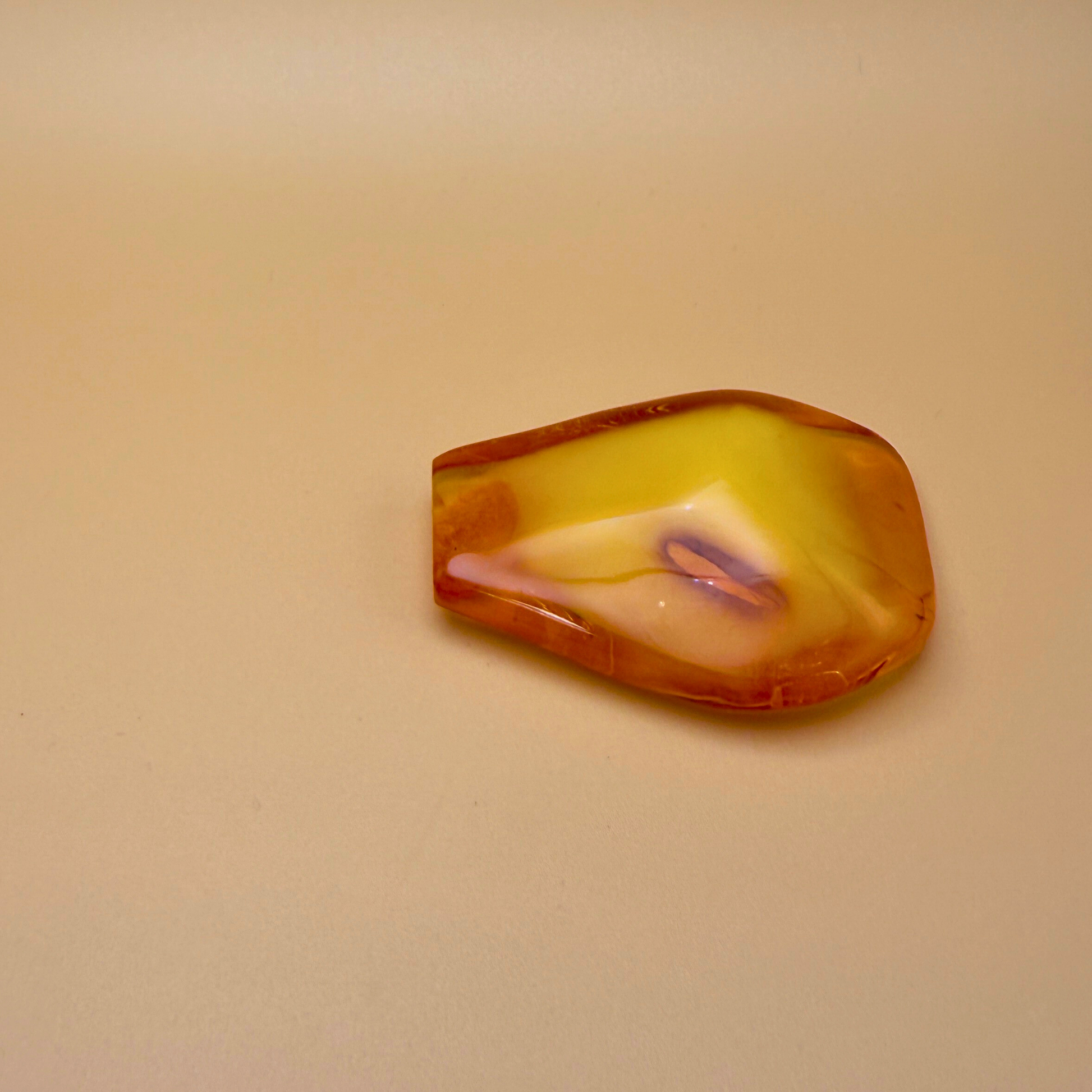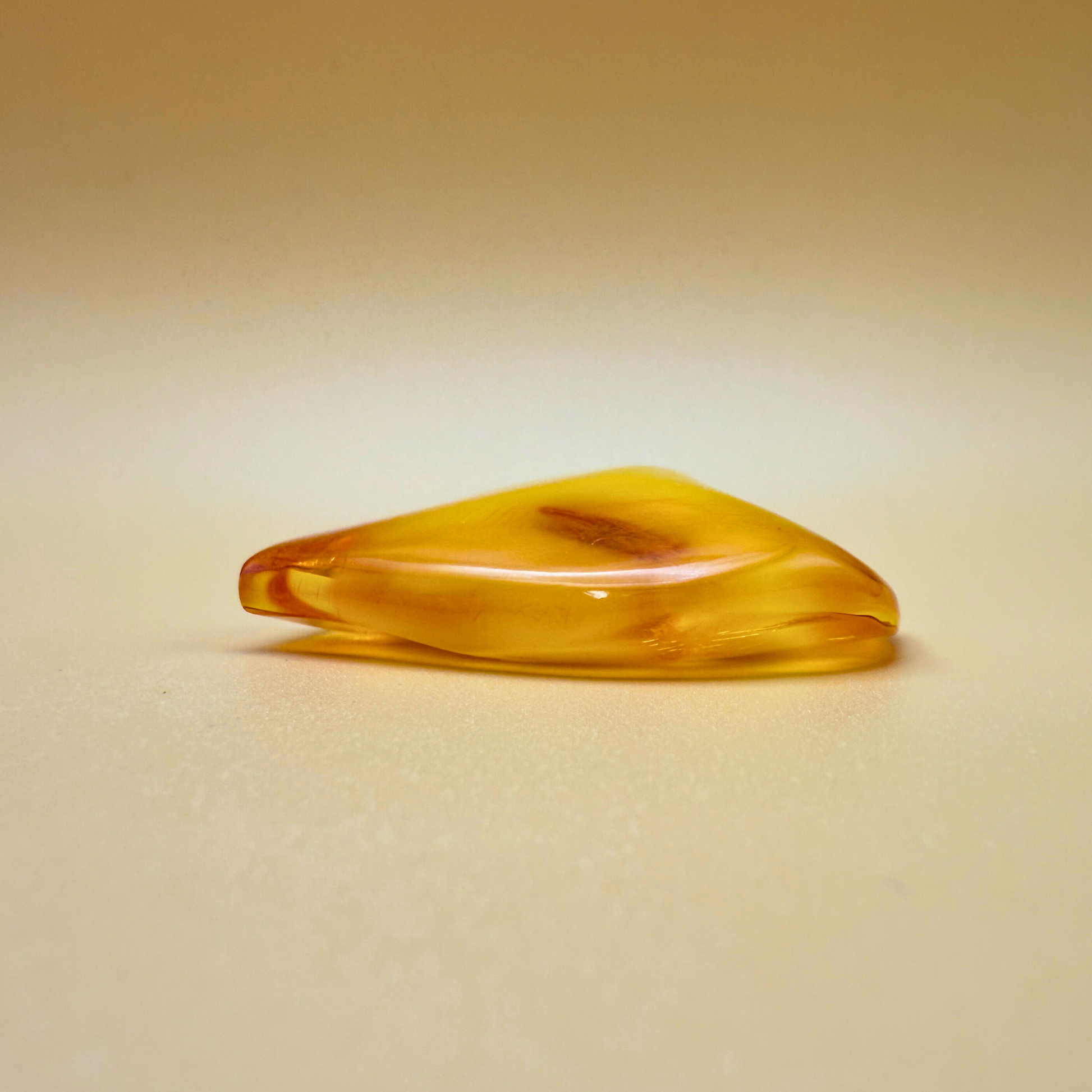 Formen er organisk og asymmetrisk, med to flade sider, der gør den velegnet både som dekorativ genstand – eller til at ligge behageligt i hånden som et taktilt stykke til ro og fordybelse. Fuldt poleret og med en vægt på 18,8 gram rummer den både visuel tyngde og en jordnær varme.