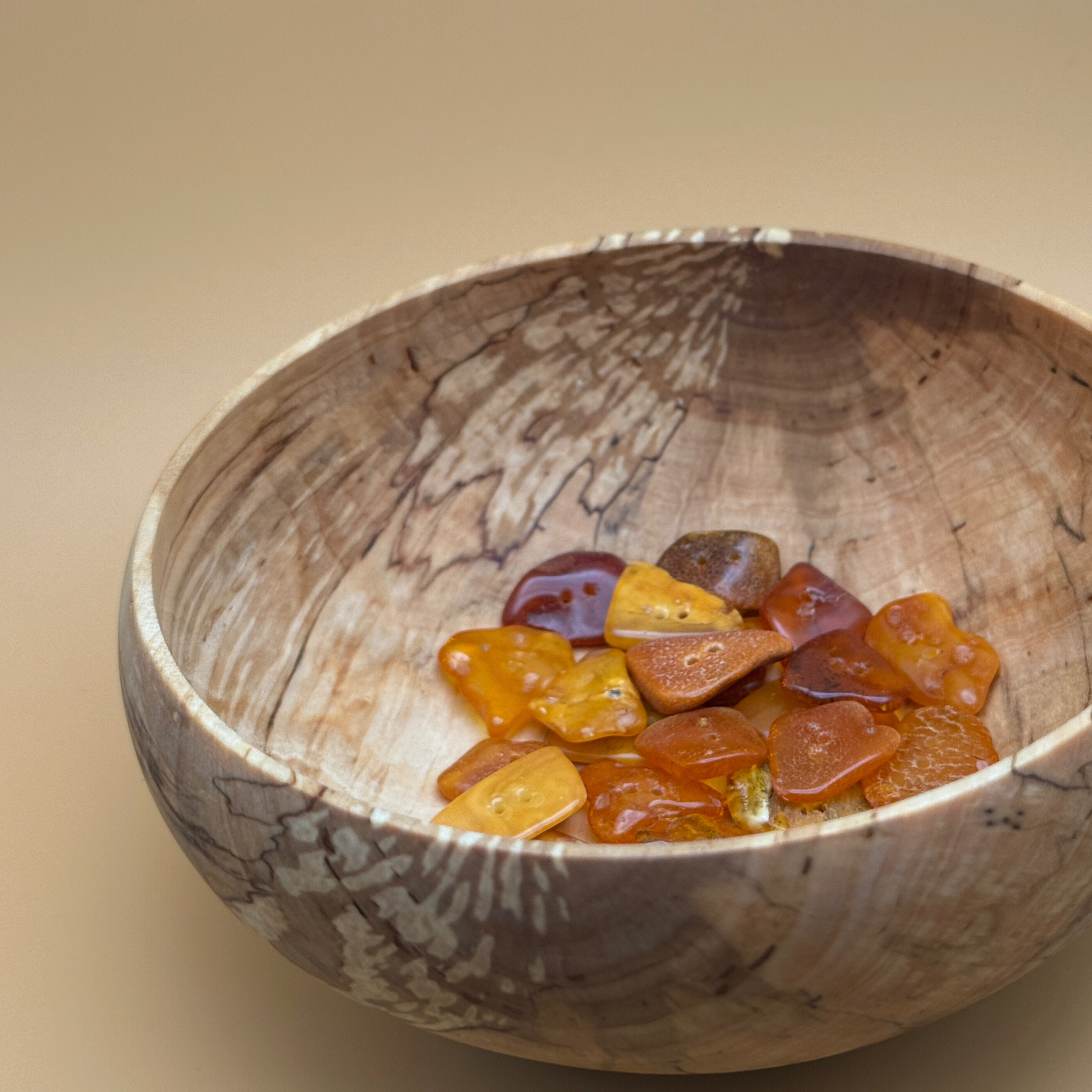 Skålen er behandlet med en fødevaresikker, farveløs olie , der bevarer træets rå skønhed og taktile blødhed. På undersiden finder du et lille lyst cognacfarvet stykke rav – en diskret signaturdetalje, der forbinder genstanden med Ravgaards verden af nordisk natur og håndværk.