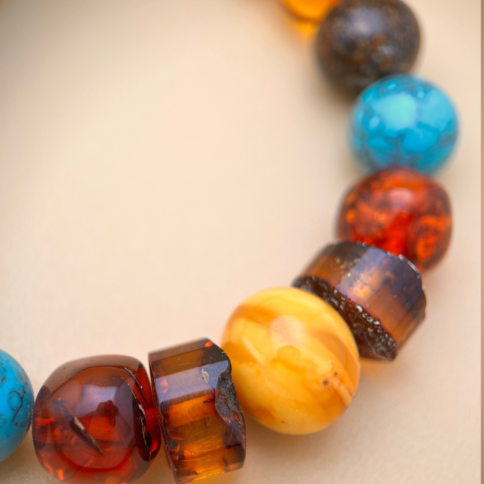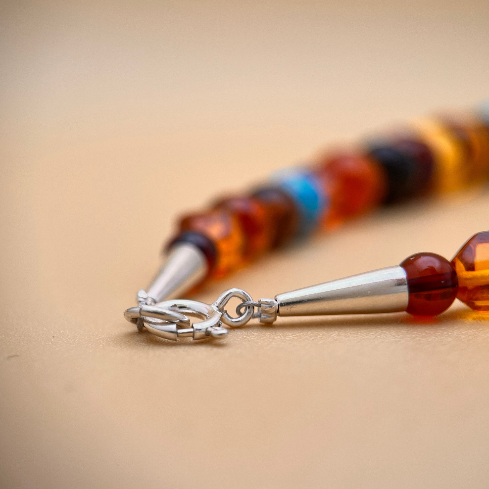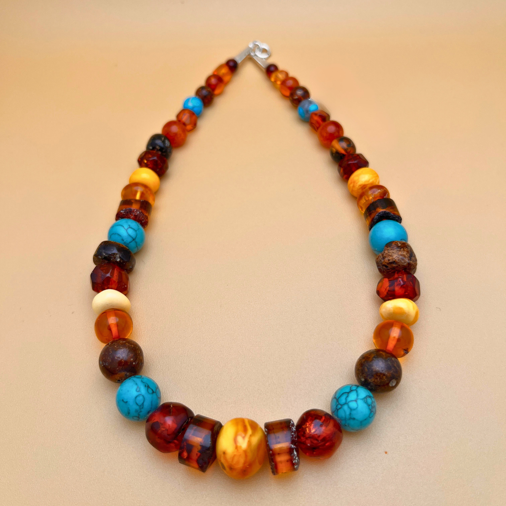 En enestående og unikt halskæde med rav i forskellige farver og former – nænsomt slebet og formet for at fremhæve ravets naturlige glød.
