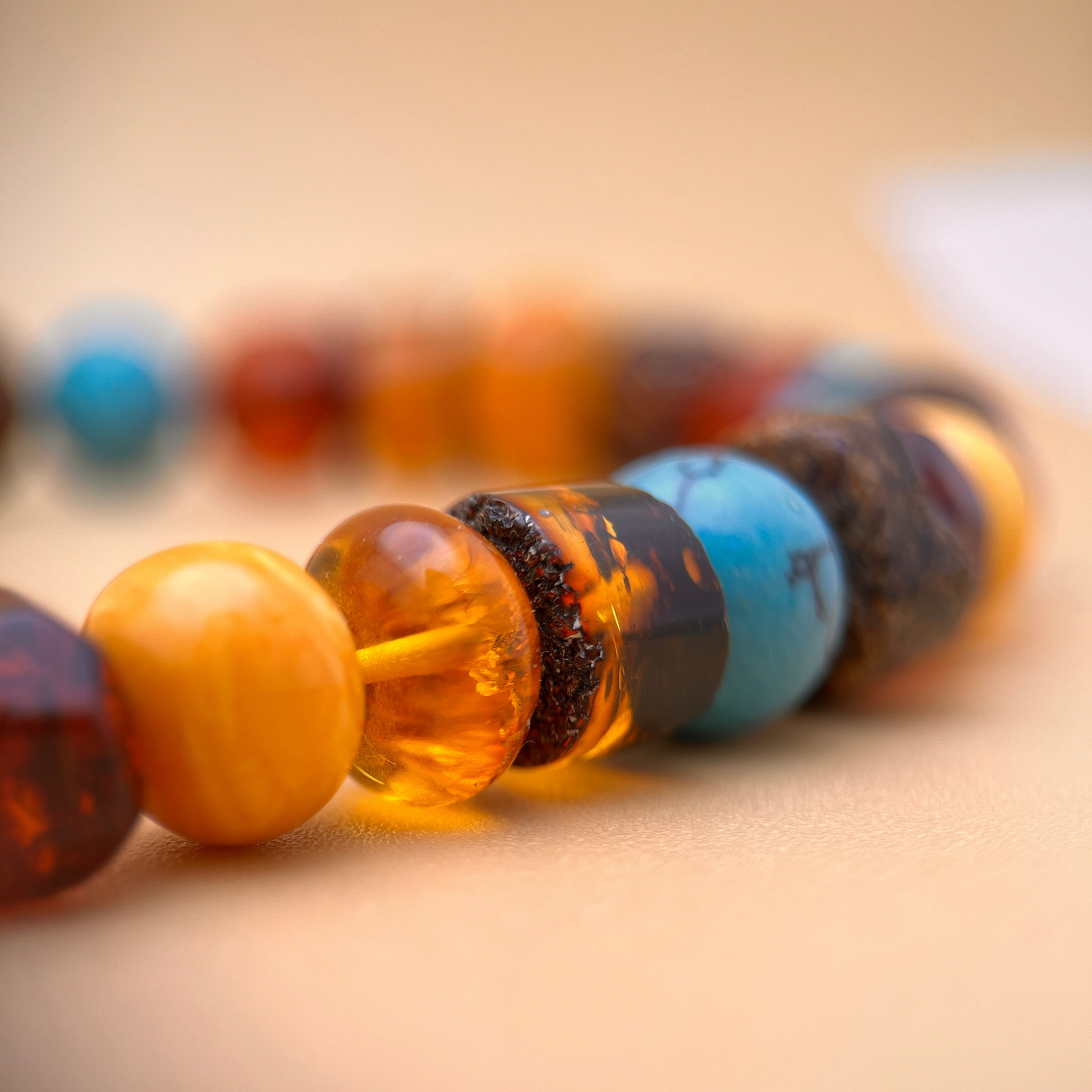 Designet løftes af seks kontrastfulde accentsten: fire ægte turkisperler og to howlitperler i turkisblå, som tilfører et moderne modspil til de varme ravtoner.