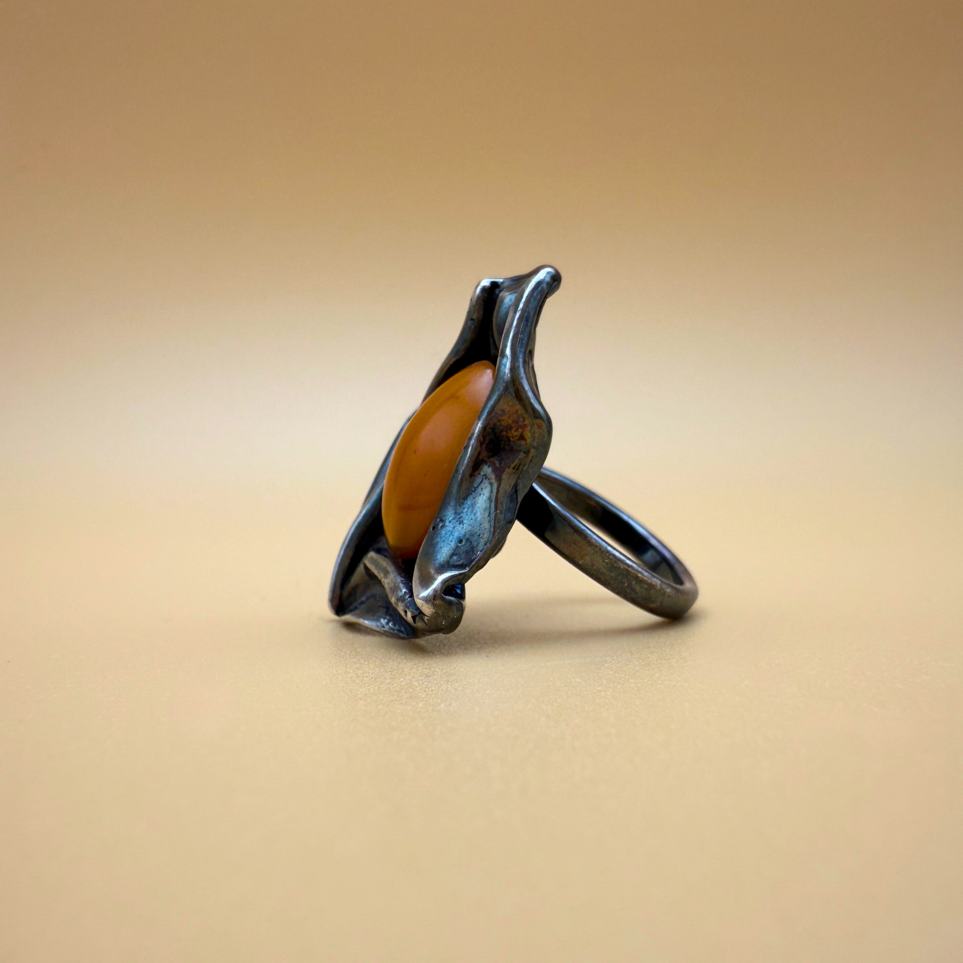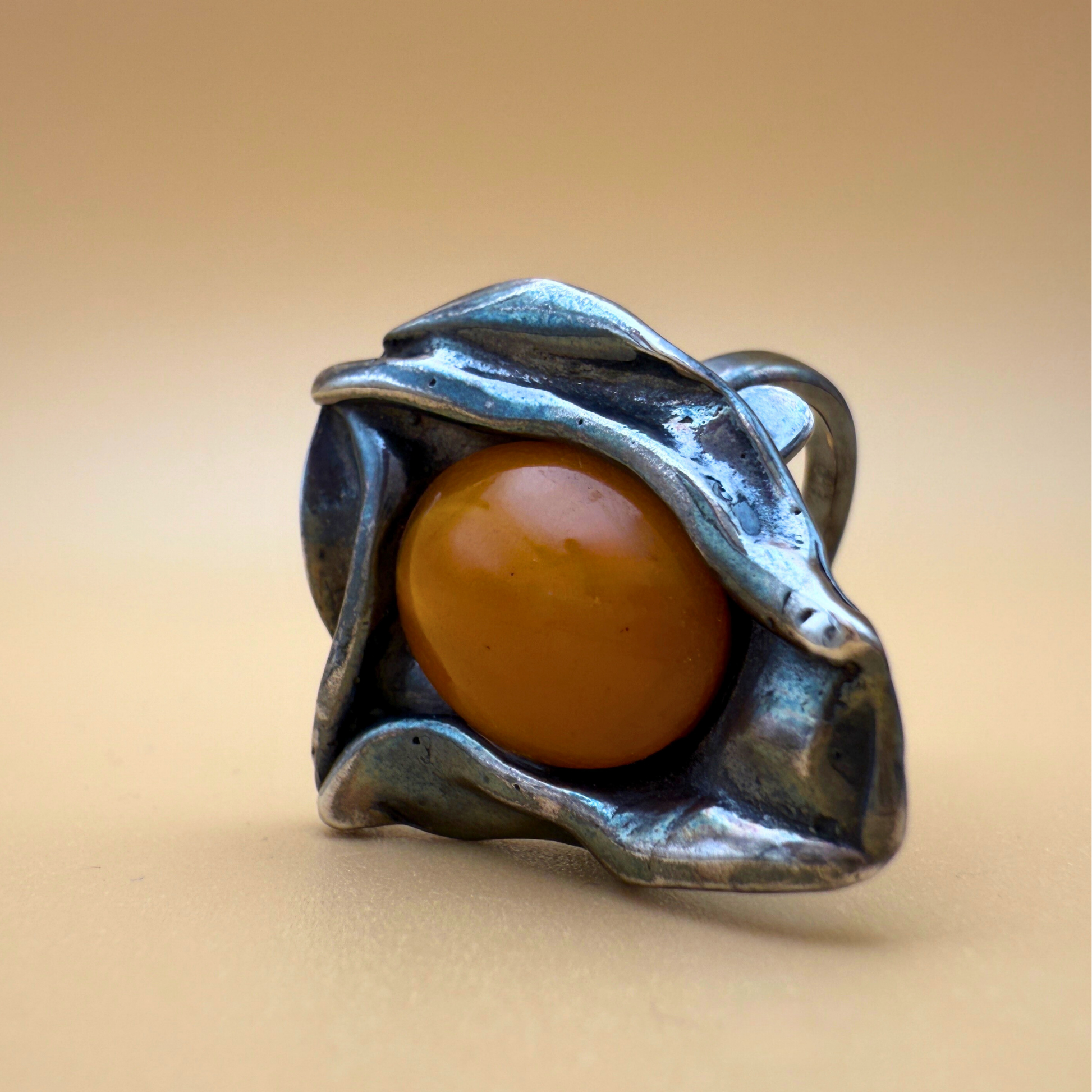 Denne udgave er lavet af oxideret 925 sterlingsølv , hvilket giver den en dybere, tekstureret overflade, der fremhæver de organiske kurver. I midten sidder en oval mælkerav cabochon (16 x 12 mm), der lyser blødt med varme gule nuancer og naturlig variation i tone.
