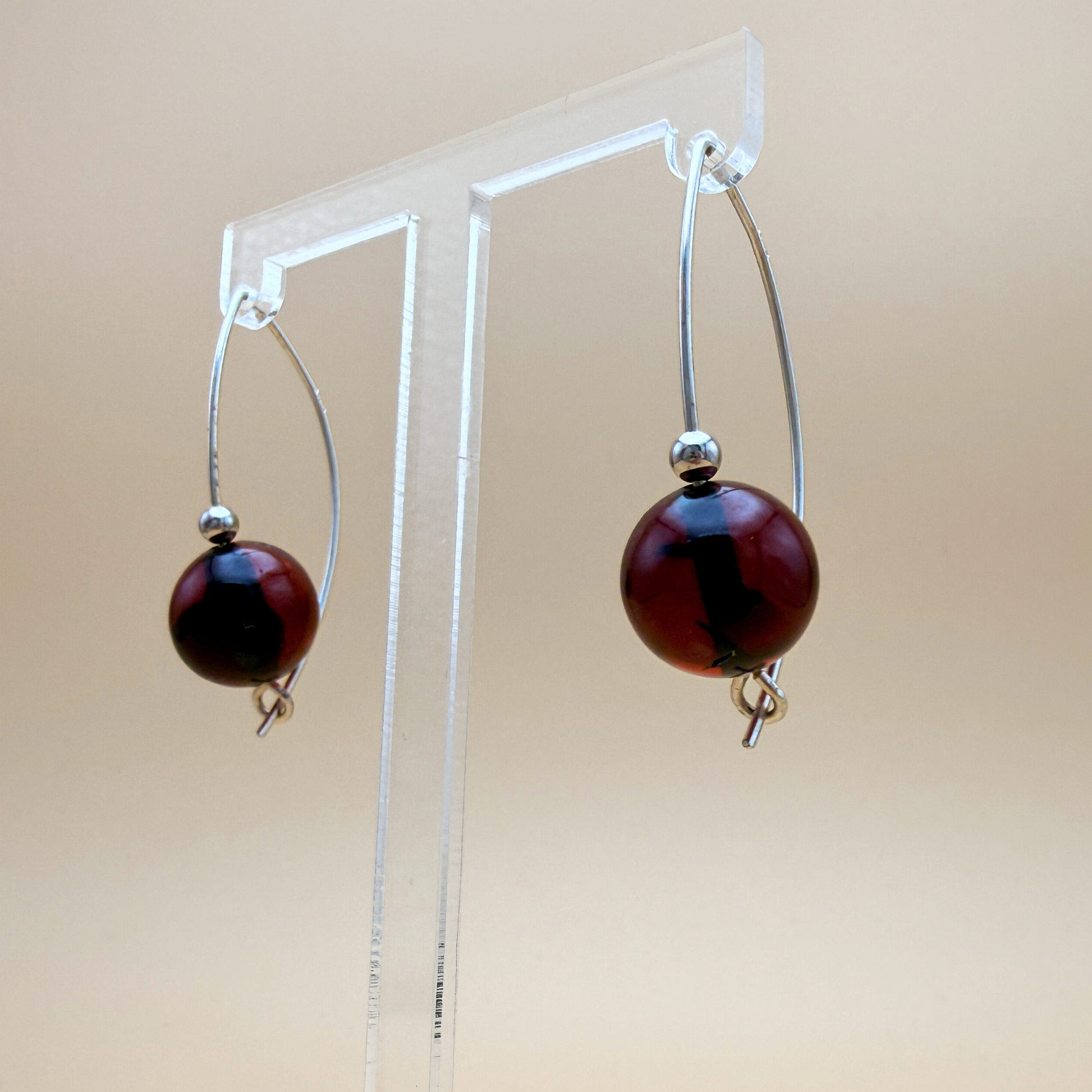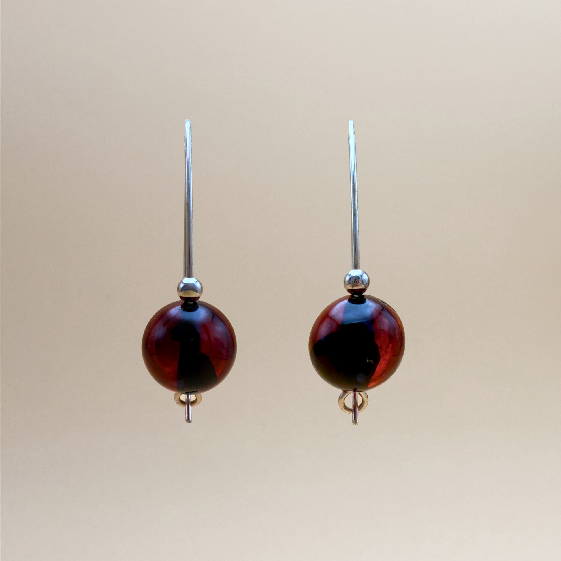 Die runde Bernsteinperle (10–11 mm) trägt einen tiefen weinroten Ton, der im Licht warm leuchtet. Der Bernstein entstand vor Millionen von Jahren aus Baumharz und wird in unserer Werkstatt in Sønderlev sorgfältig ausgewählt.