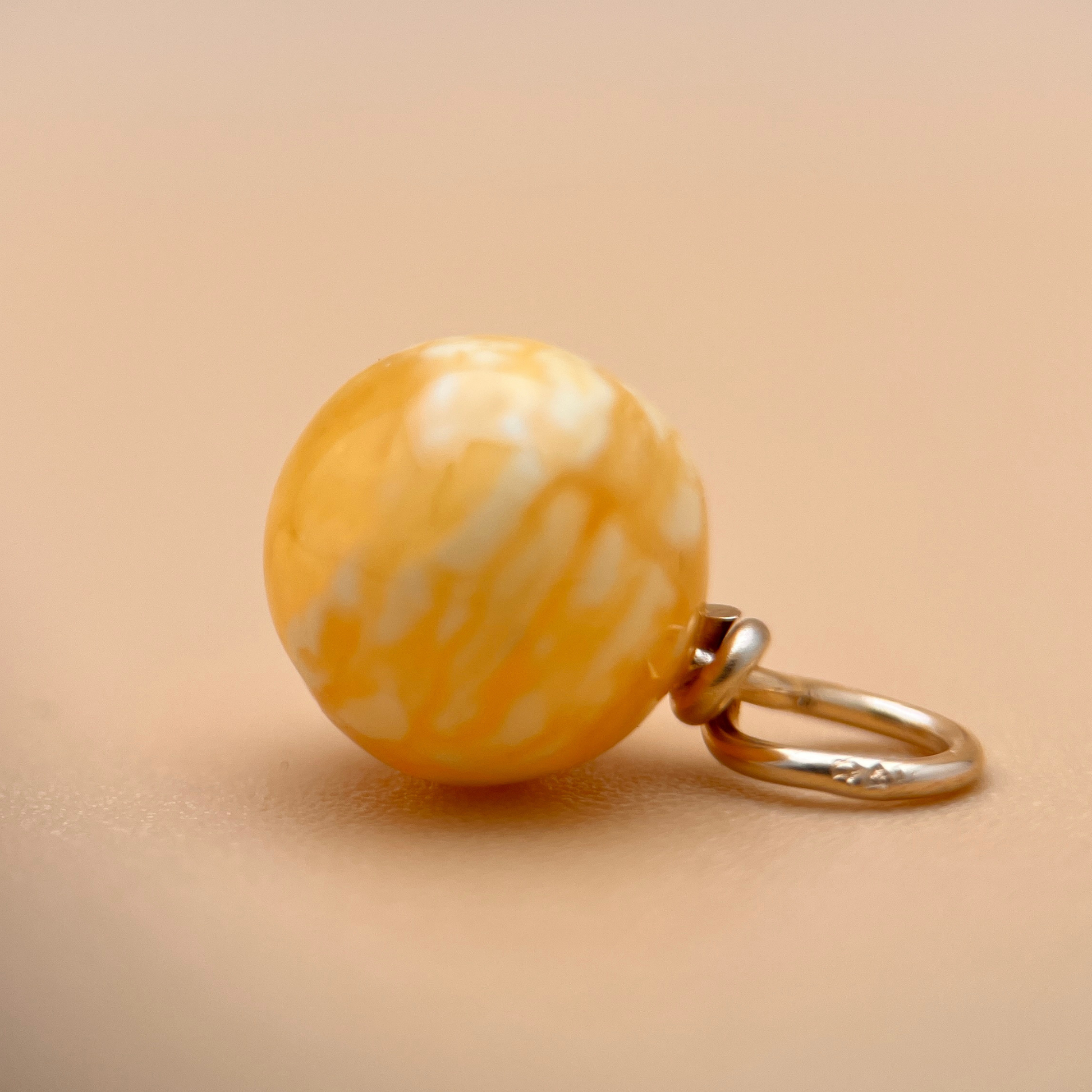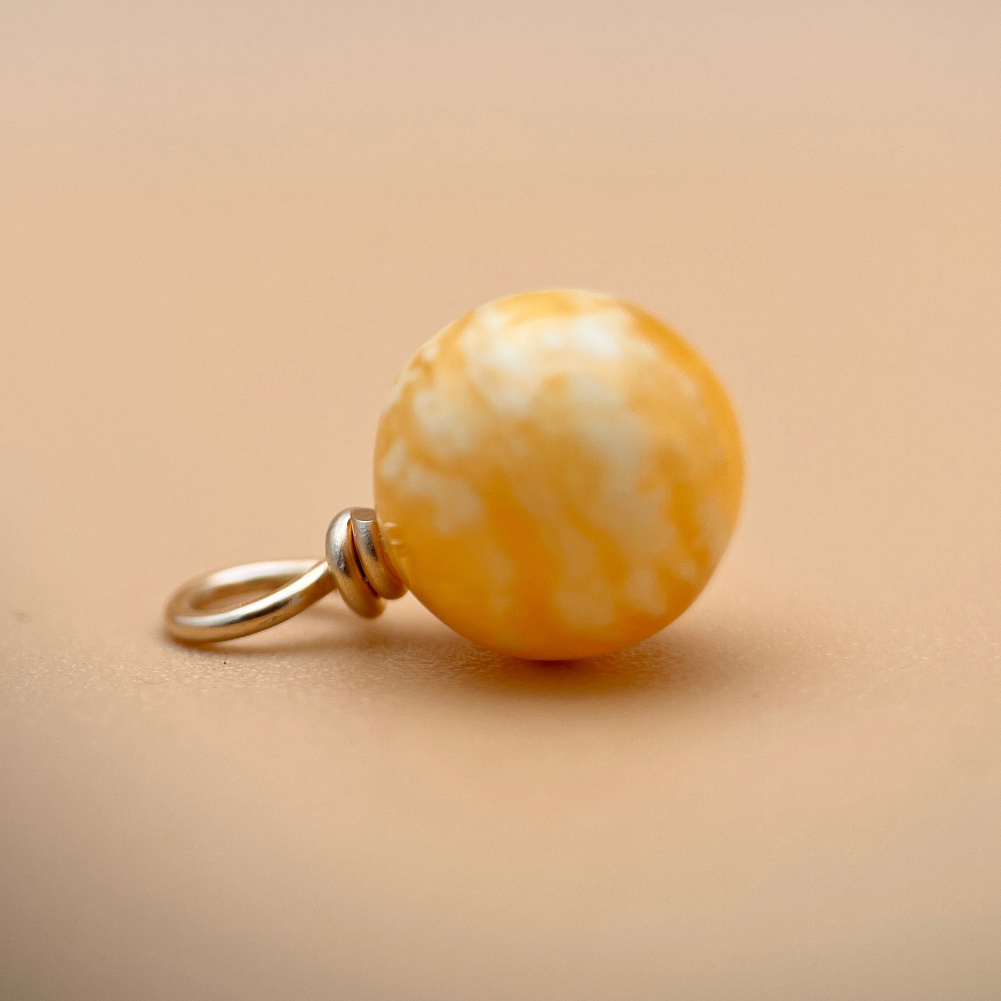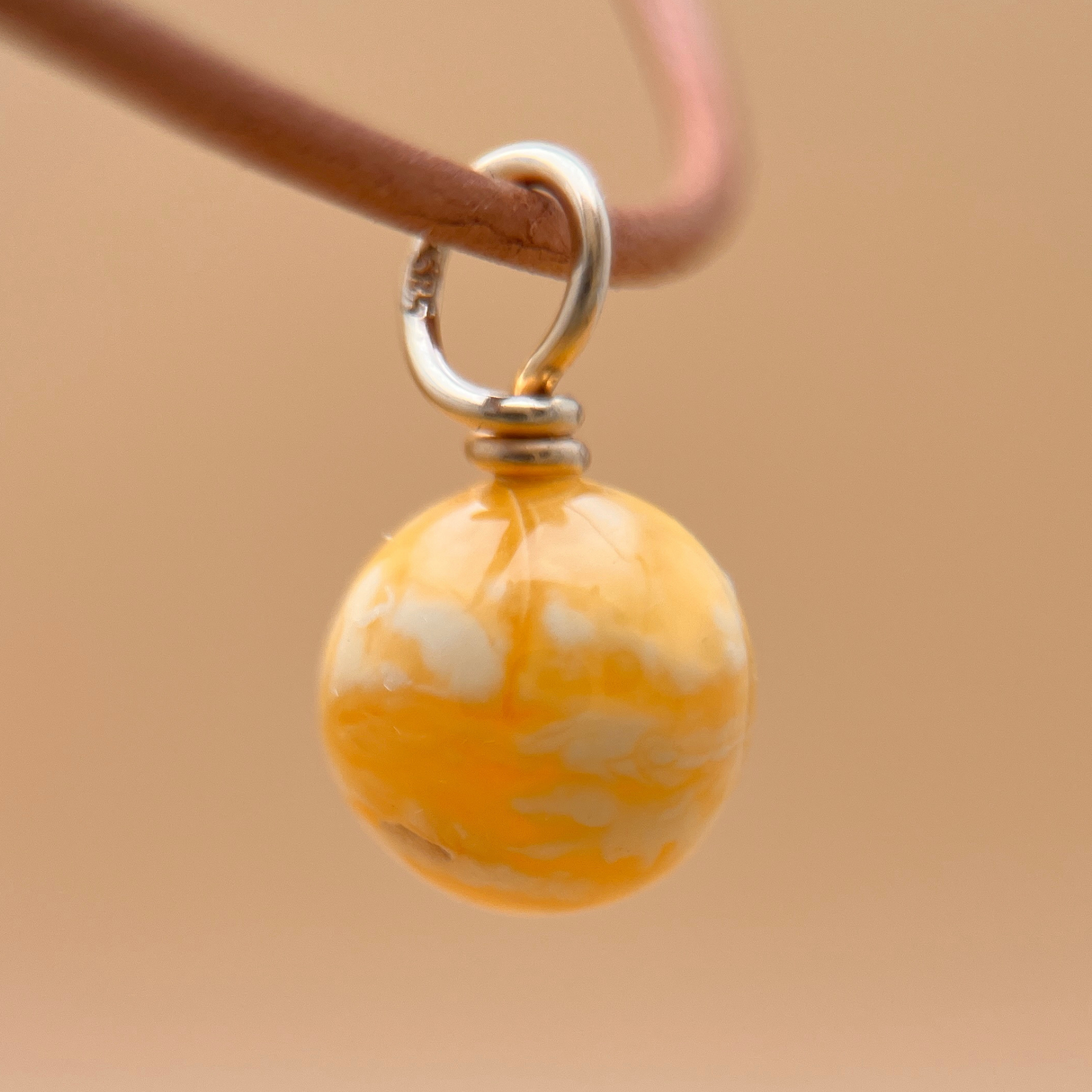 Dieser Anhänger besteht aus einer runden 11-mm-Bernsteinperle mit weichen weißen und gelben Wirbeln – wie zarte, in Stein eingefangene Wolken.