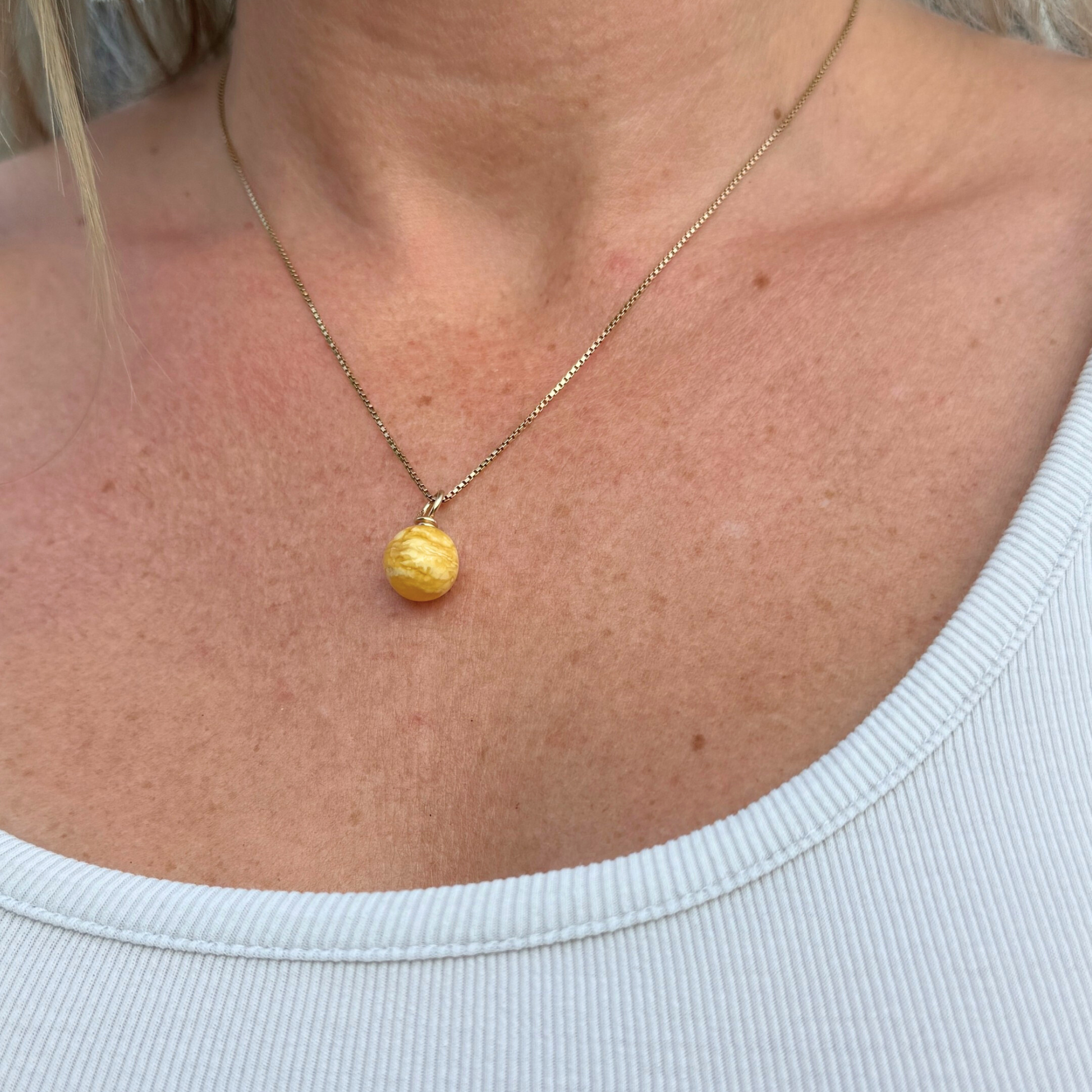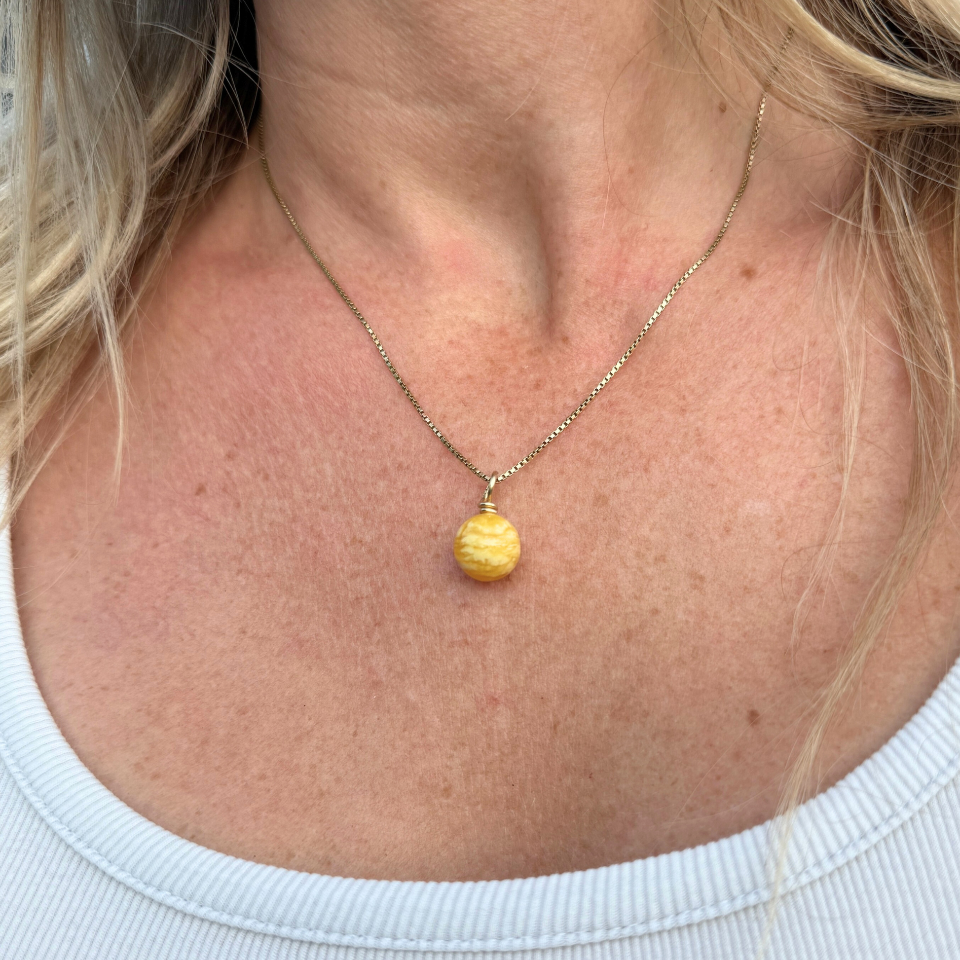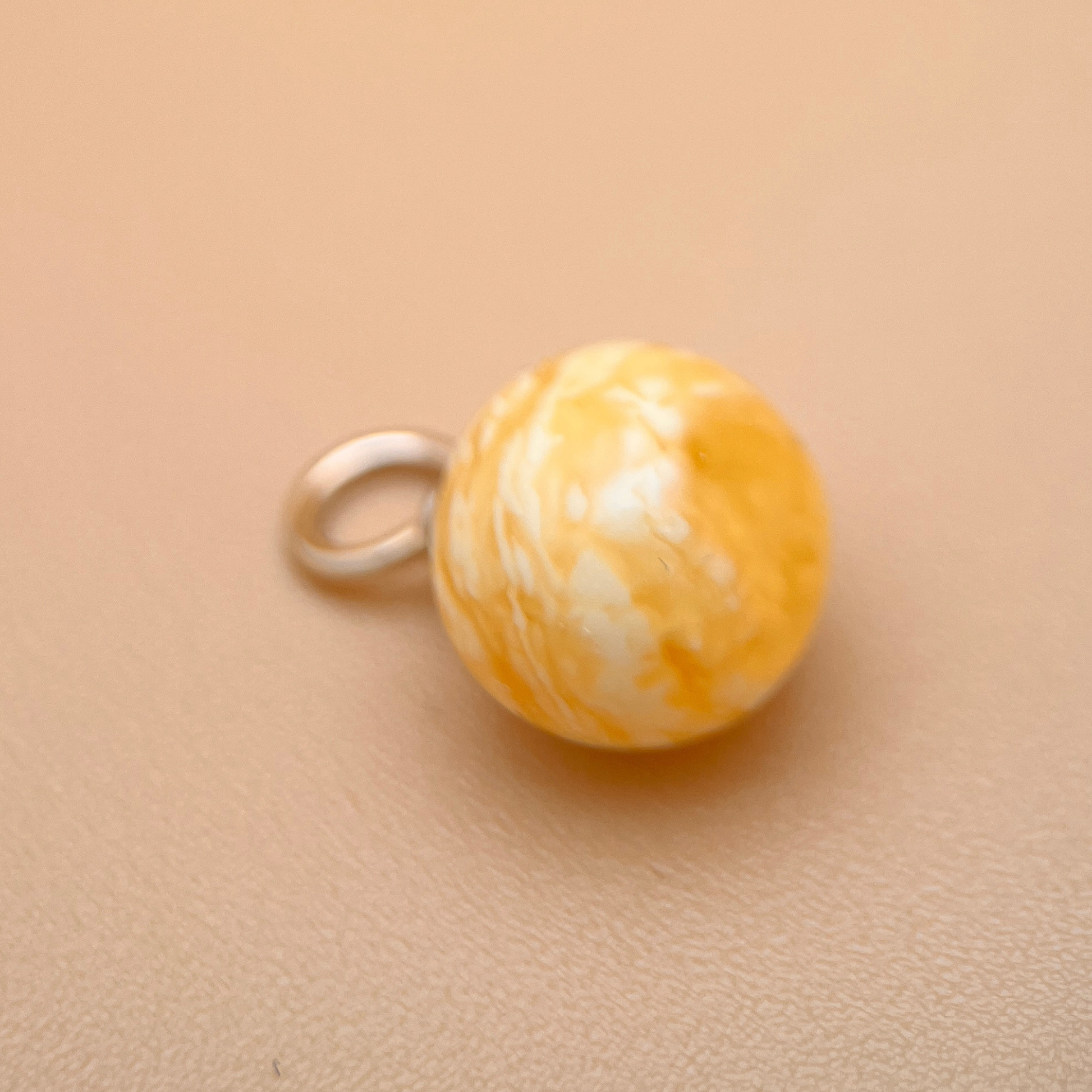 Dieser Anhänger besteht aus einer runden 11-mm-Bernsteinperle mit weichen weißen und gelben Wirbeln – wie zarte, in Stein eingefangene Wolken.