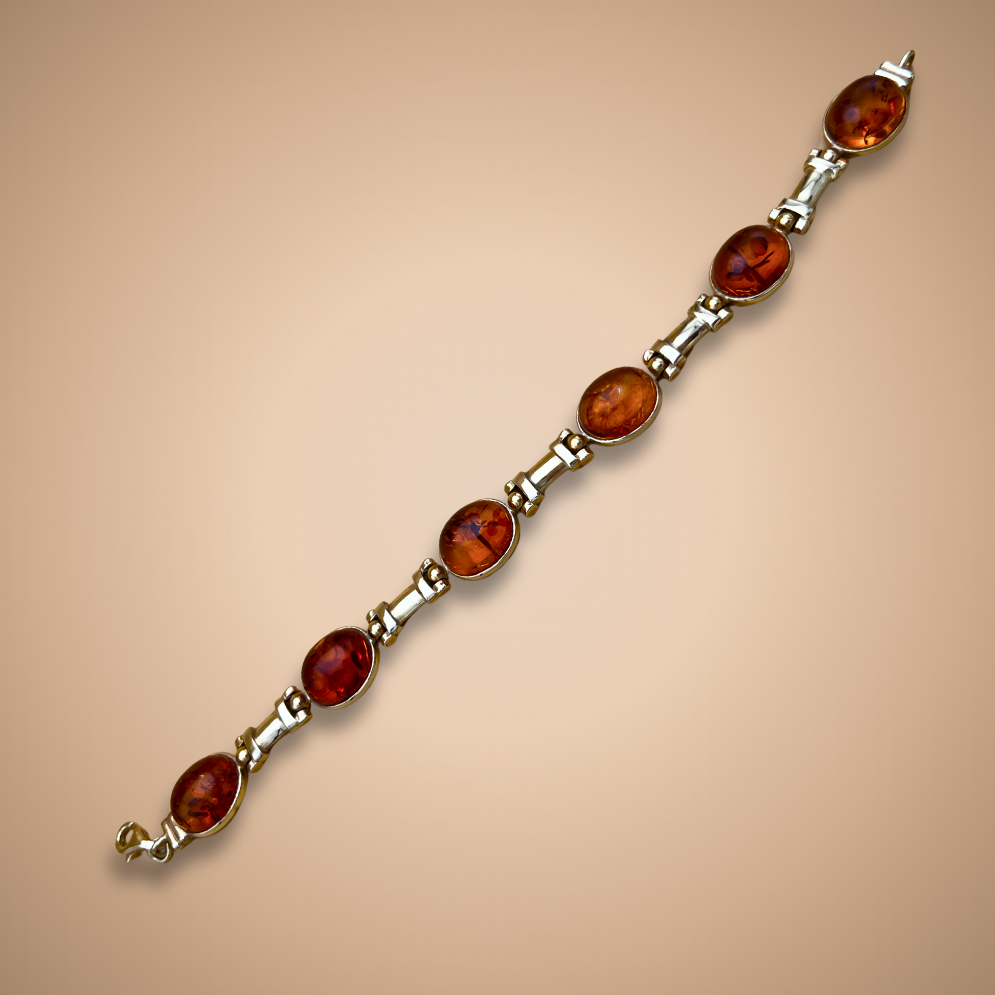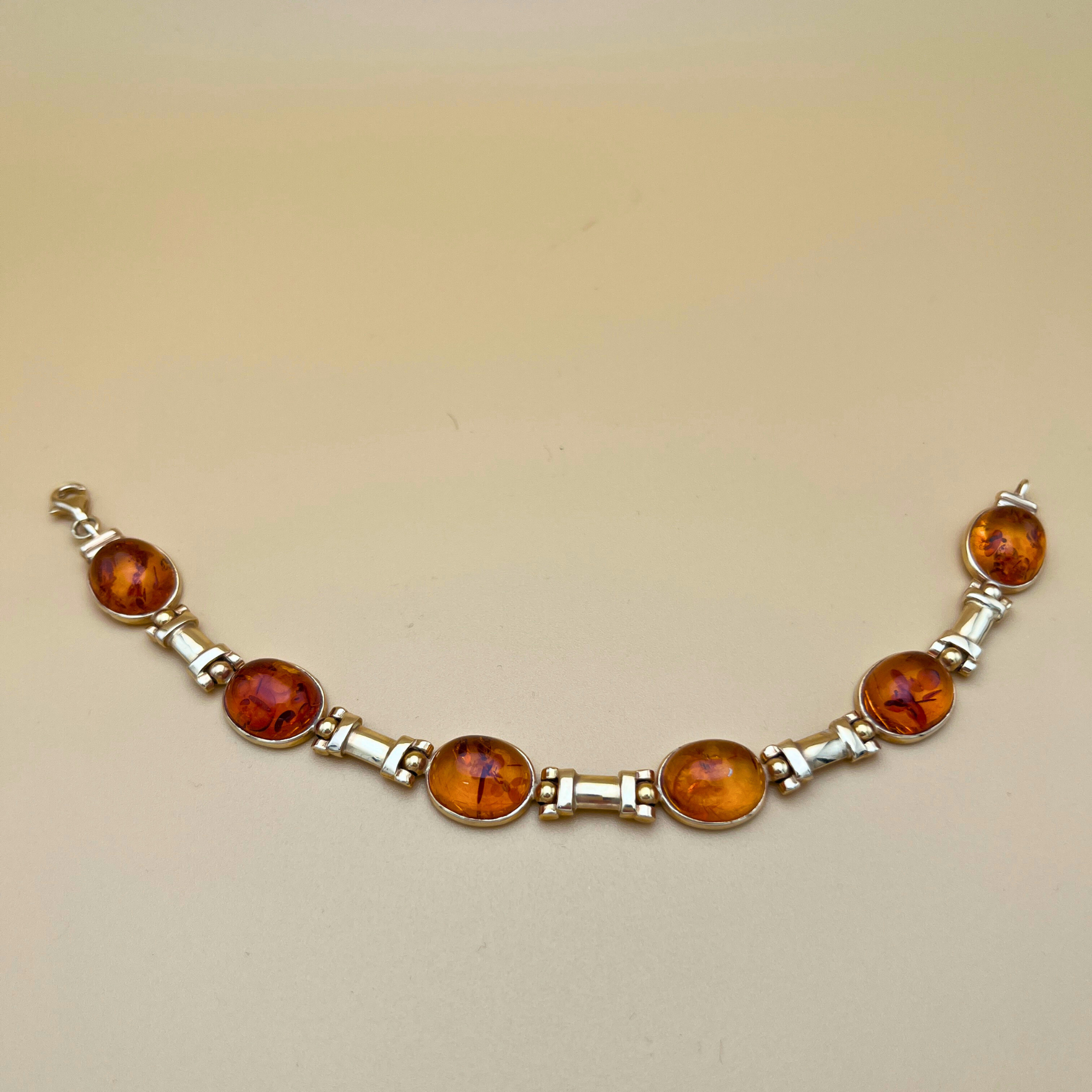 Das Armband aus massivem 14-karätigem Gold besticht durch sieben ovale Bernstein-Cabochons in einem leuchtenden Cognac-Ton. Jede Kuppel weist zarte Oberflächenrisse auf – ein natürliches Ergebnis sanfter Erwärmung –, die einen sanften Schimmer im Inneren und ein Gefühl von Bewegung im Stein erzeugen.