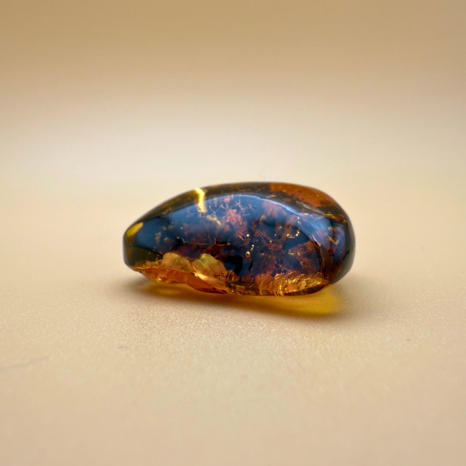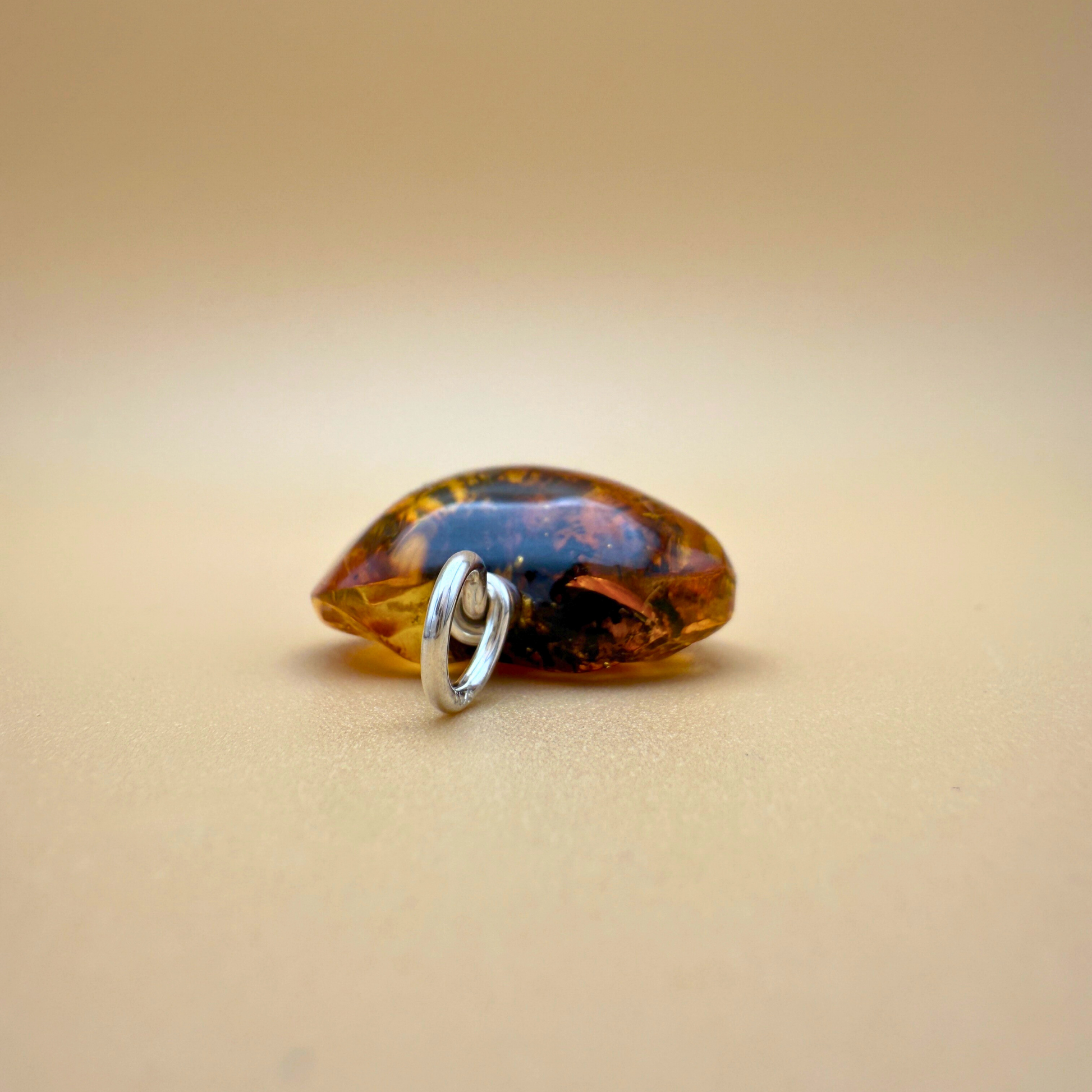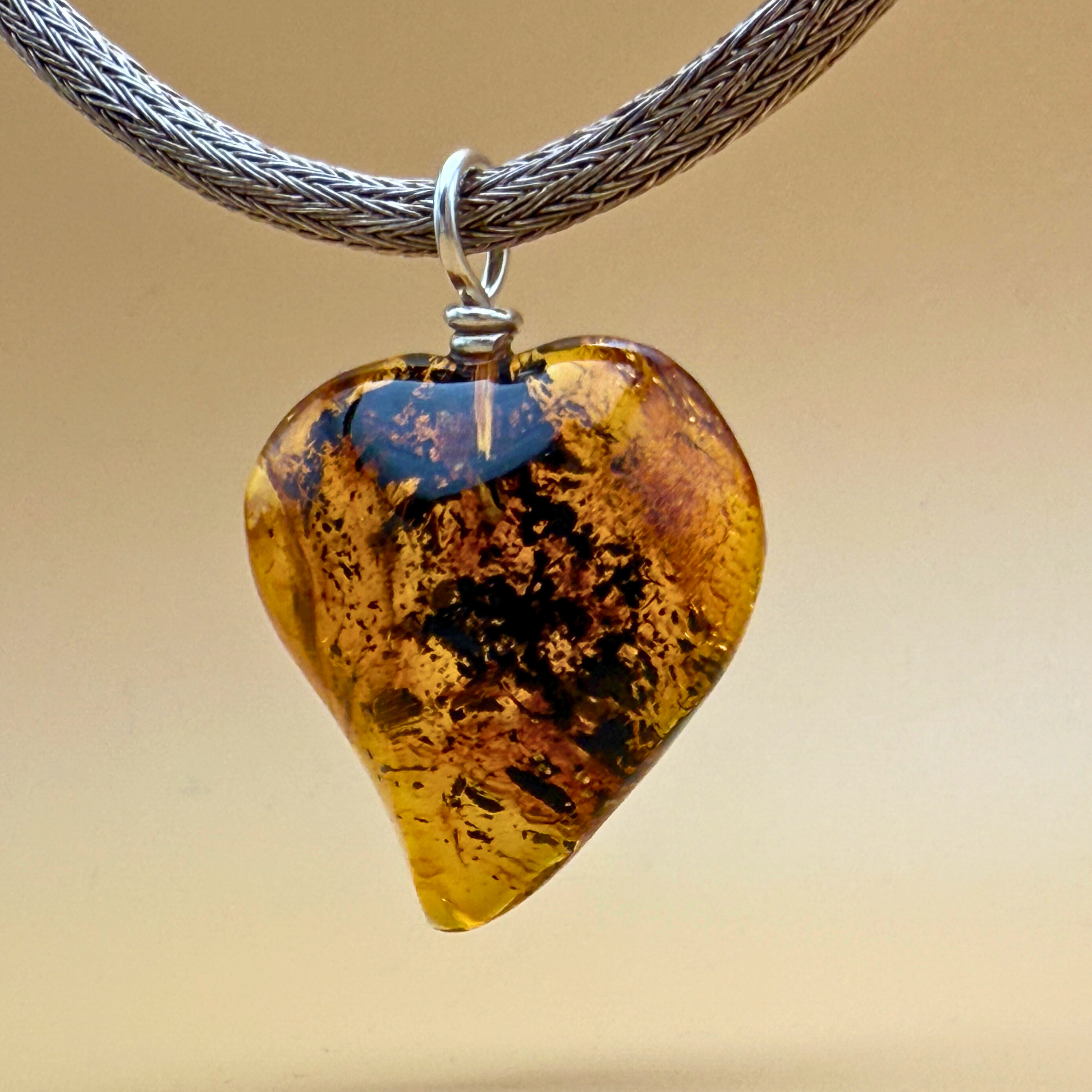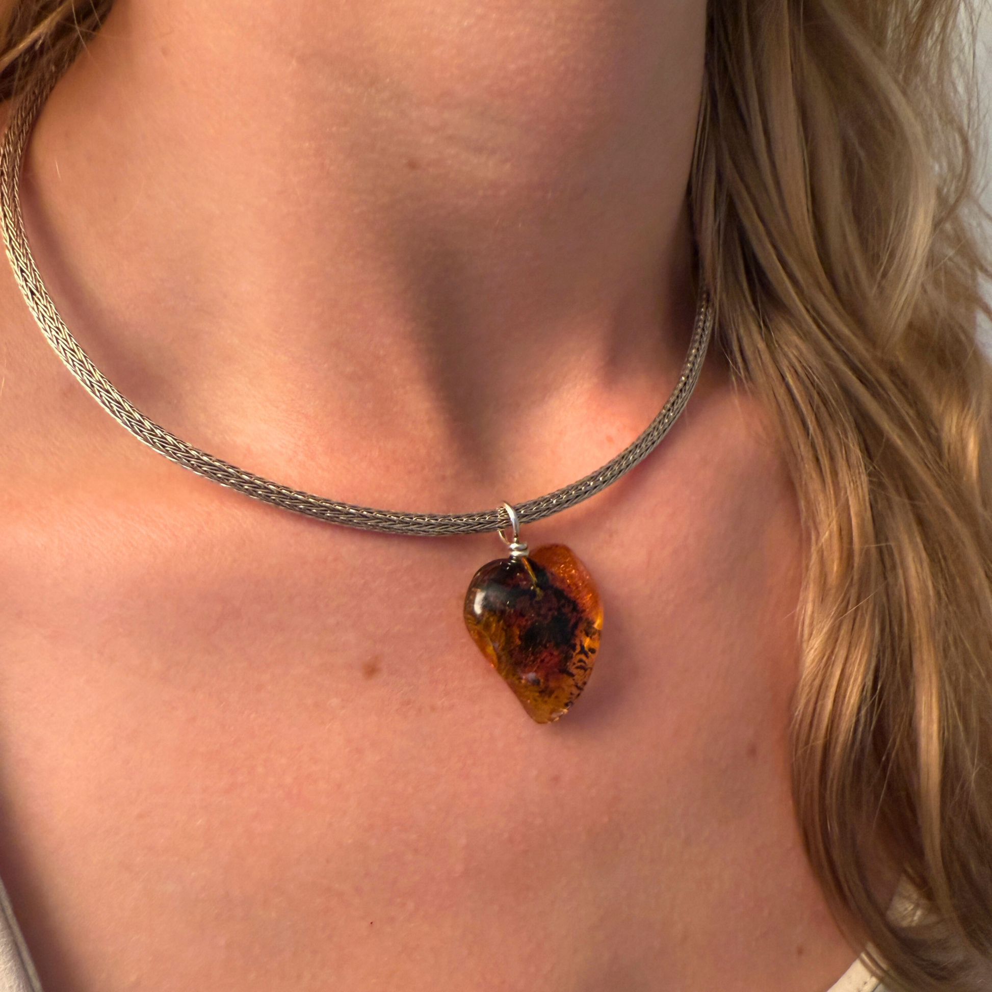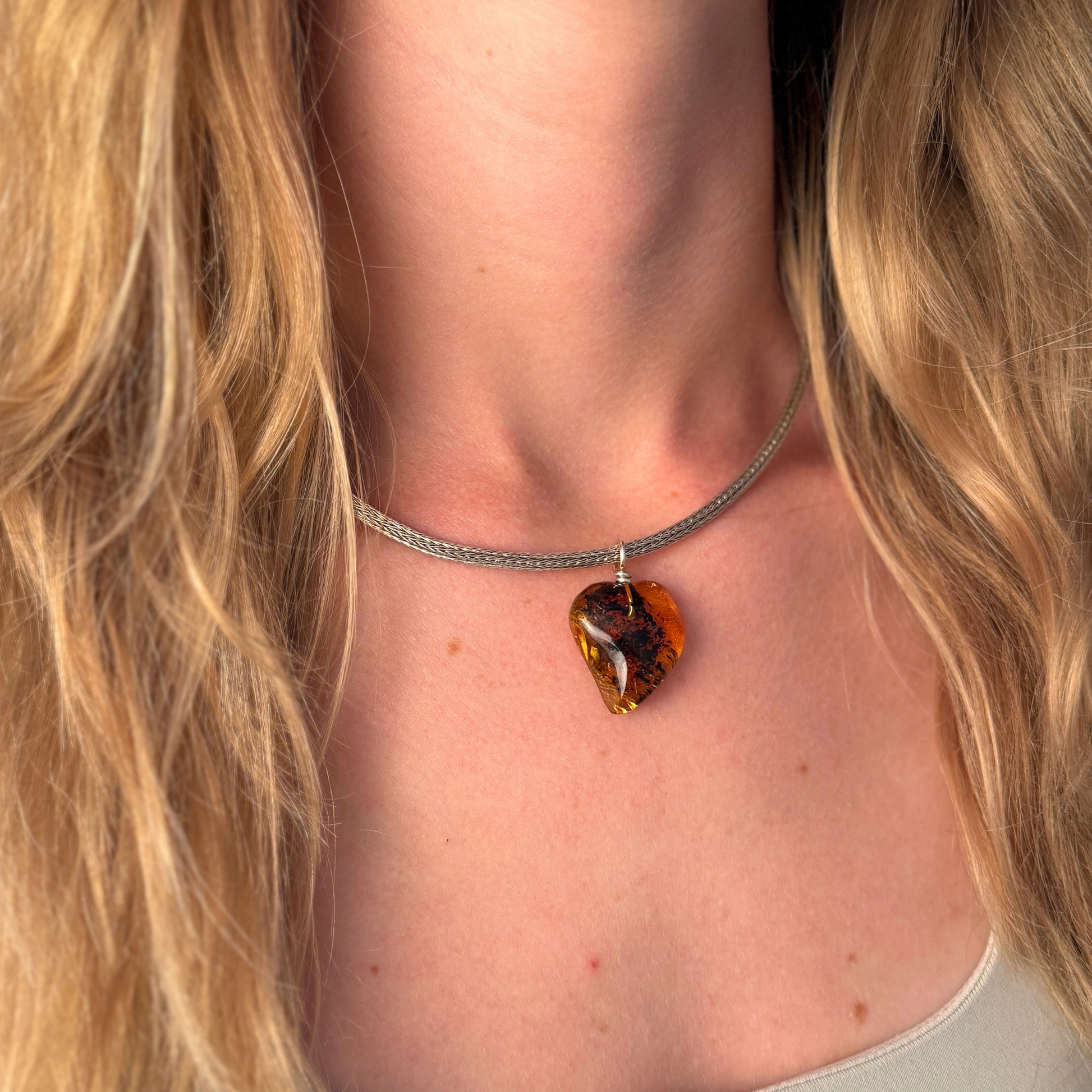 Er besteht aus einem herzförmigen Stück klar gelbem nordischem Bernstein, durchzogen von dunklen Pflanzeneinschlüssen, die eine beeindruckende visuelle Tiefe erzeugen – wie ein Blick in die uralte, lebendige Natur.