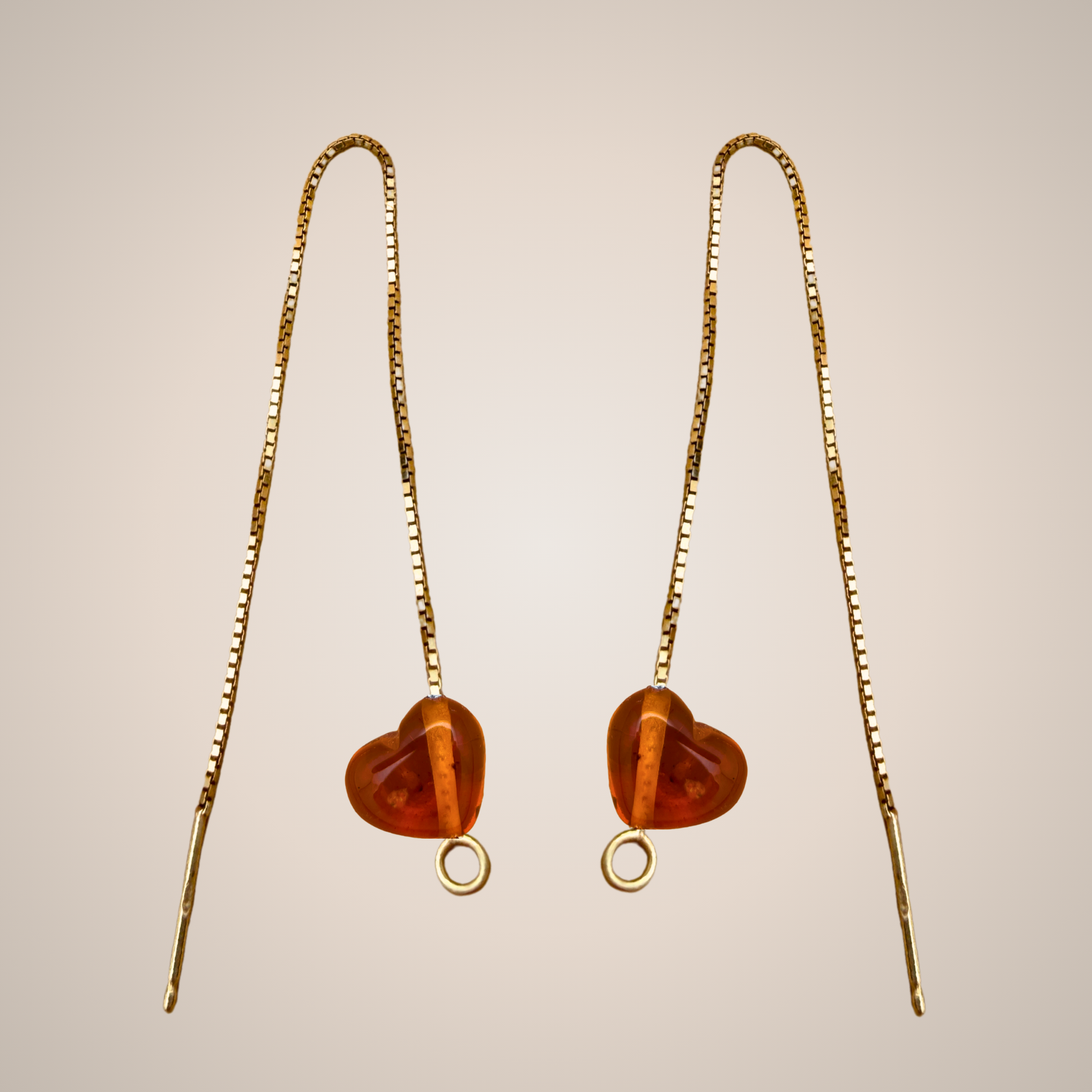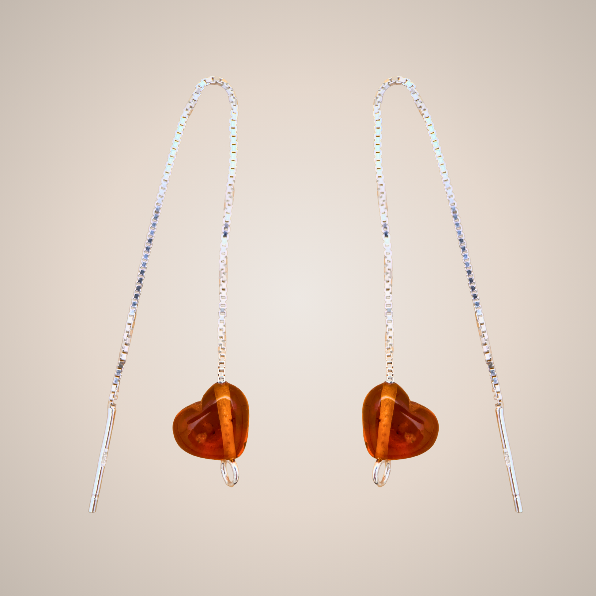 An einem Ende jeder Kette hängt ein helles Cognac-Bernsteinherz , leicht schräg angeordnet, um ein verspieltes und organisches Gefühl zu erzeugen. Der warme, klare Ton des Bernsteins fängt das Licht wunderschön ein, während die Ohrringe schwingen, und verleiht Ihrem Look einen natürlichen goldenen Schimmer.