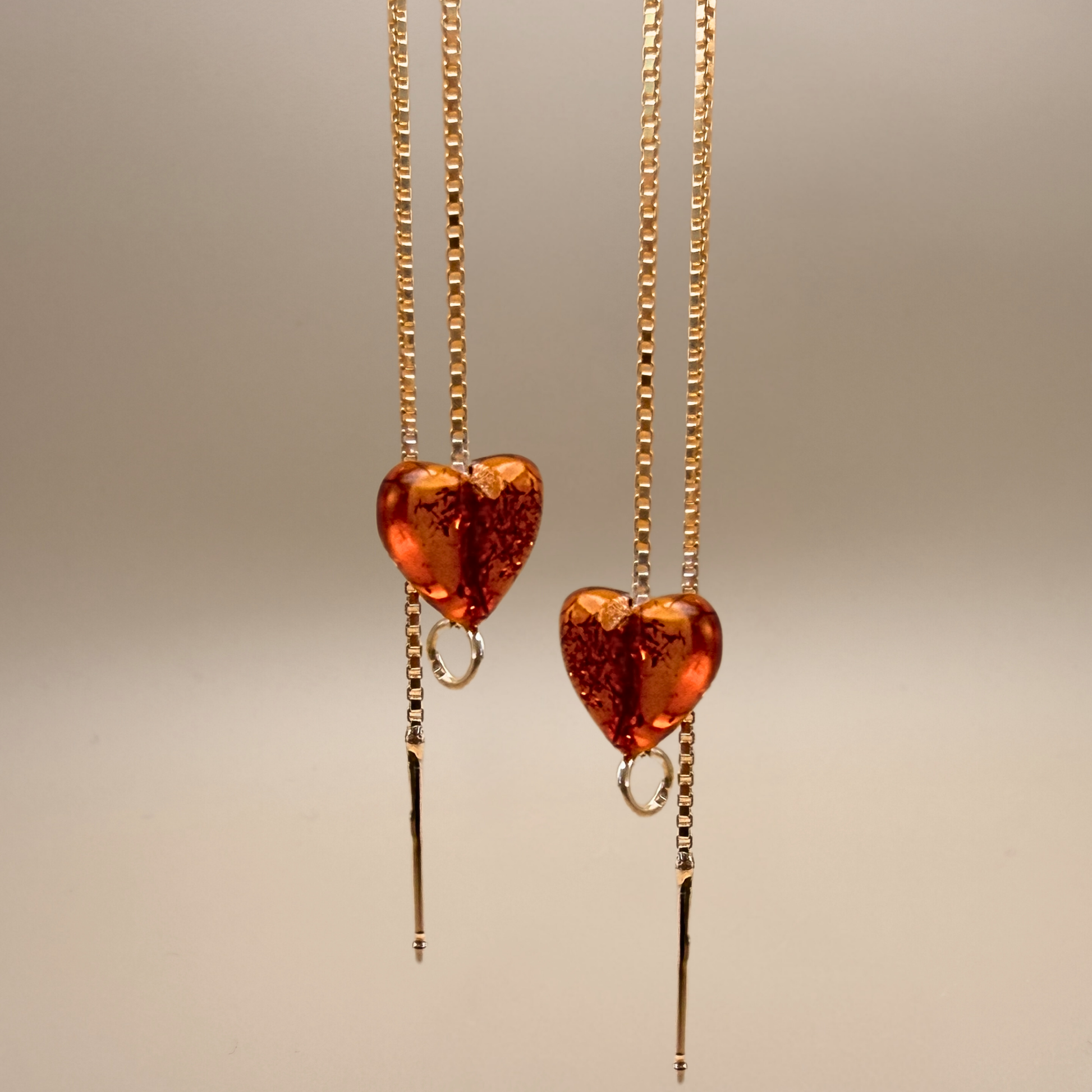 An einem Ende jeder Kette hängt ein helles Cognac-Bernsteinherz. Der warme, klare Ton des Bernsteins fängt das Licht wunderschön ein, während die Ohrringe schwingen, und verleiht Ihrem Look einen natürlichen goldenen Schimmer.