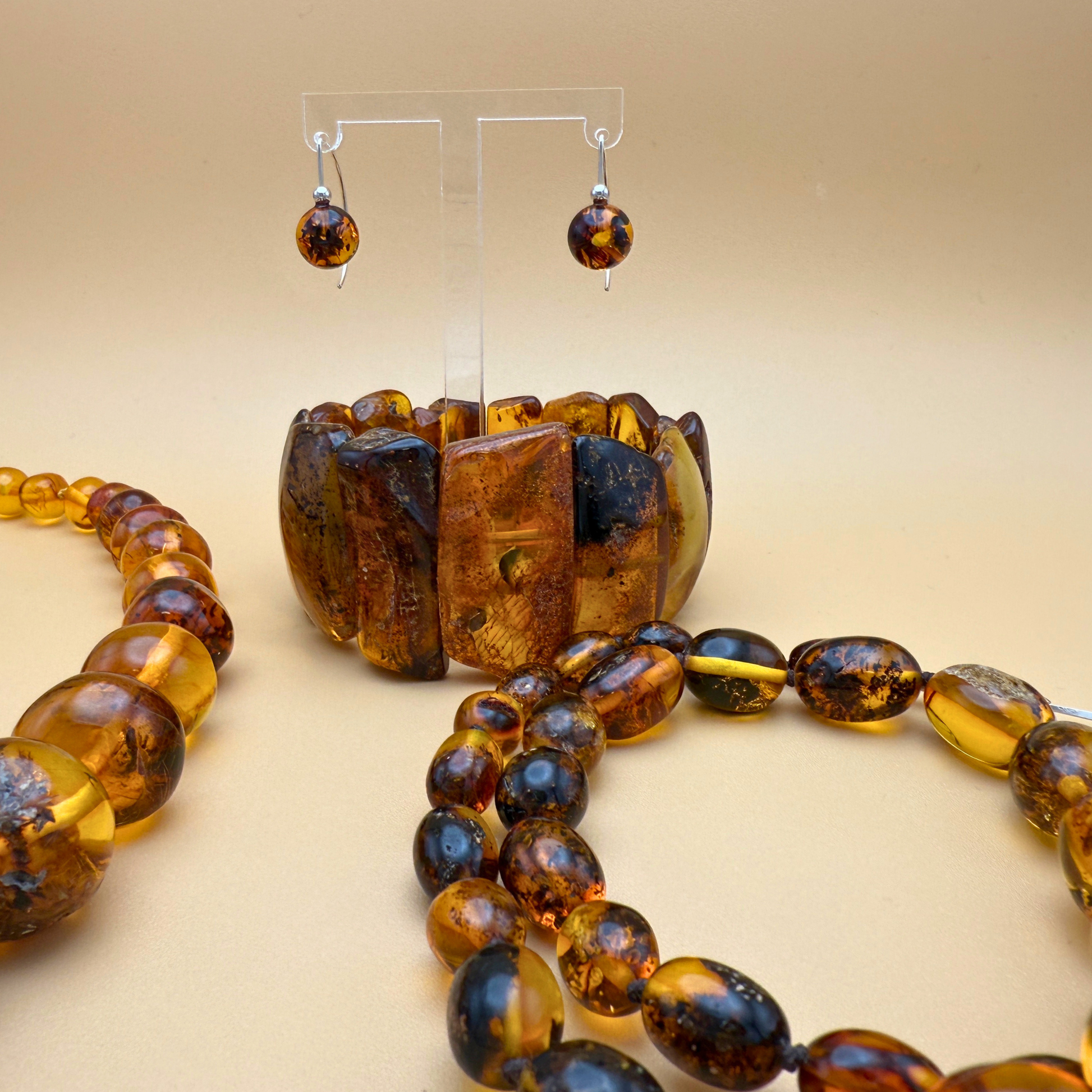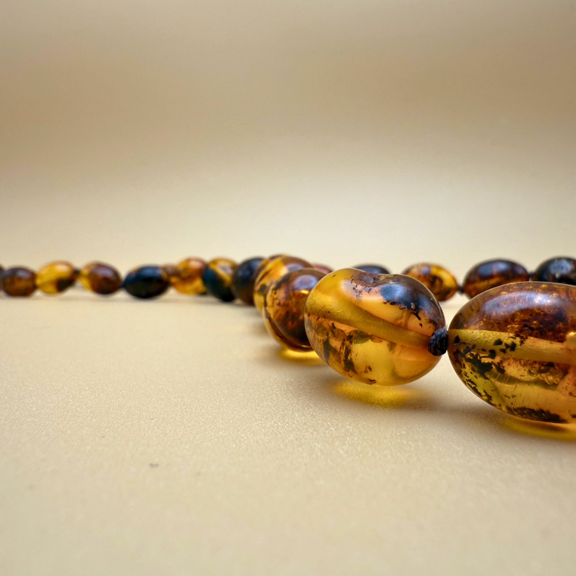 Die Mosslight-Kette besteht aus zitronengelbem Bernstein mit natürlichen Einschlüssen, die jeder Perle ein individuelles Aussehen verleihen. Die dunklen grünlichen bis fast schwarzen Details bilden einen deutlichen Kontrast im hellen Bernstein und prägen das charakteristische Erscheinungsbild dieser Kette. Diese Farbkombination kommt in der Natur vor, ist jedoch selten – daher ist dieses Stück ein echtes Unikat.