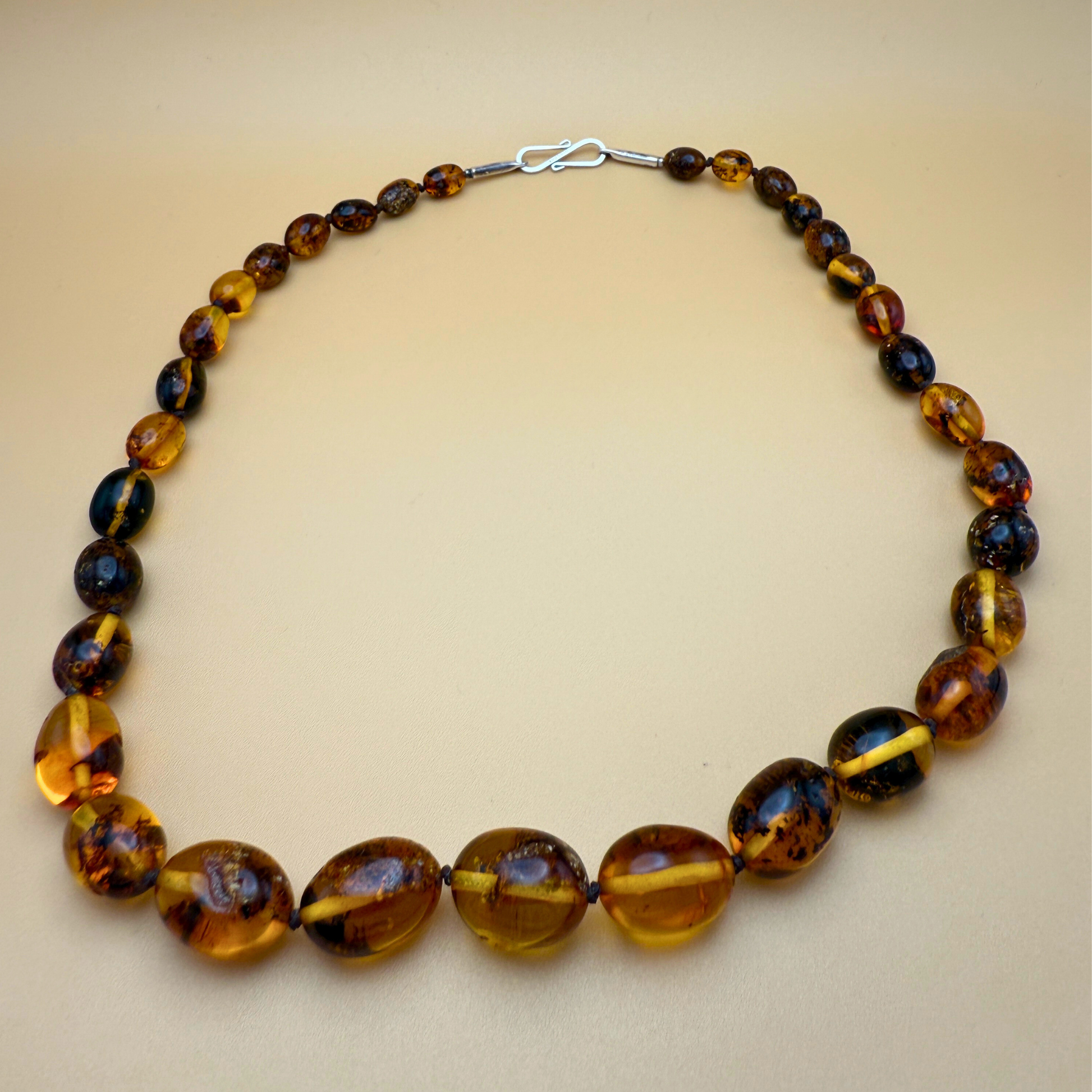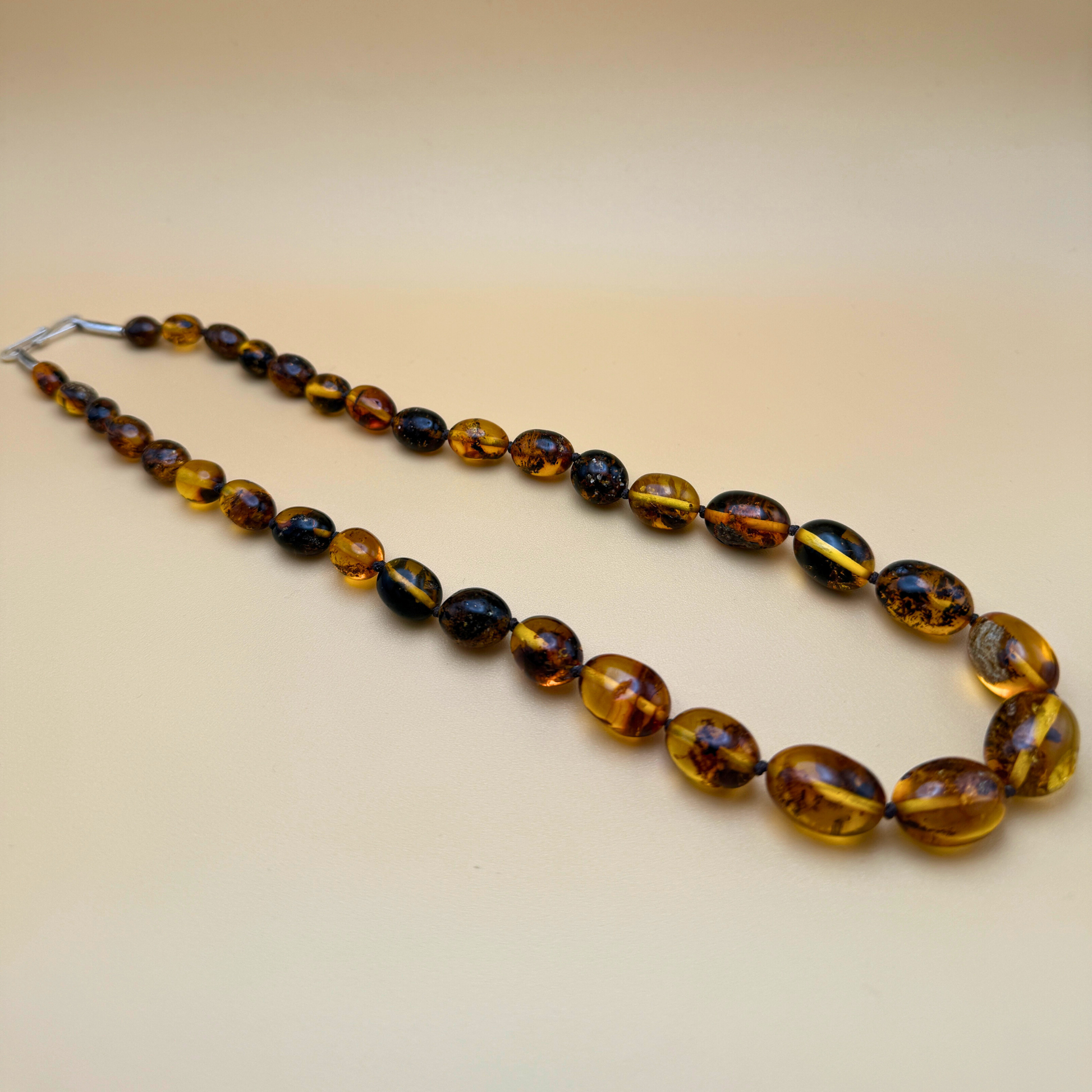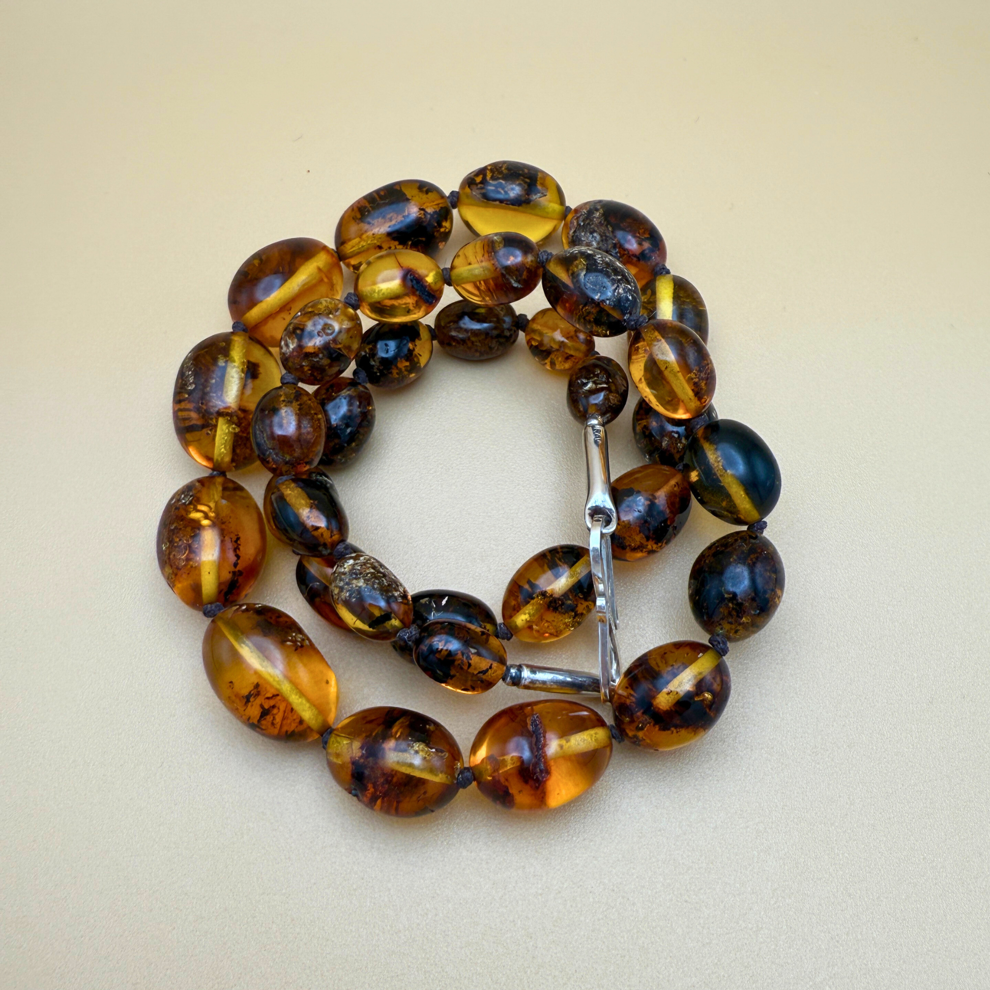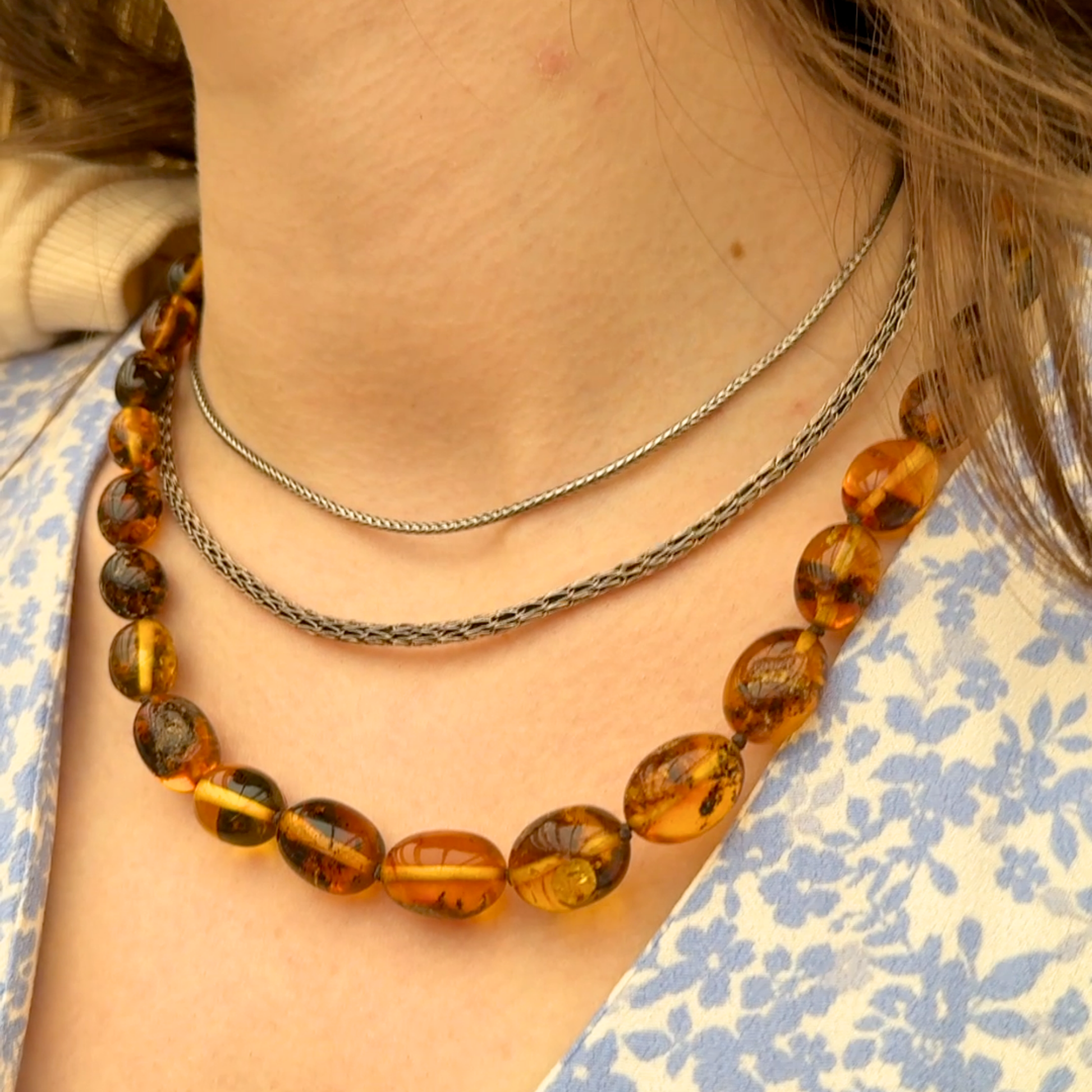Die ovalen Perlen sind von Hand einzeln verknotet, um den Bernstein zu schützen und ein ruhiges, vollständiges Gesamtbild zu schaffen. Abgeschlossen wird die Kette mit einem handgefertigten Silberverschluss aus Sterlingsilber.