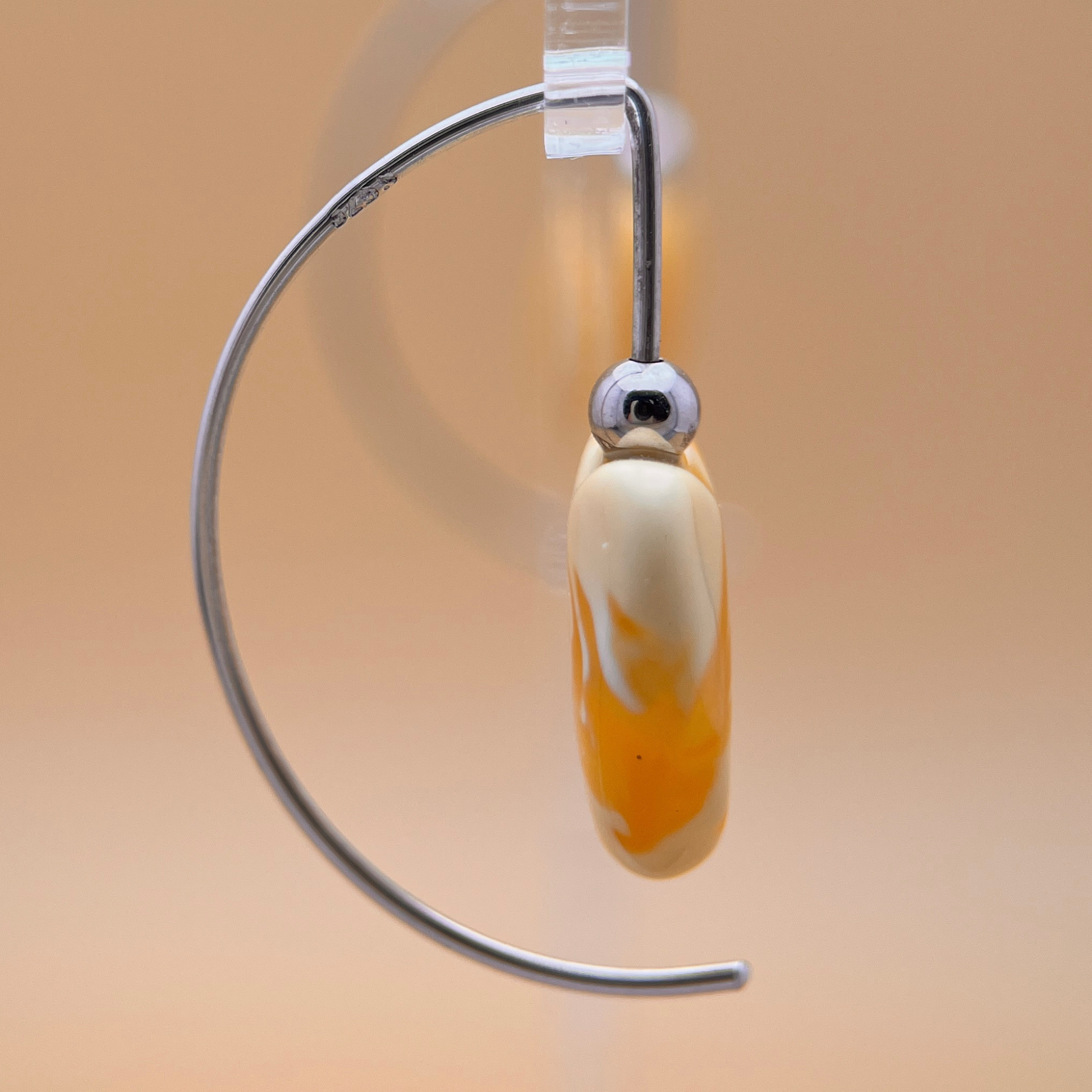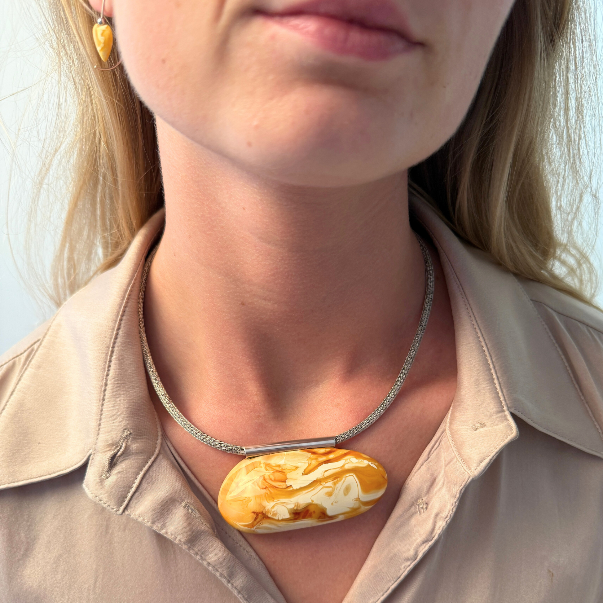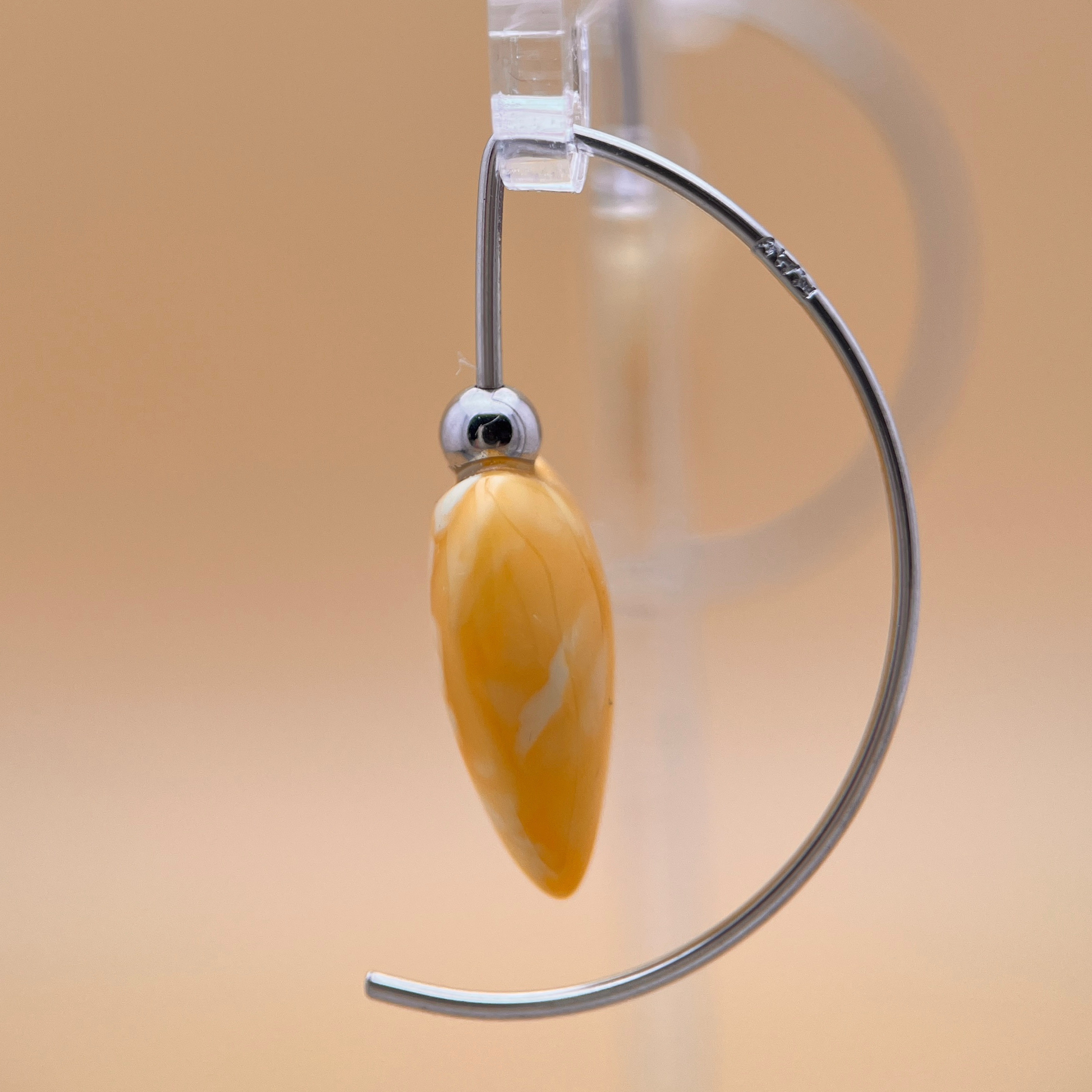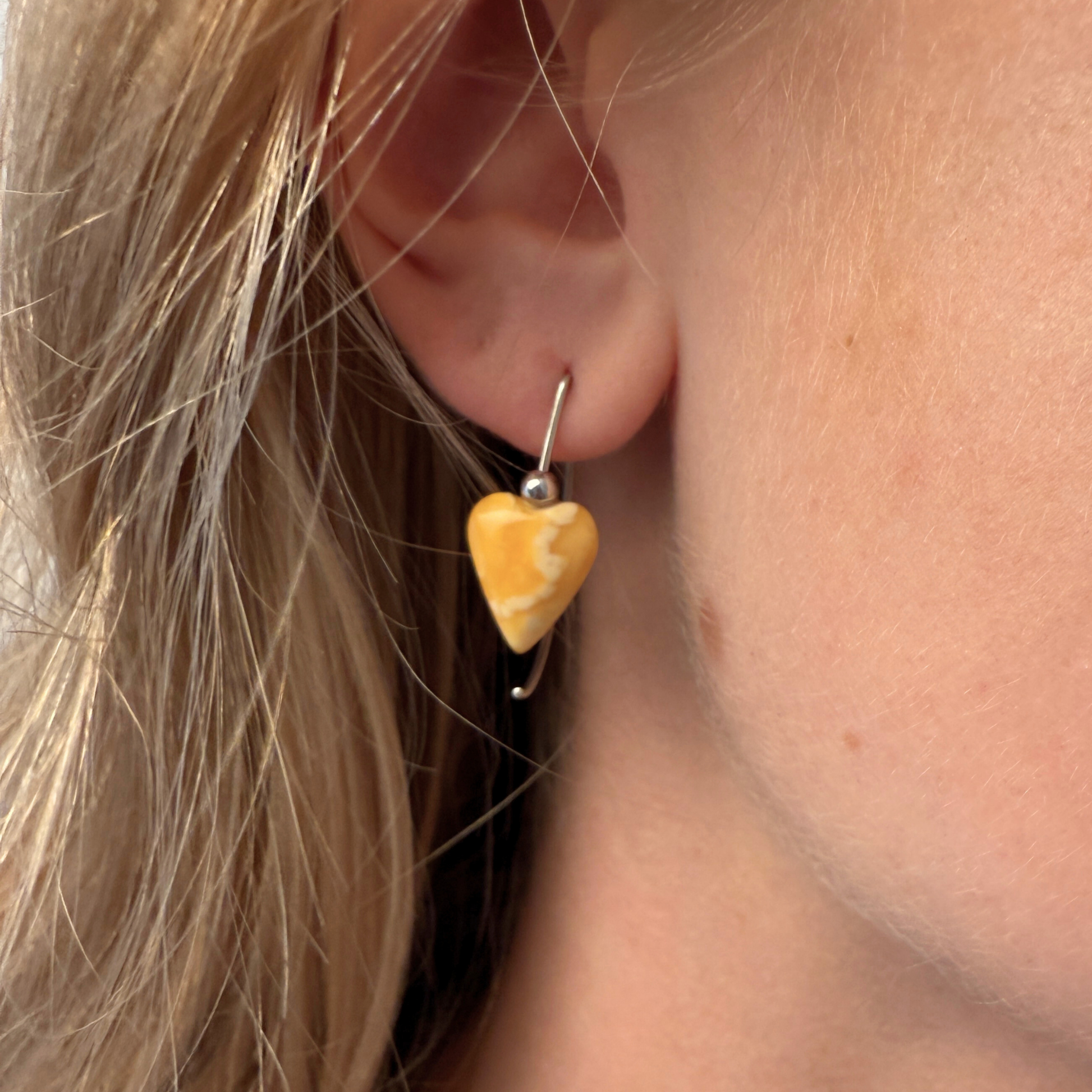 Die sorgfältig geformten Herzen betonen die sanften Wirbel und die warmen, milchigen Töne des Bernsteins. Die Kombination aus Weiß und Hellgelb verleiht ihnen ein ruhiges, lichtdurchflutetes Aussehen – dezent und charaktervoll zugleich. Diese Ohrringe sind einzigartig und nur dieses Paar erhältlich.