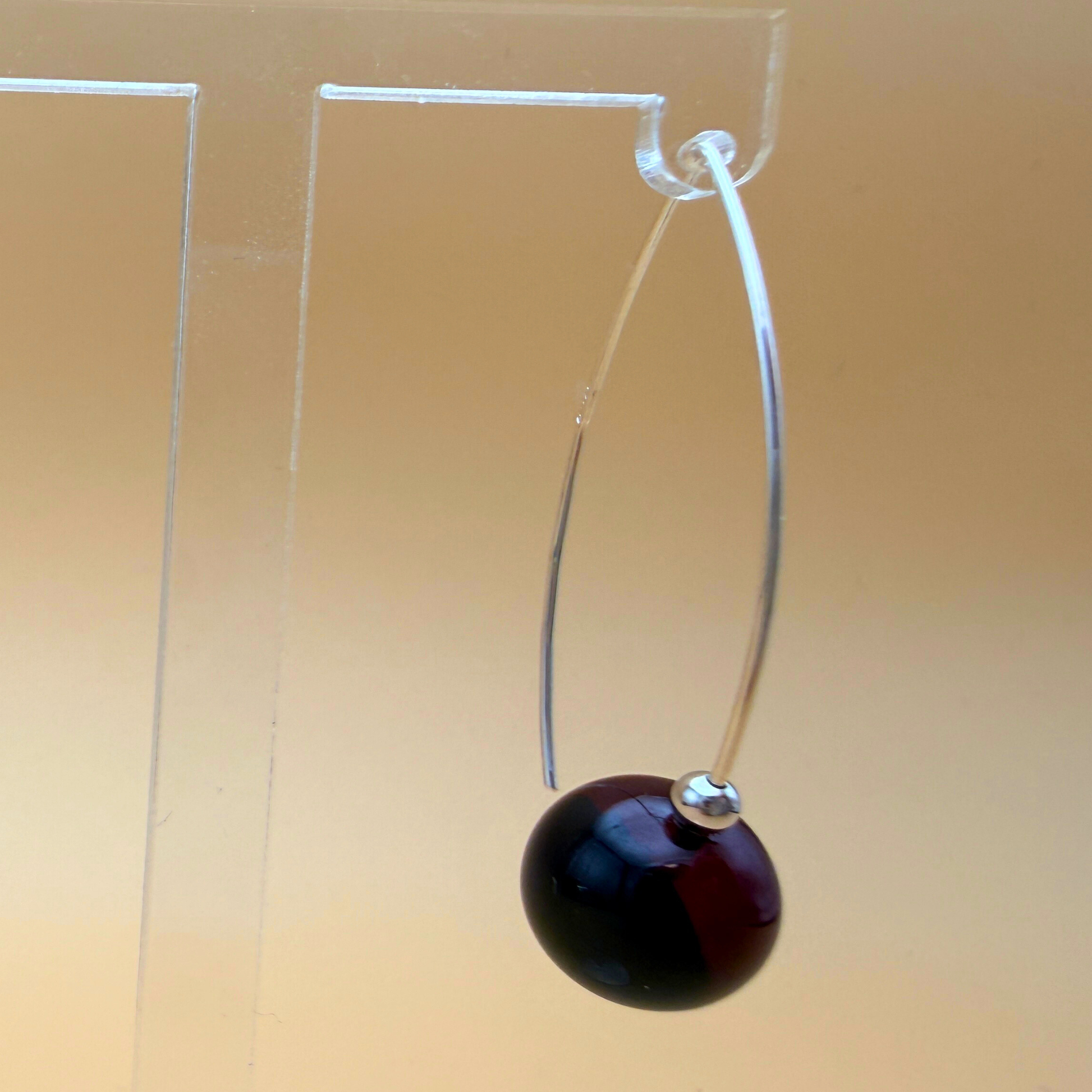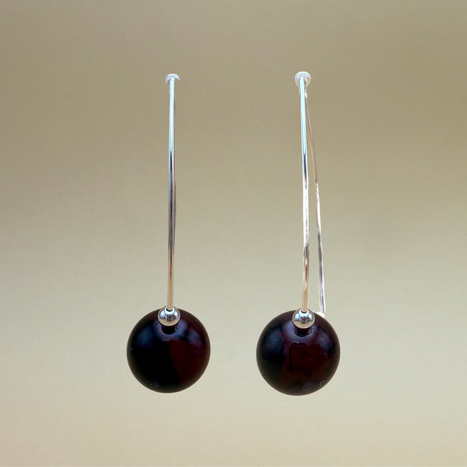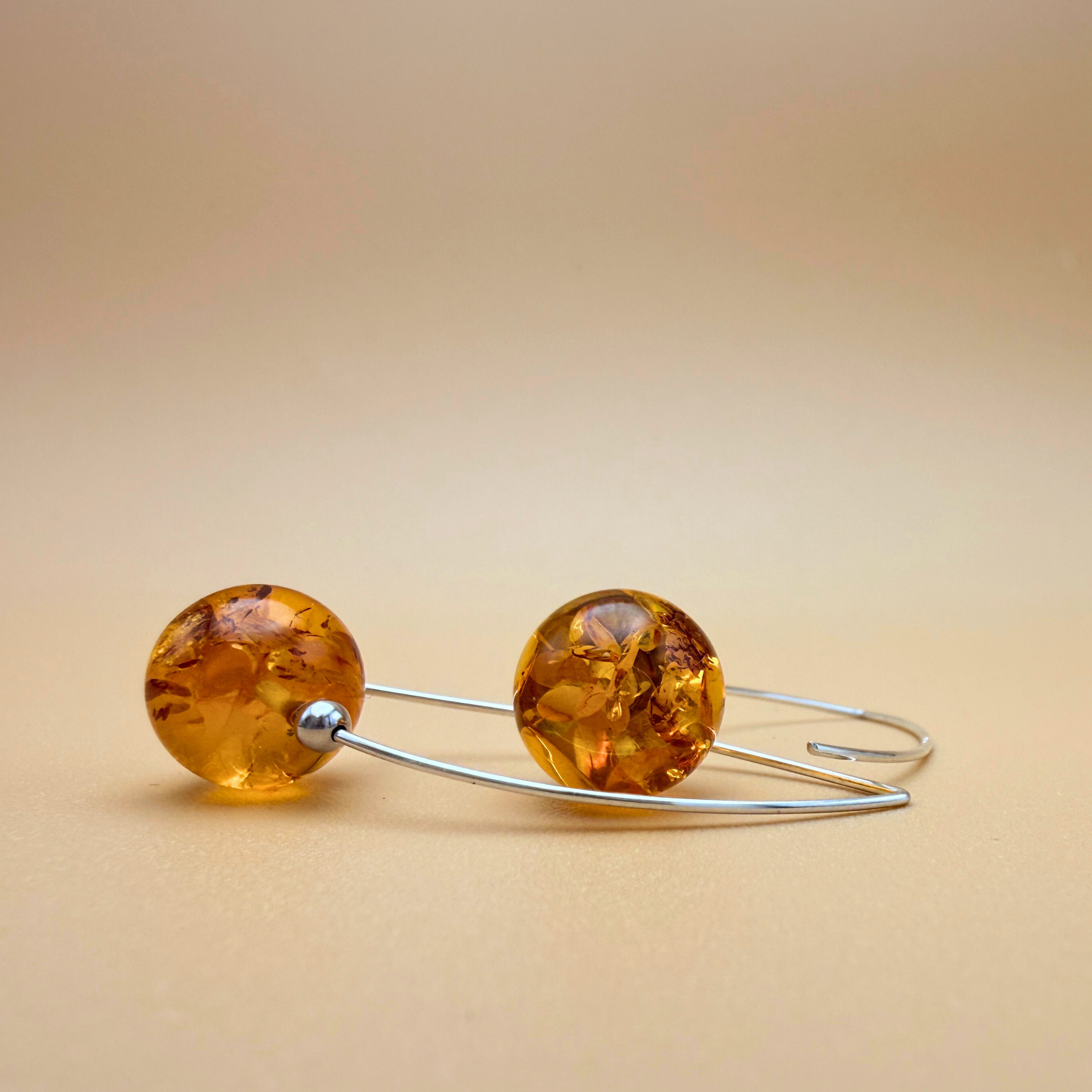 Jedes Paar besteht aus einer runden, 12 mm großen Bernsteinperle, die an einem gebogenen, 0,9 mm dicken Sterlingsilberdraht hängt. Dieser ist etwas länger und erzeugt so eine sanfte Bewegung und eine harmonische Silhouette. Eine kleine Silberperle thront über der Bernsteinkugel und verleiht der Komposition eine klare, minimalistische und unverkennbare Ravgården-Note.