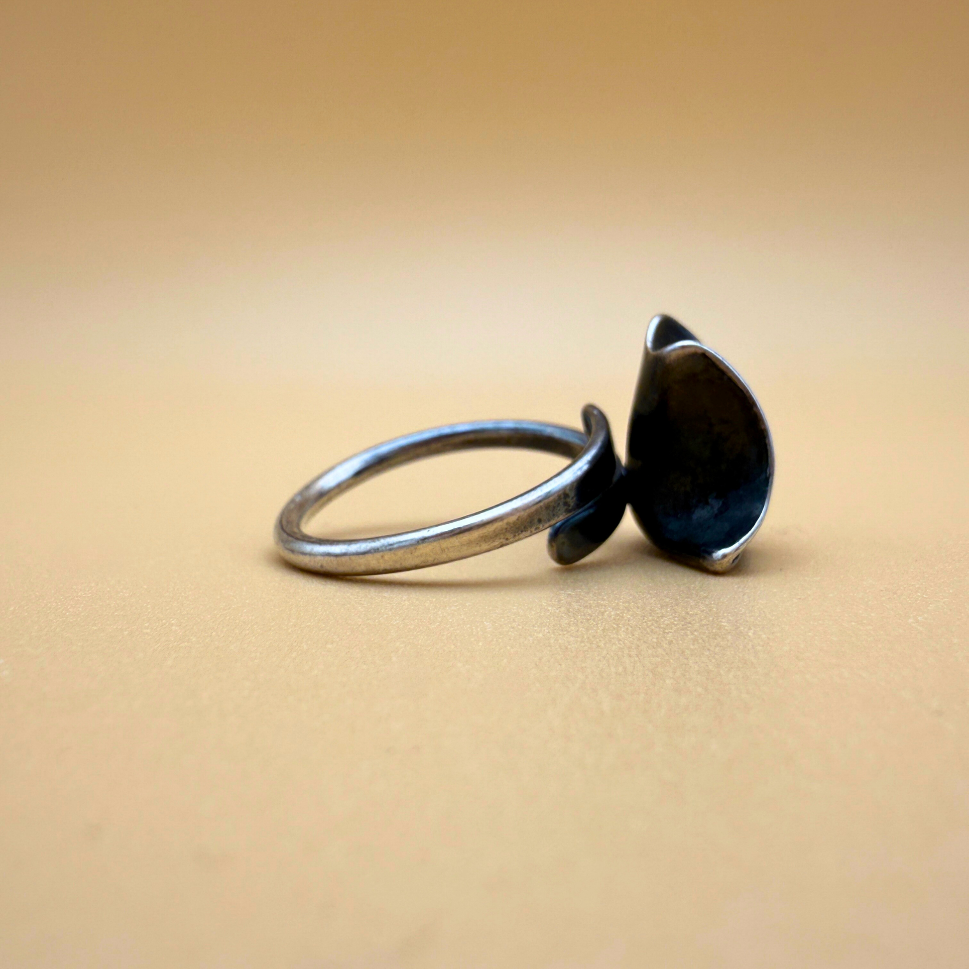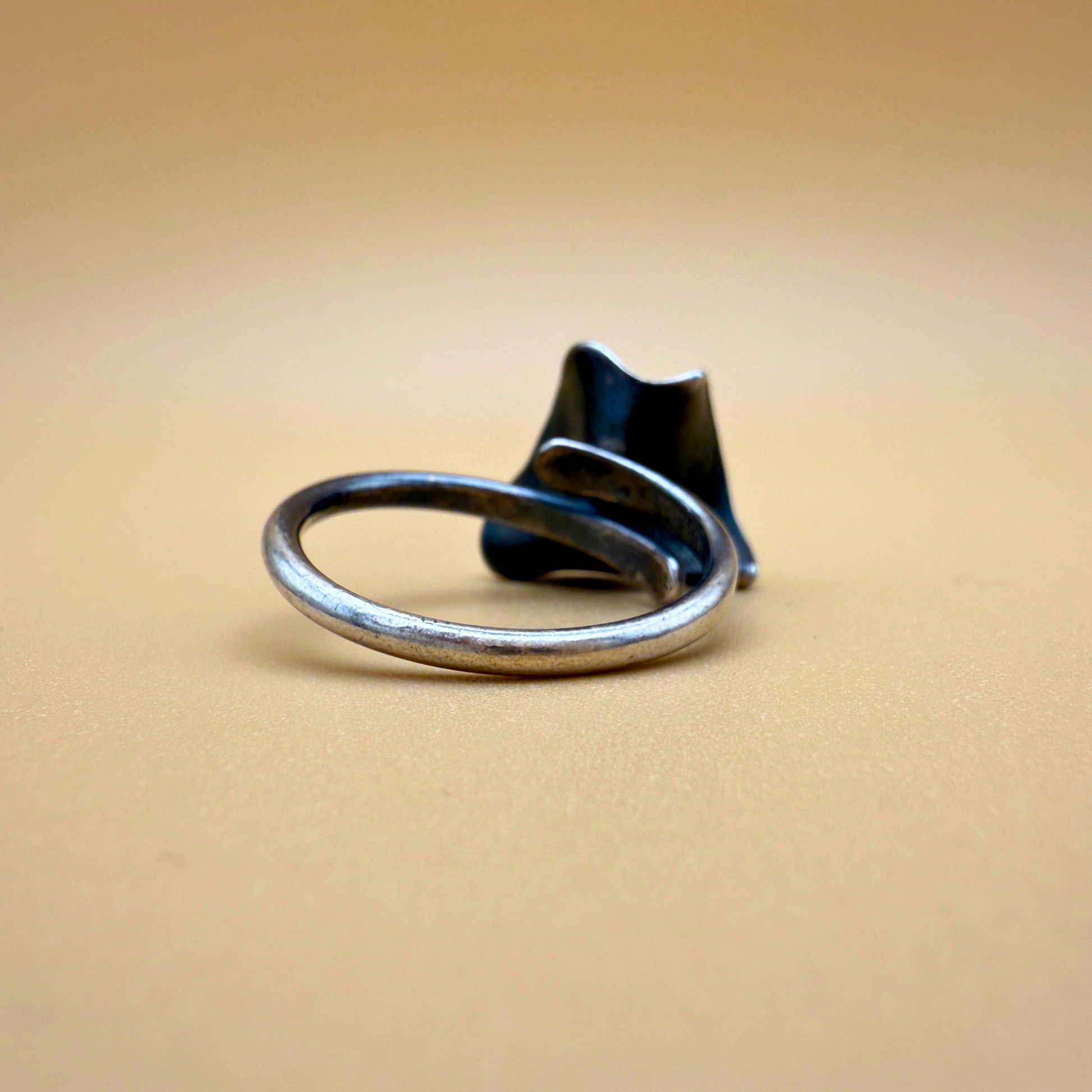 Der Ring wird in unserer Werkstatt in Ravgården vom Entwurf bis zur Endbearbeitung aus oxidiertem 925er Sterlingsilber handgefertigt. Die Oberfläche ist abgedunkelt, um die Texturen hervorzuheben, wodurch der Bernstein in seiner Fassung noch wärmer leuchtet.