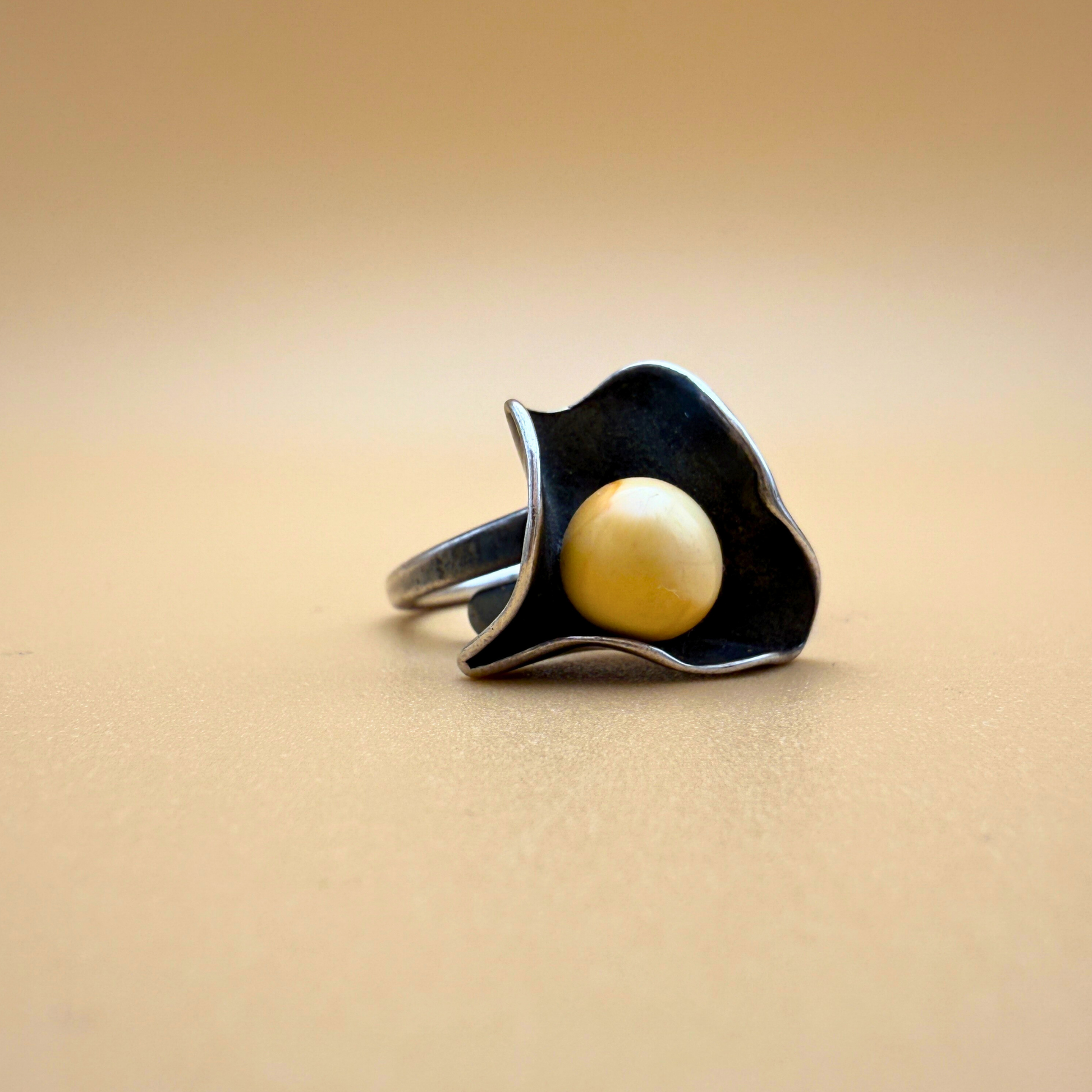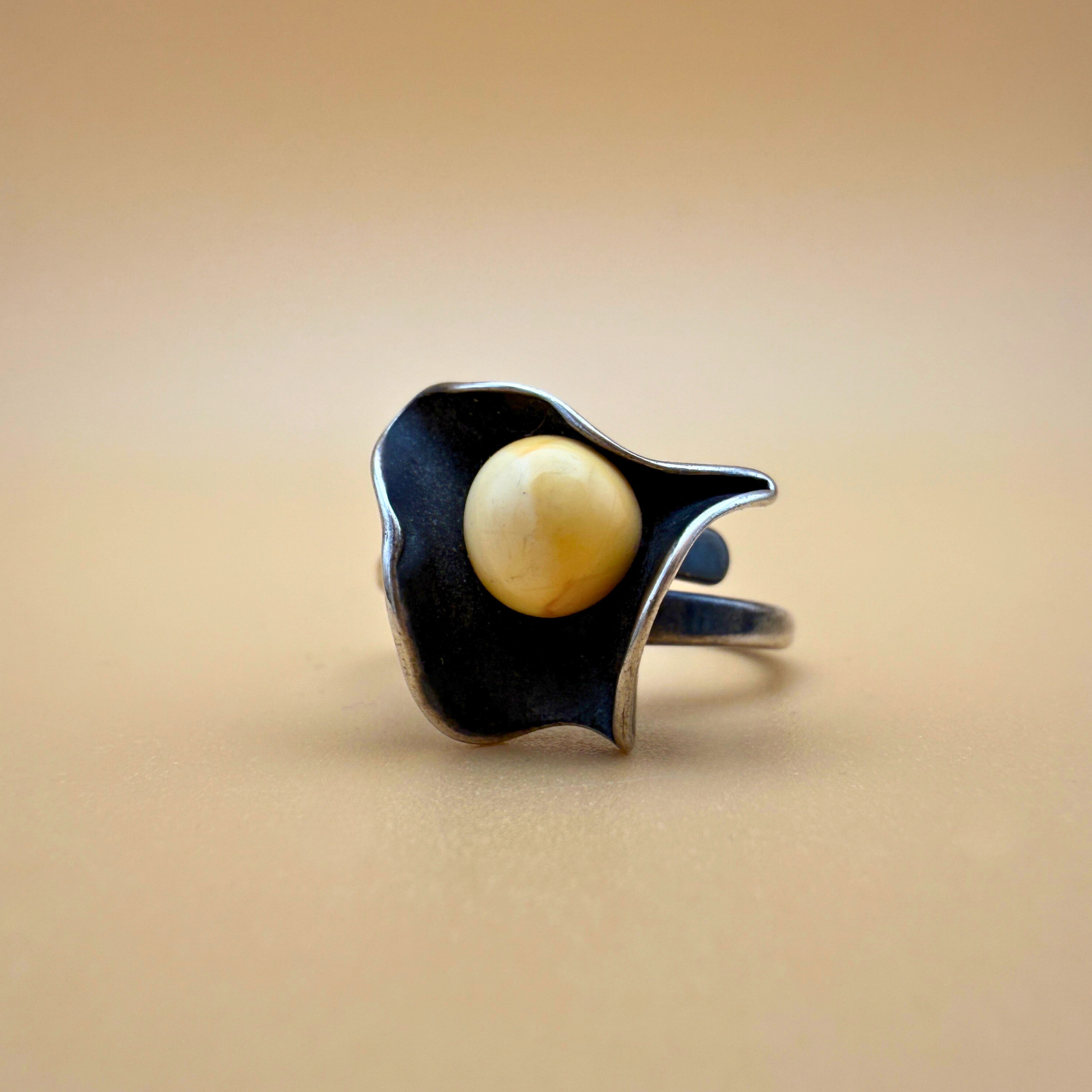 Inspiriert von den weichen Linien von Muscheln und Meeresbewohnern ist der Østers Ring eine skulpturale Hommage an das Meer. Seine fließende, organische Silberform umschließt eine einzigartige milchig-weiße Bernsteinperle (7 mm) – sanft abgerundet und natürlich in warmen Gelbtönen gesprenkelt.