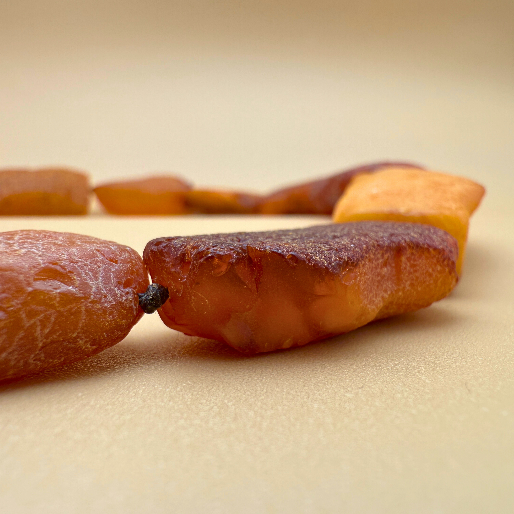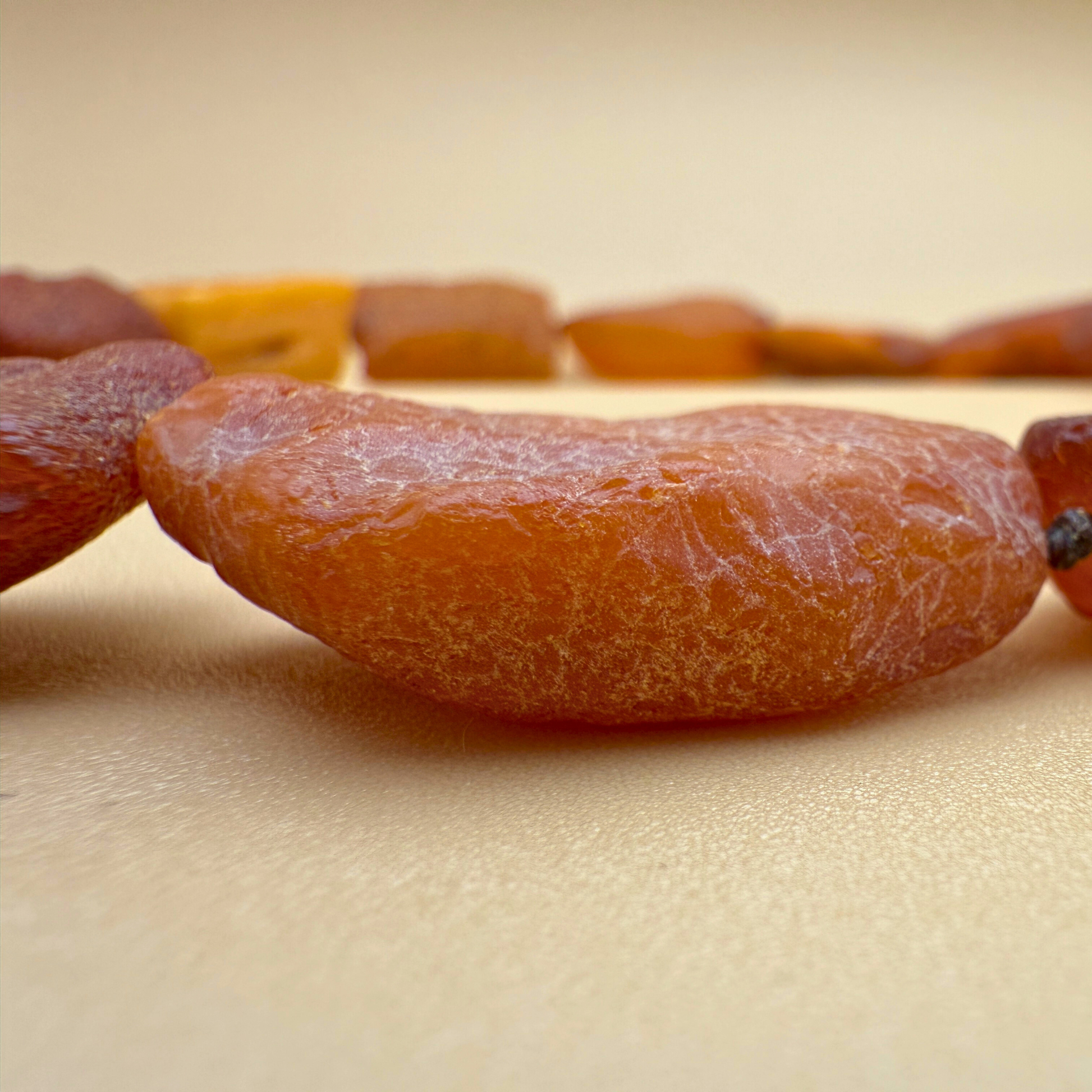 Diese rustikale Bernsteinkette besteht aus großen, naturbelassenen Bernsteinstücken in warmen Farbtönen, ergänzt durch mehrere hellere gelbe Perlen, die für feine Kontraste sorgen. Eine der gelben Perlen liegt vorne und setzt einen ruhigen Akzent.