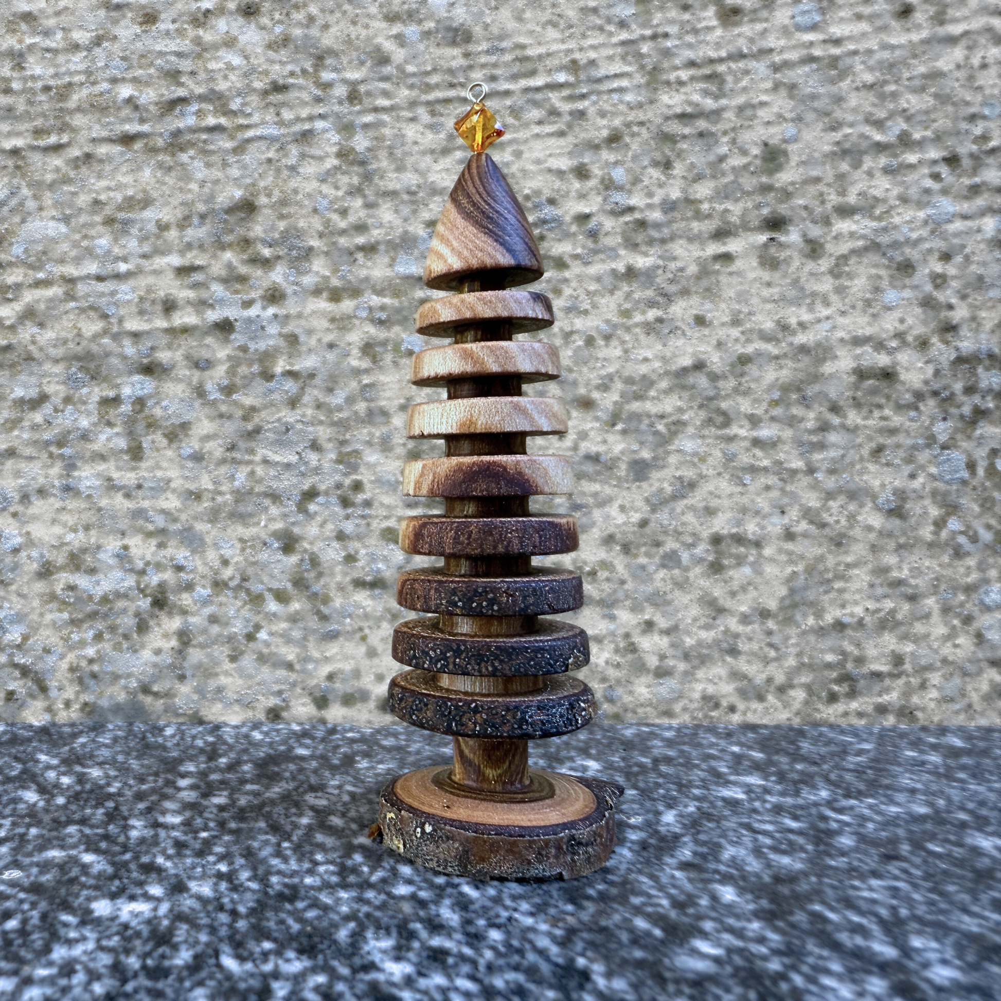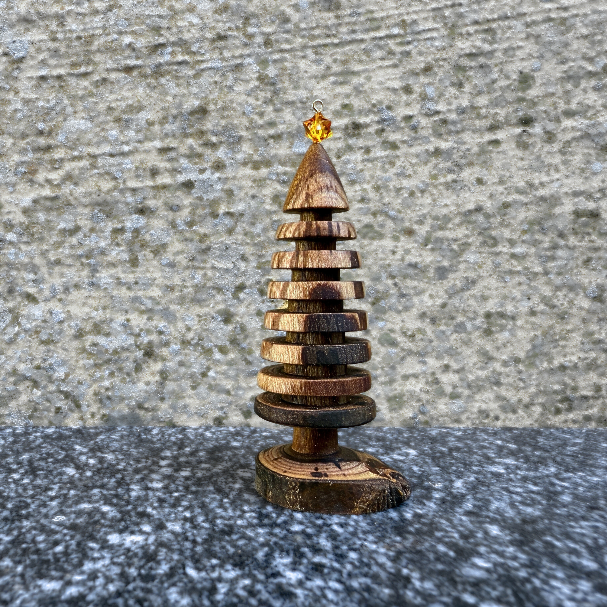 Die Bäumchen sind zwischen 8,5 und 12,3 cm groß und mit einem zierlichen bernsteinfarbenen Stern sowie einer kleinen Schlaufe versehen, sodass sie frei auf ihrem Holzsockel stehen oder als Schmuck am Weihnachtsbaum aufgehängt werden können.