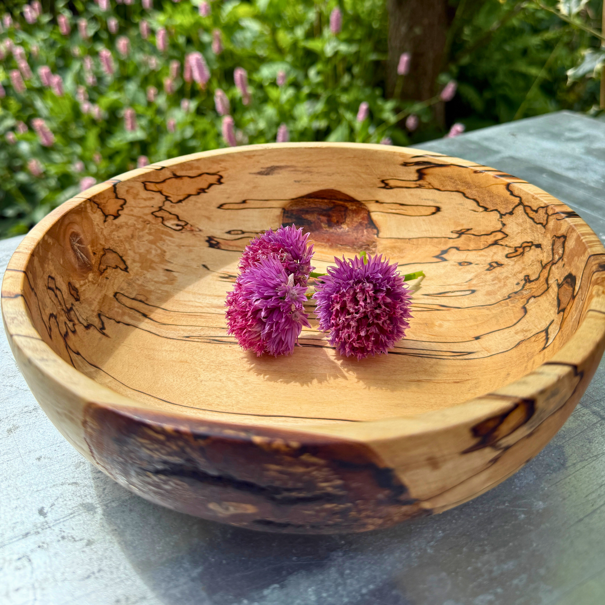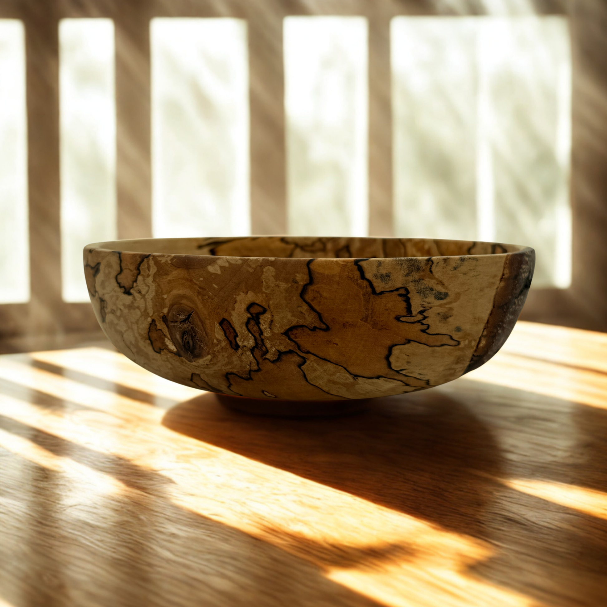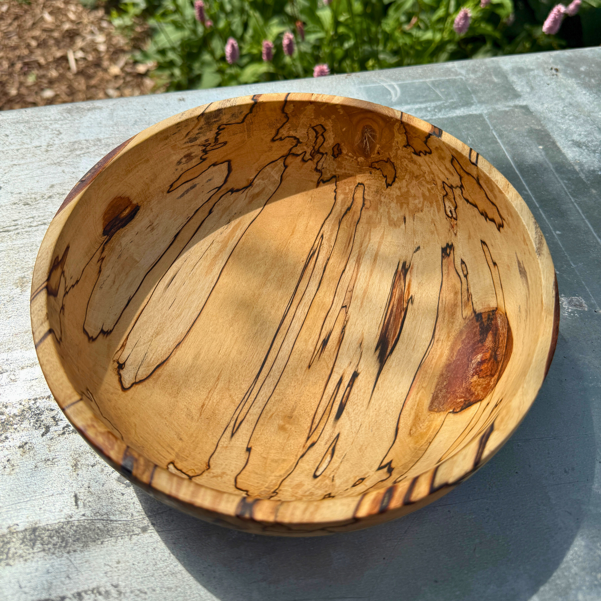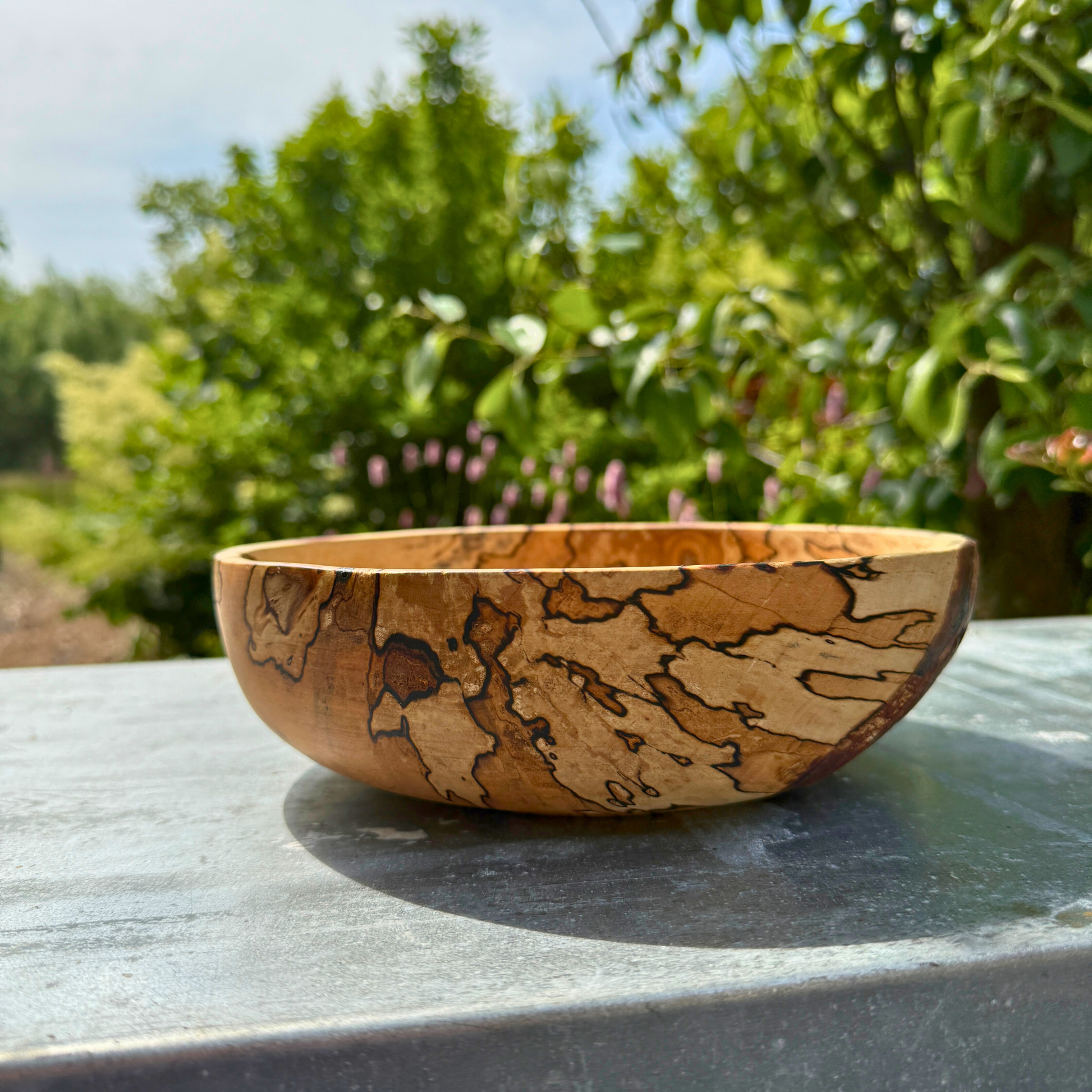 Die Schale weist wunderschöne Spaltmuster auf – natürliche dunkle Linien, die sich mit der Zeit bilden – kombiniert mit einer weichen, abgerundeten Form und einem niedrigen Profil , wodurch sie sich perfekt als Obstschale , Tafelaufsatz oder skulpturales Objekt für Ihr Zuhause eignet.