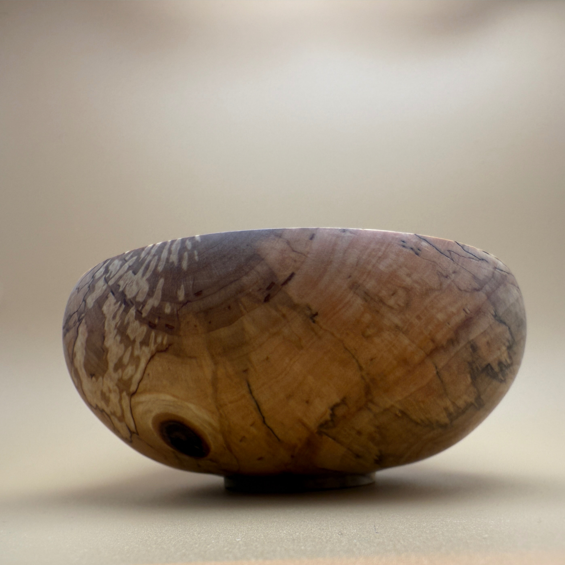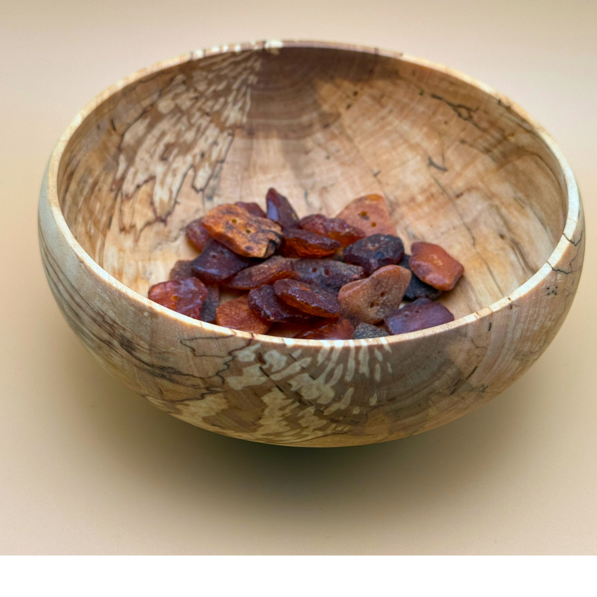 Die Schale ist mit einem lebensmittelechten, farblosen Öl behandelt , das die raue Schönheit und die fühlbare Weichheit des Holzes bewahrt. Auf der Unterseite befindet sich ein kleines , hell cognacfarbenes Bernsteinstück – ein subtiles, charakteristisches Detail, das das Objekt mit Ravgaards Welt der nordischen Natur und Handwerkskunst verbindet.