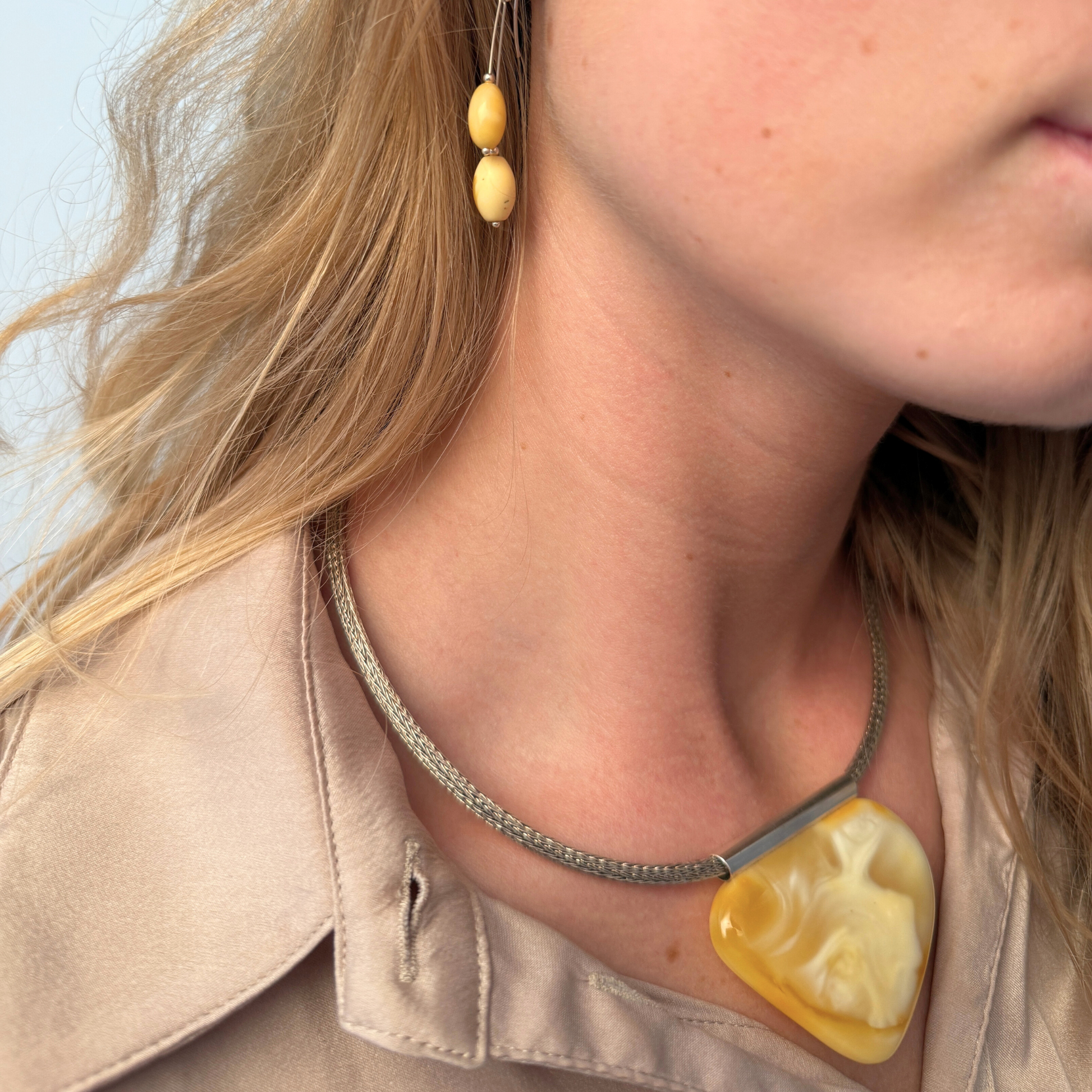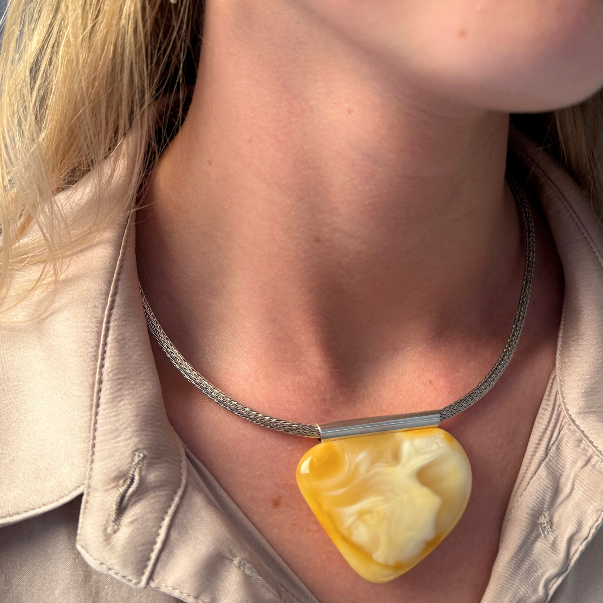 The pendant is fitted with a handcrafted sterling silver tube bail, custom-made in our workshop in Sønderlev. The clean, sculptural silver detail frames the amber naturally, letting its warmth and unique patterns take center stage.