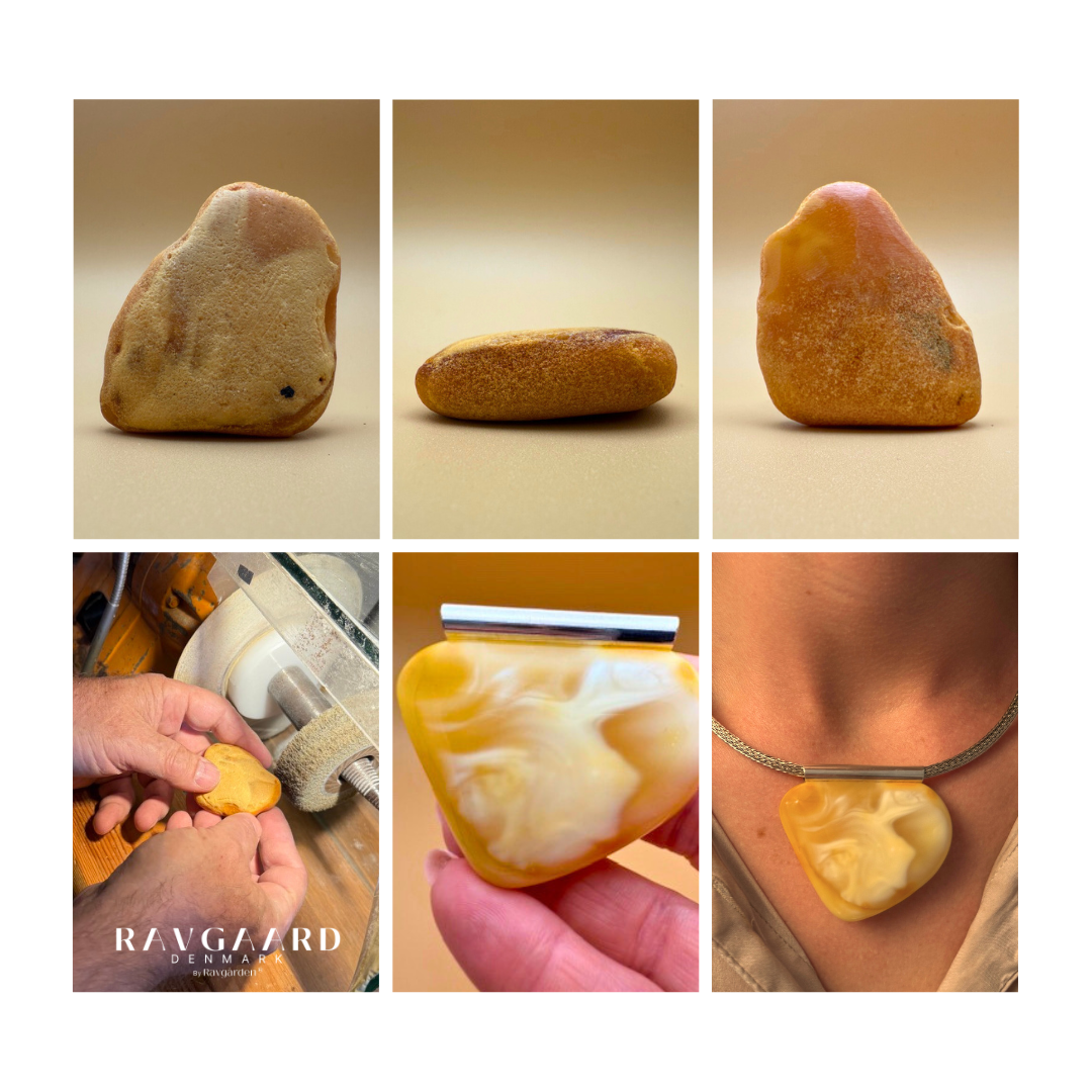 Every step of the process — from shaping and polishing the raw amber to finishing the final piece — is done by hand with care. You can follow this transformation in the accompanying images, showing the journey from raw amber to finished pendant.