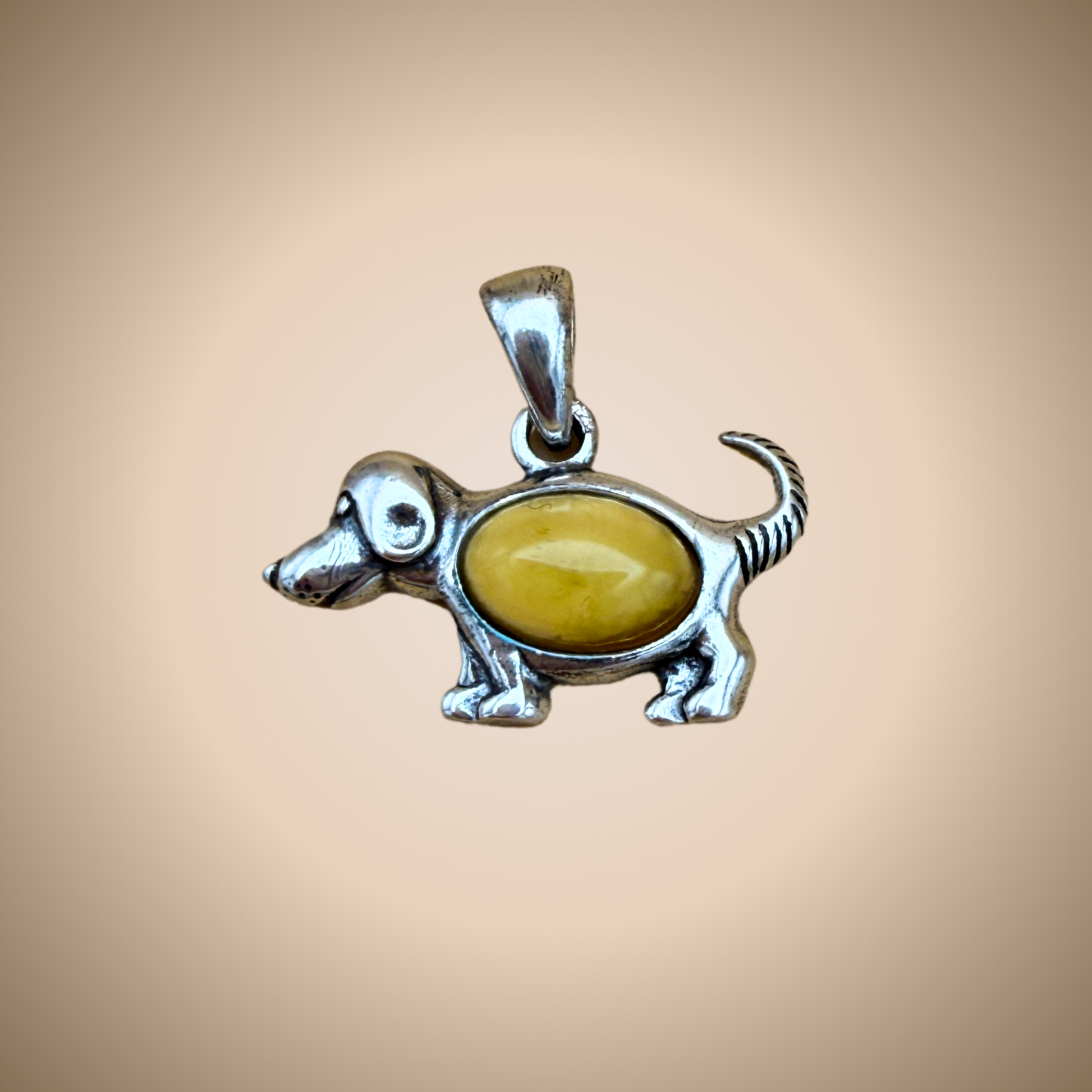 Available in either classic cognac or milky yellow tones, the amber brings a natural warmth and glow to this sweet and quirky piece. Whether you're a dog lover, a dachshund devotee, or simply drawn to expressive details, this pendant is made to delight.