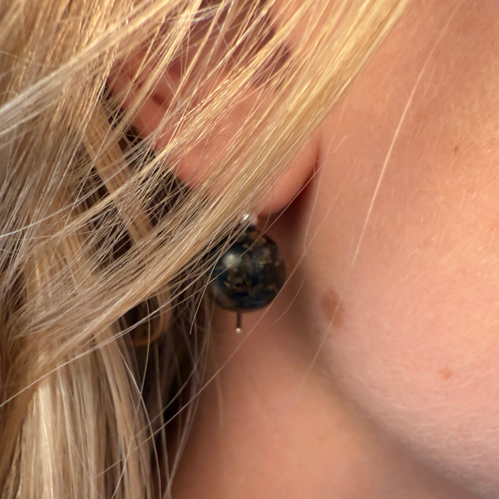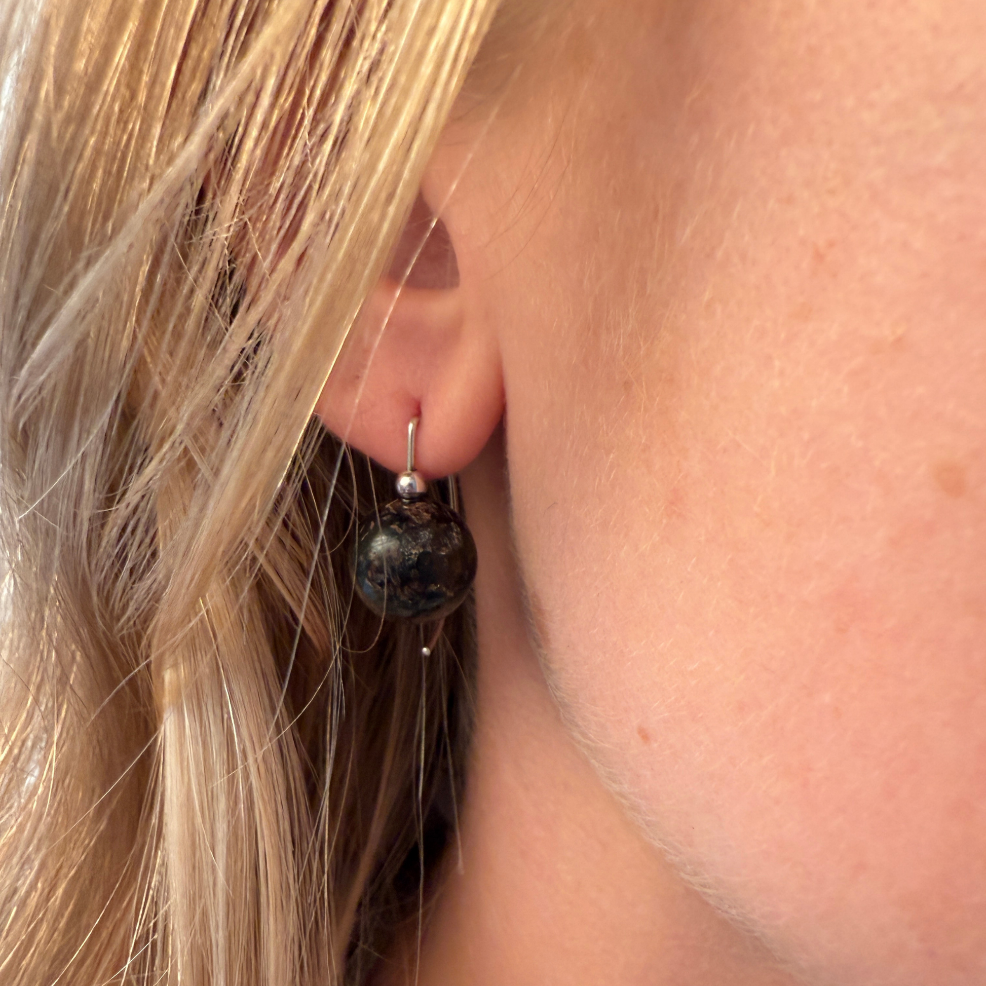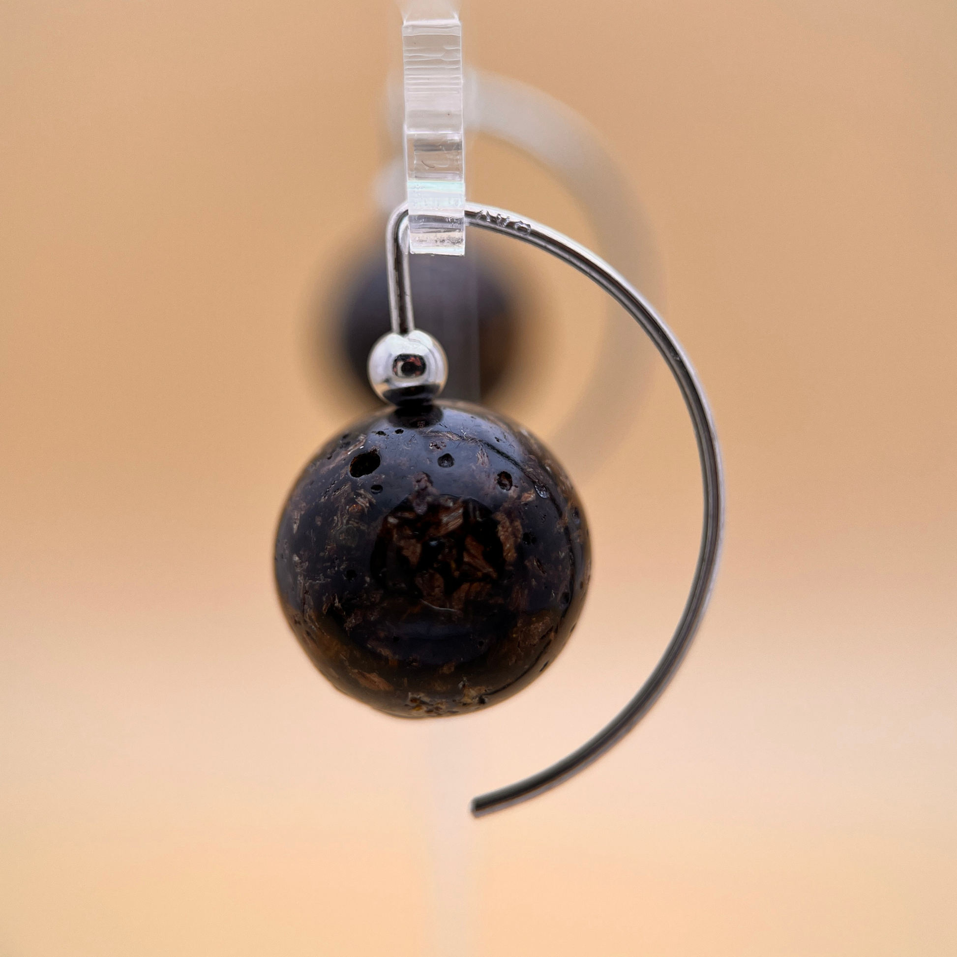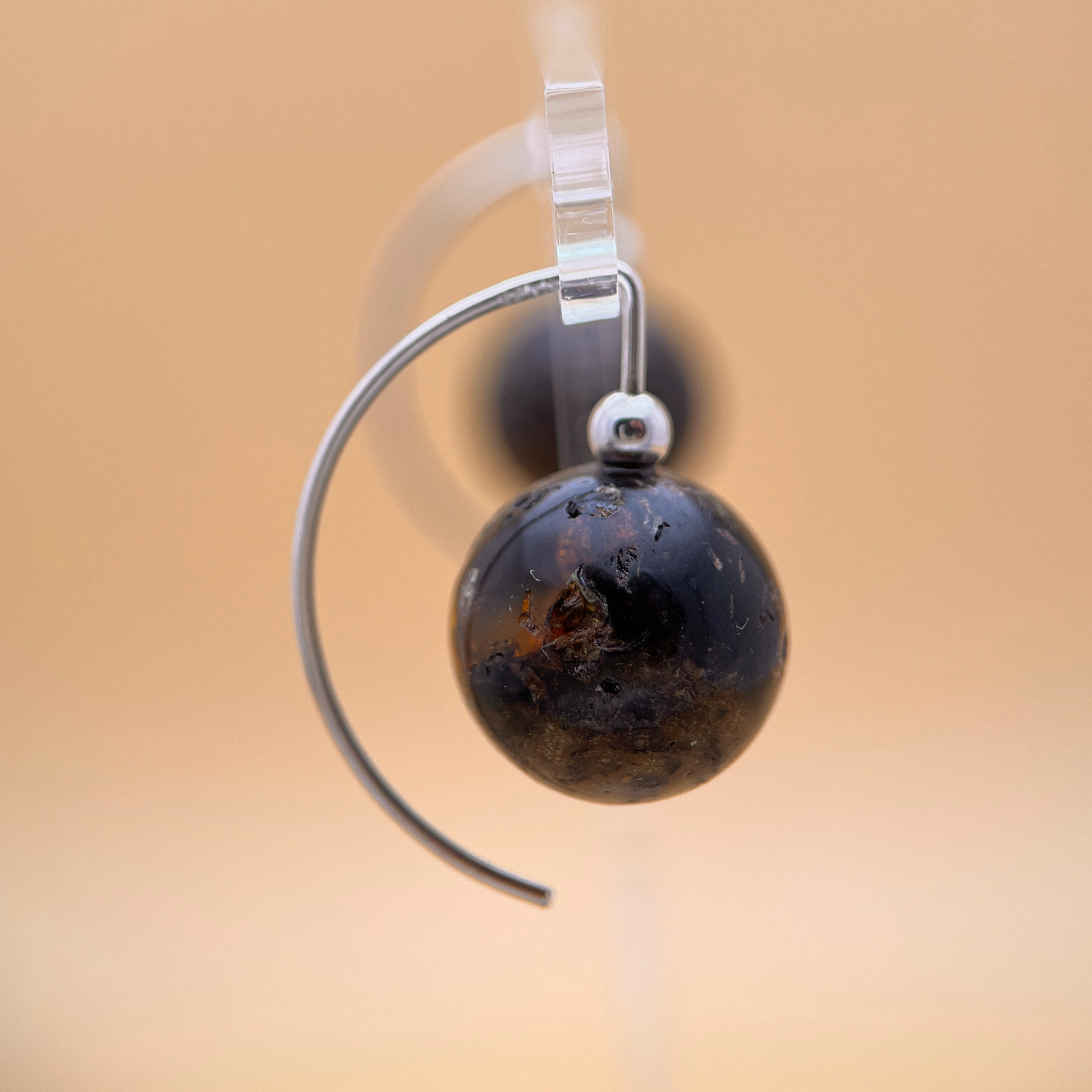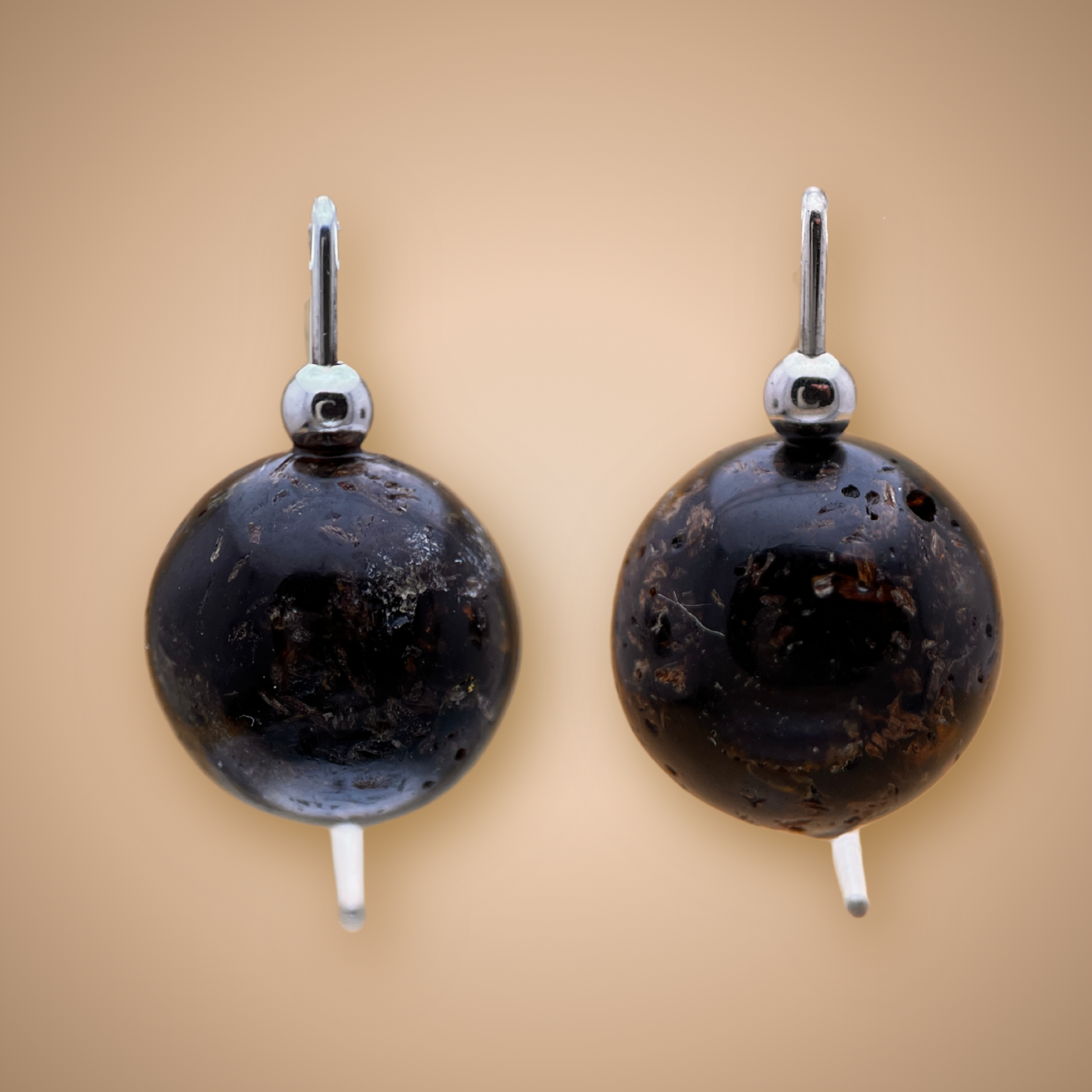 These elegant amber earrings have been part of our collection for many years, crafted in various versions – always with the same lightness, balance, and timeless appeal. This particular design features a smooth 12 mm dark moss green amber bead, accented with a 3 mm silver bead, delicately mounted on a fine 0.9 mm sterling silver wire.