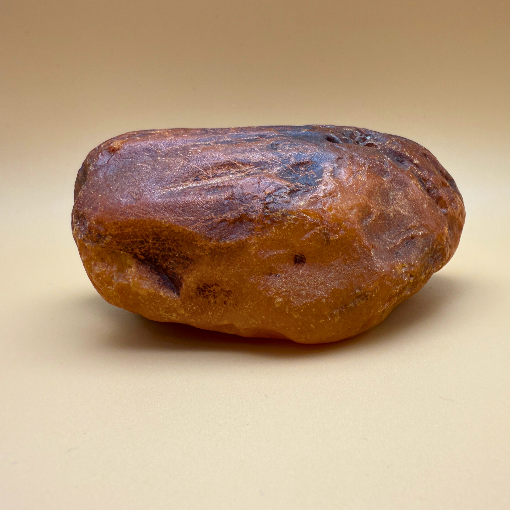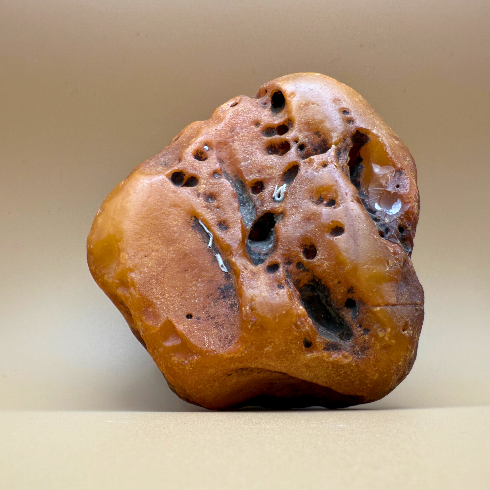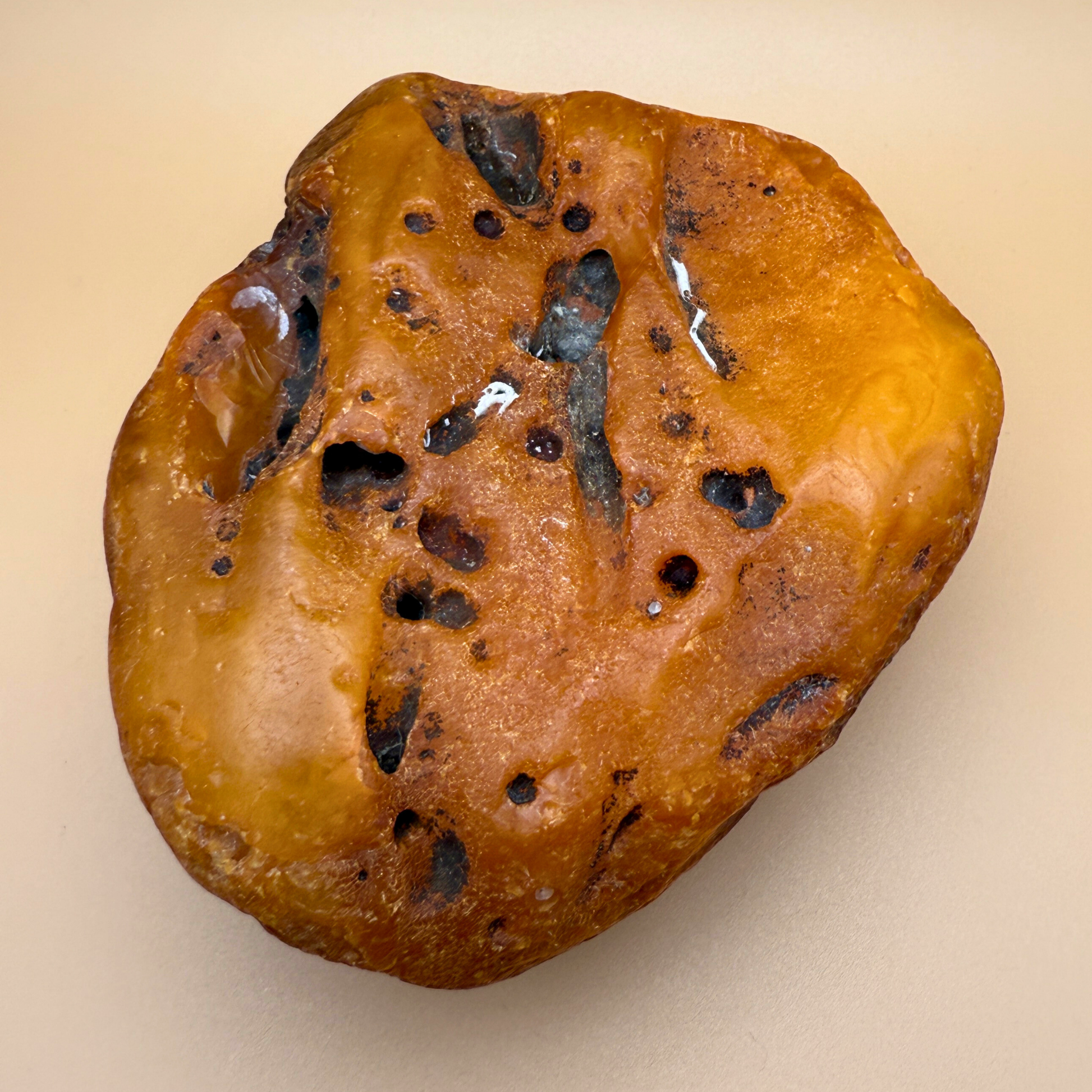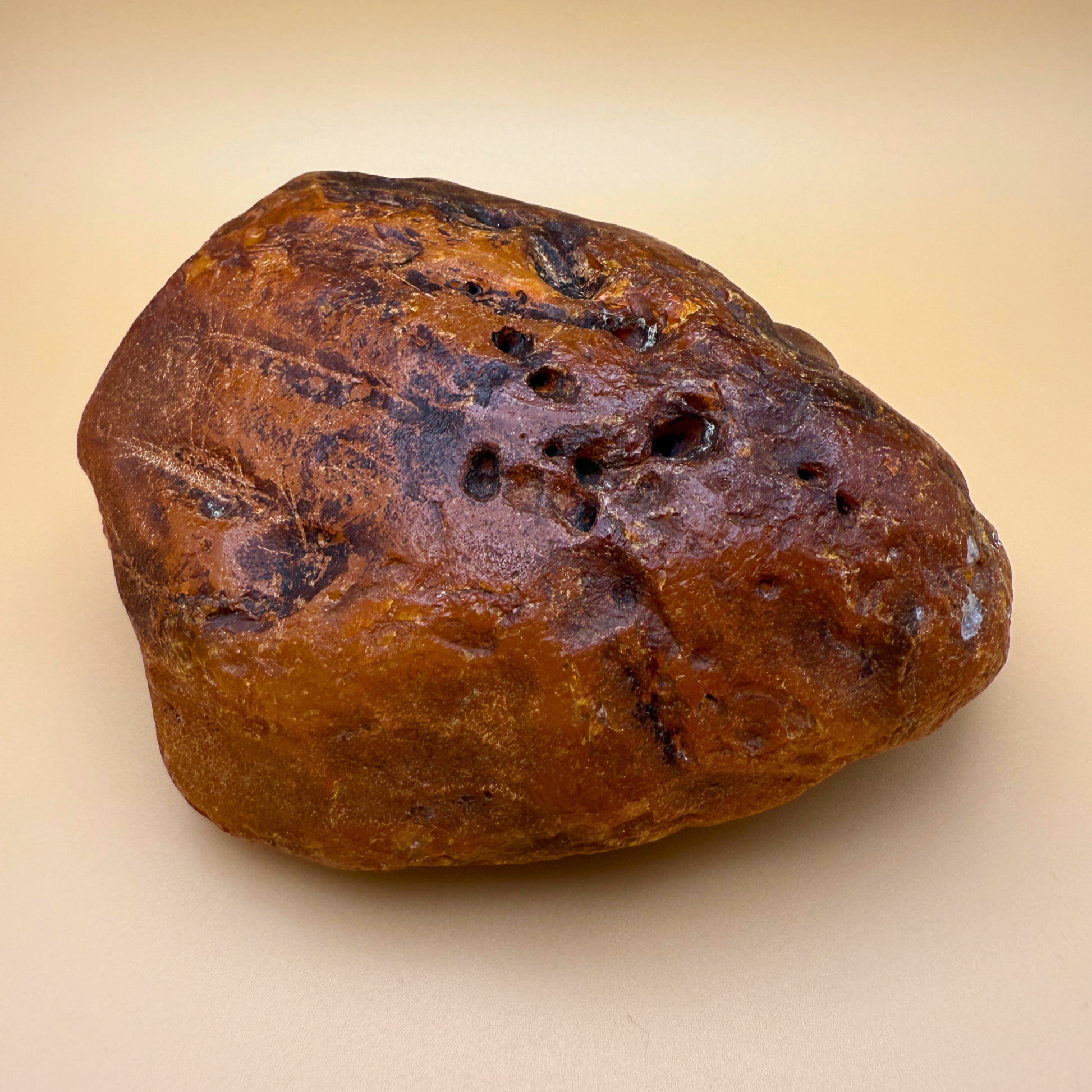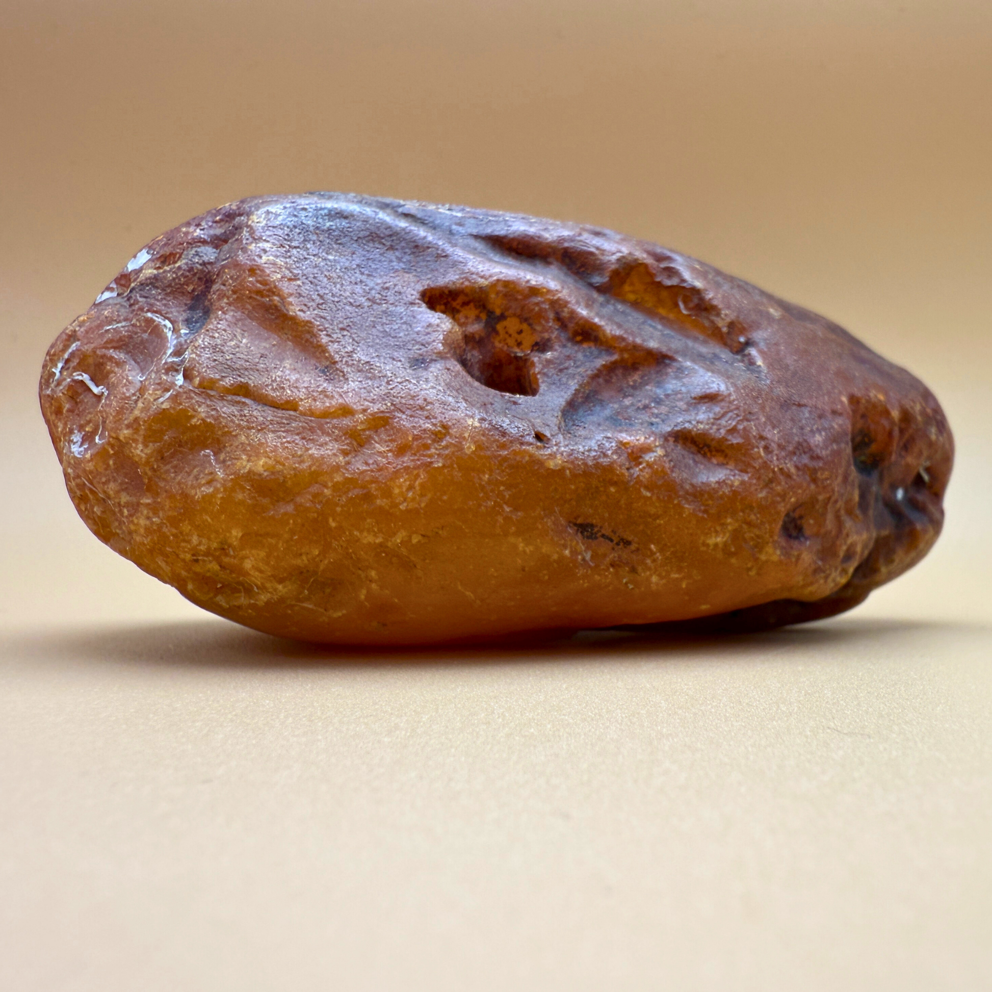 This large, 383g raw amber was fished from Danish waters and holds the marks of a long life beneath the sea. Its surface is rich with natural holes, crevices, and a striking tunnel-like cavity – likely the trace of a long-decayed branch that once passed through it.