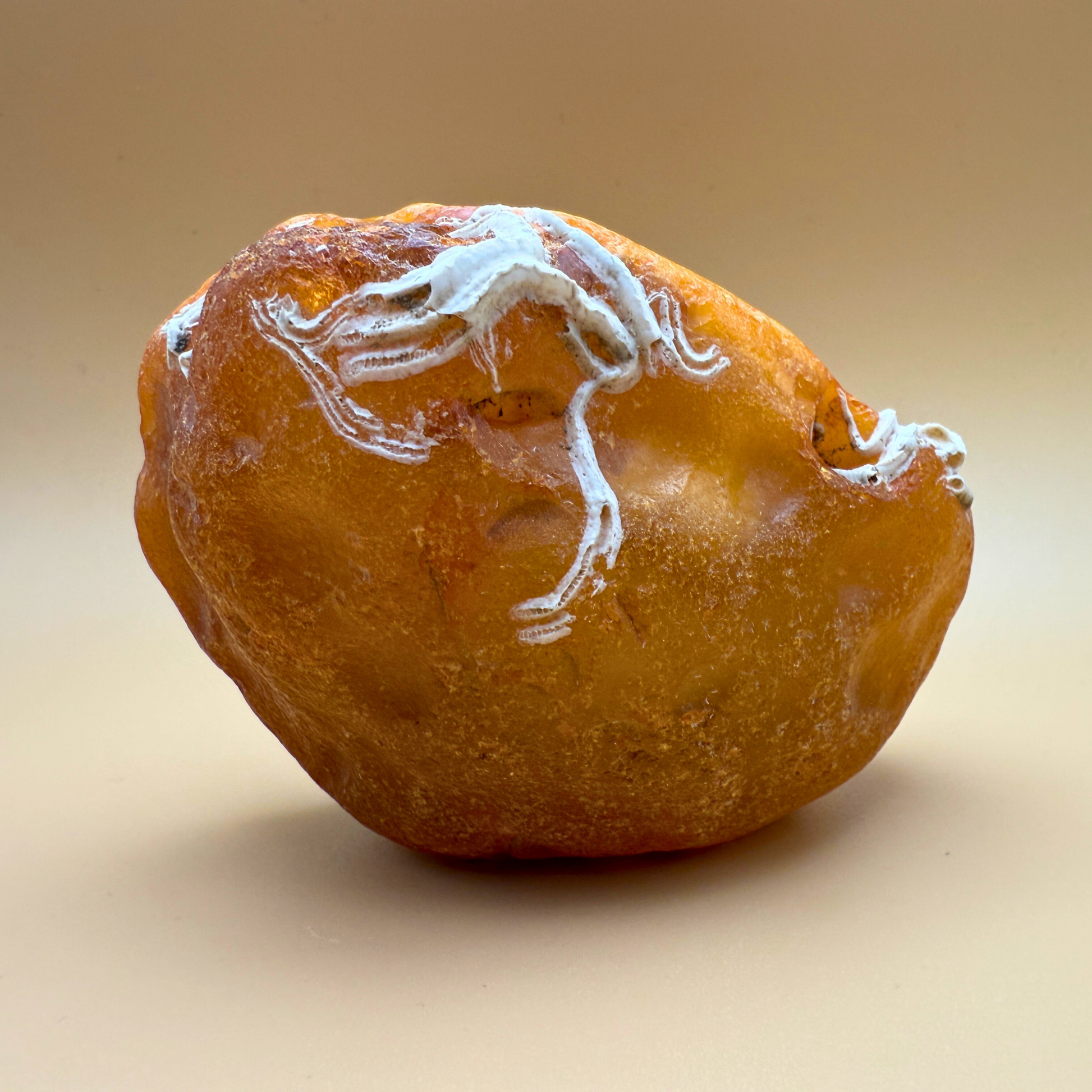 The piece features beautiful traces of calcareous tubeworms (Serpulidae) – small marine creatures that once built delicate, white chalky tubes on the amber while it rested on the seafloor. These rare formations create a striking contrast to the amber’s warmth and add a layer of quiet poetry to the piece.