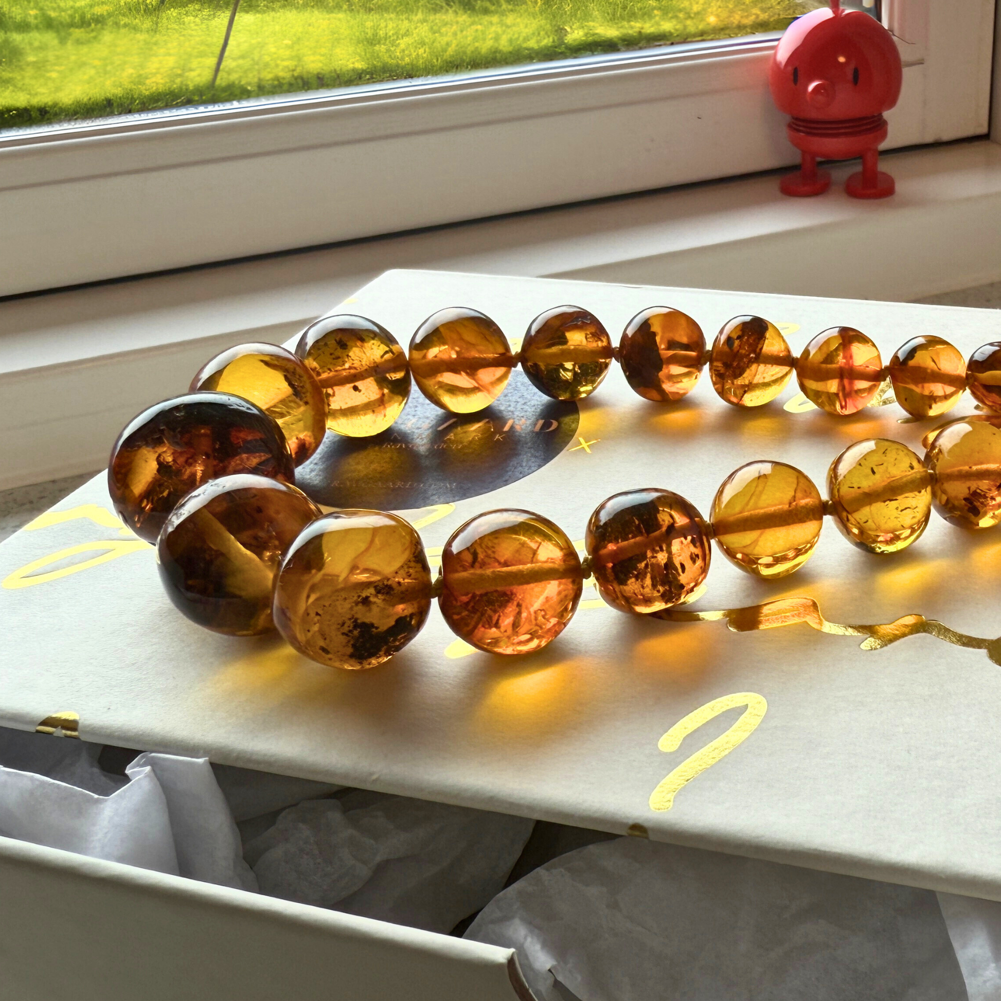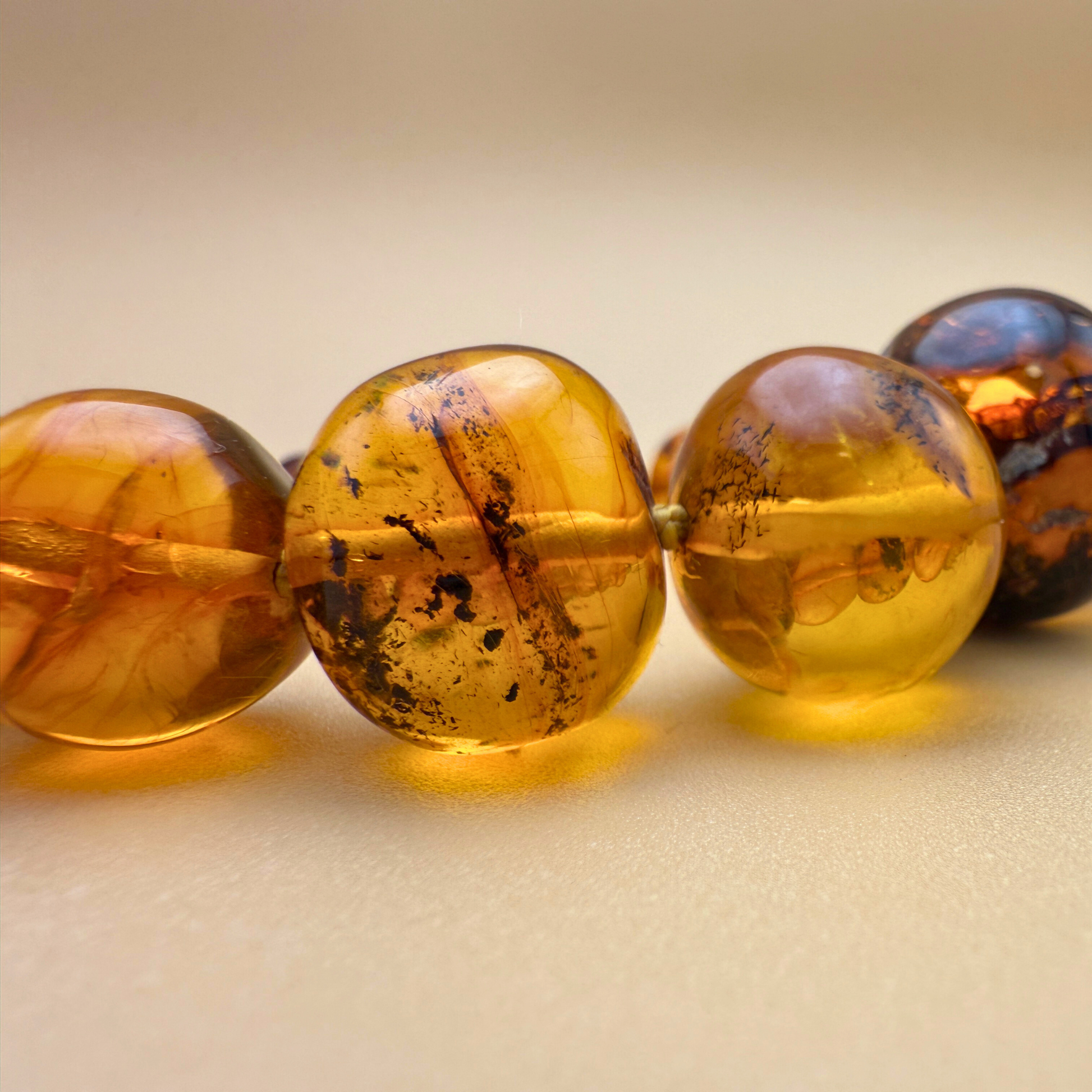 The necklace is strung in a gentle progression, with smaller beads at the neck and larger, sculptural centre beads at the front. Each bead is individually hand-knotted, giving the piece fluid movement, durability and a refined finish. In sunlight, the amber glows with extraordinary depth – full of life, clarity and organic patterns that shift as you move.